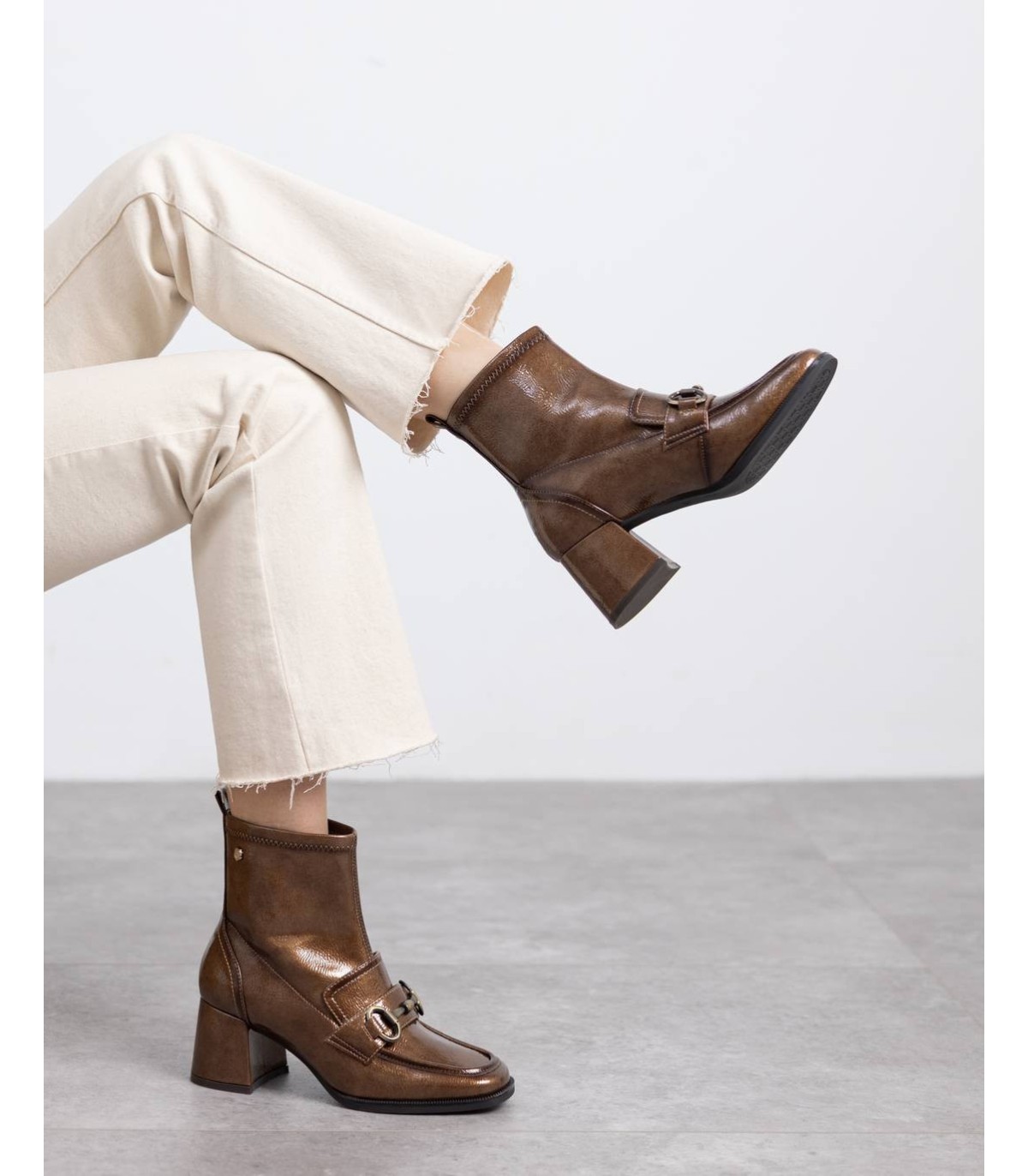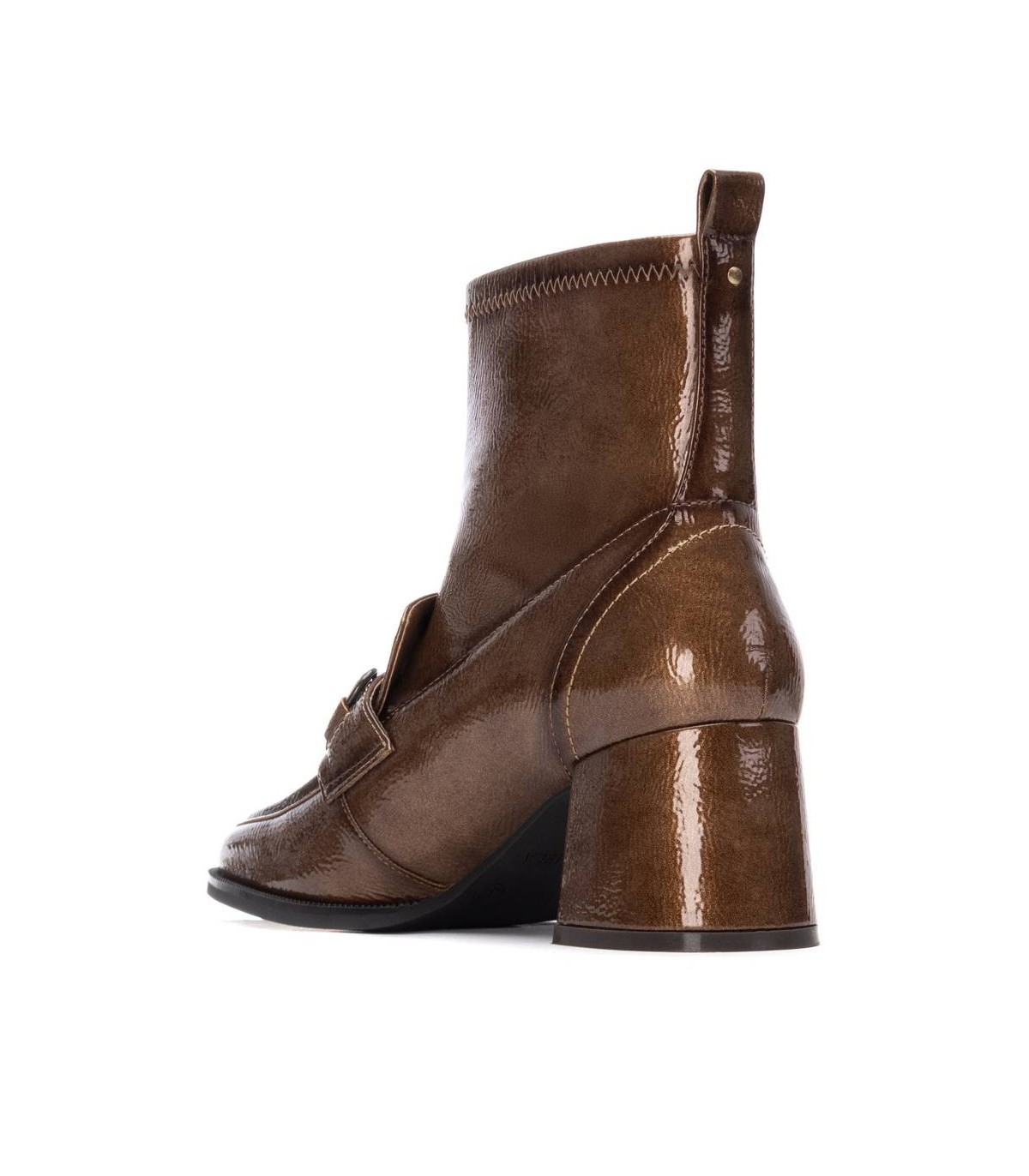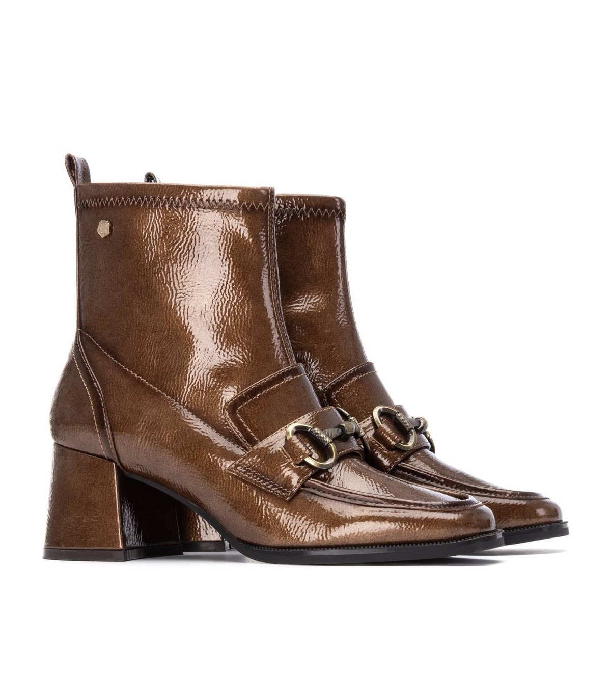 Botín de mujer, de la marca Carmela. Fabricado en charol. Cierre lateral con cremallera. Antifaz en el frente con cadena deportiva. Plantilla extraíble.