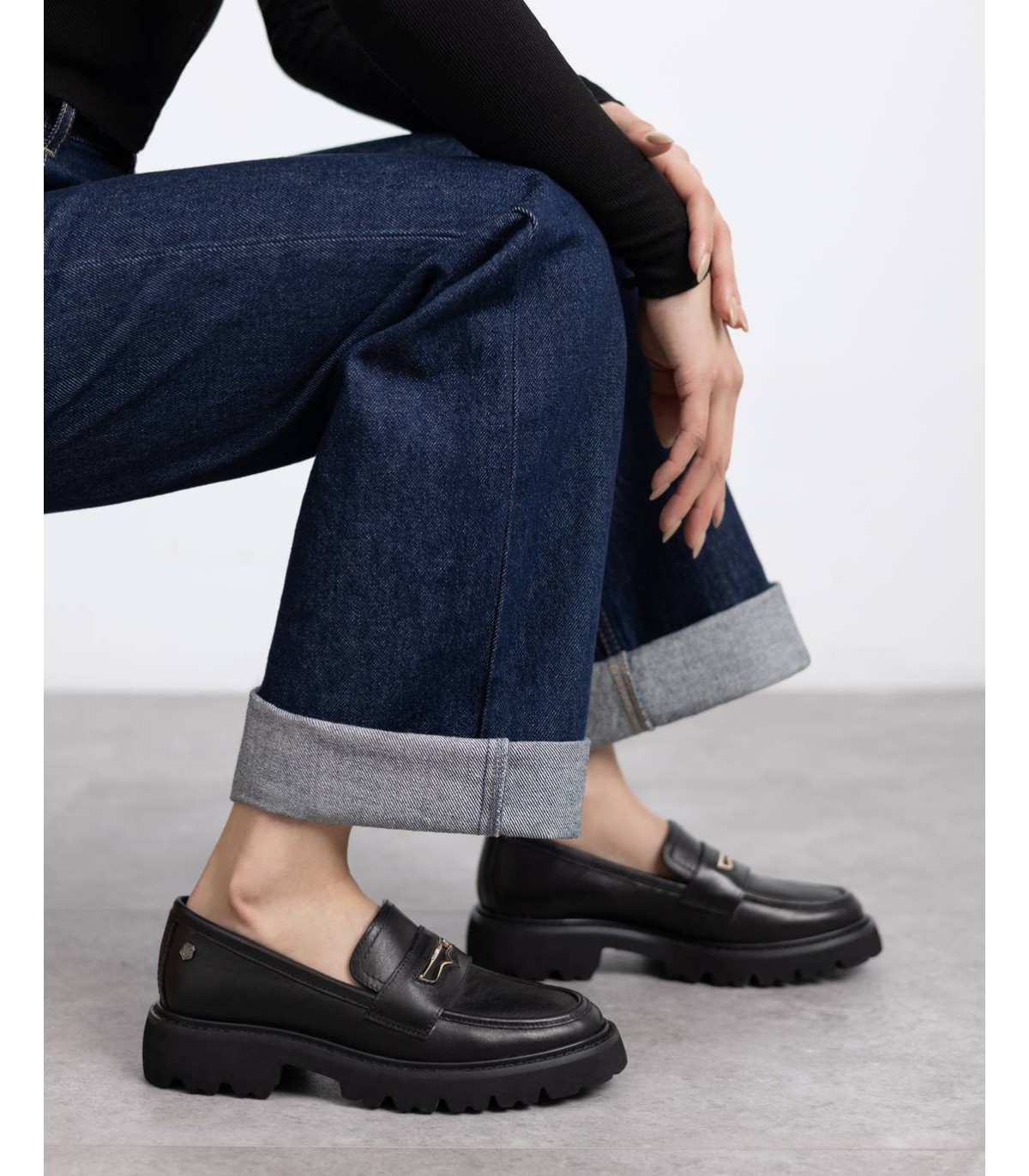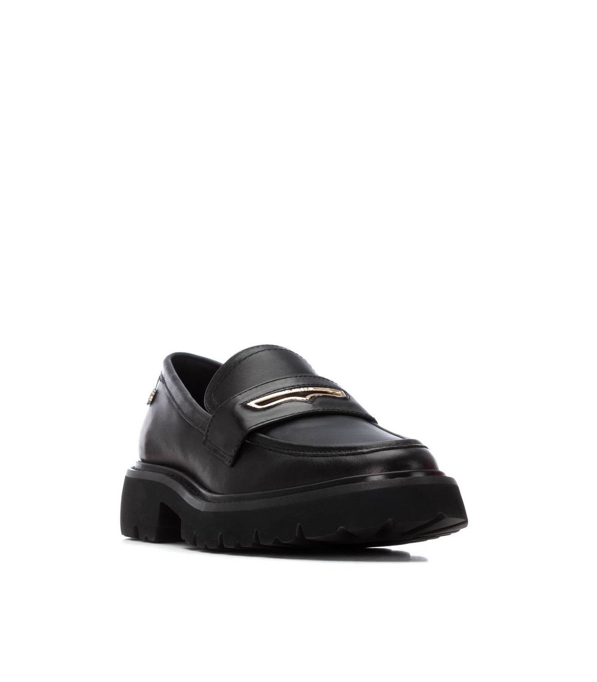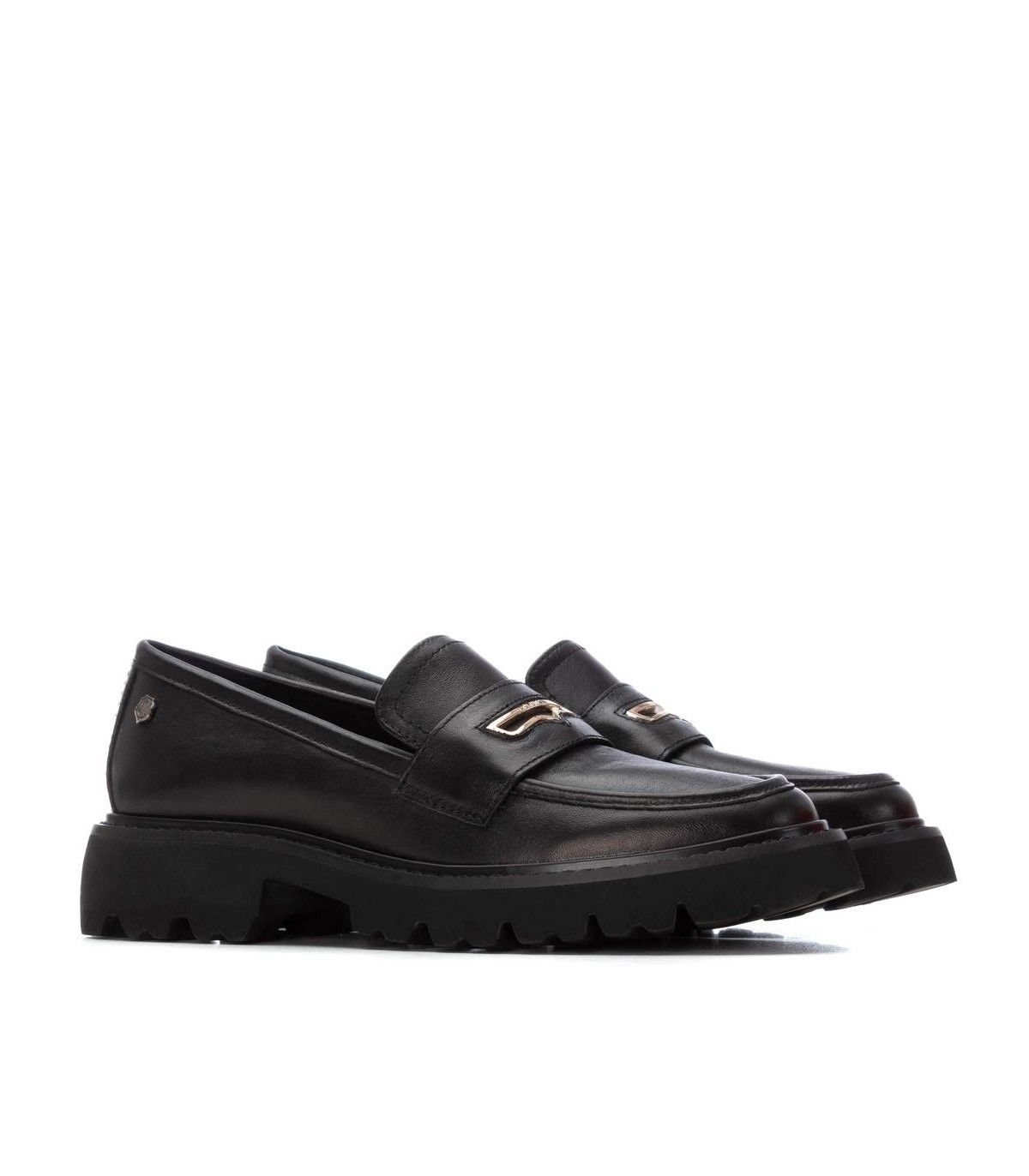 mocasin de mujer, de la marca Carmela. Fabricado con material sintético que imita la piel. Antifaz al frente con decorado efecto metalizado. Suela de goma gruesa antideslizante. Plantilla extraíble.