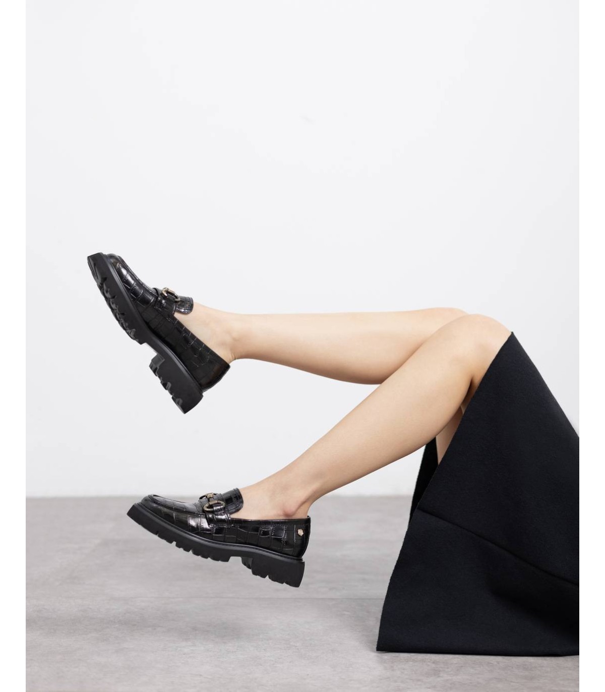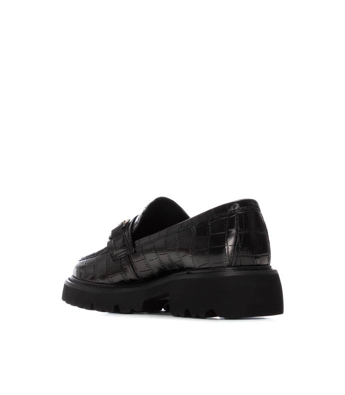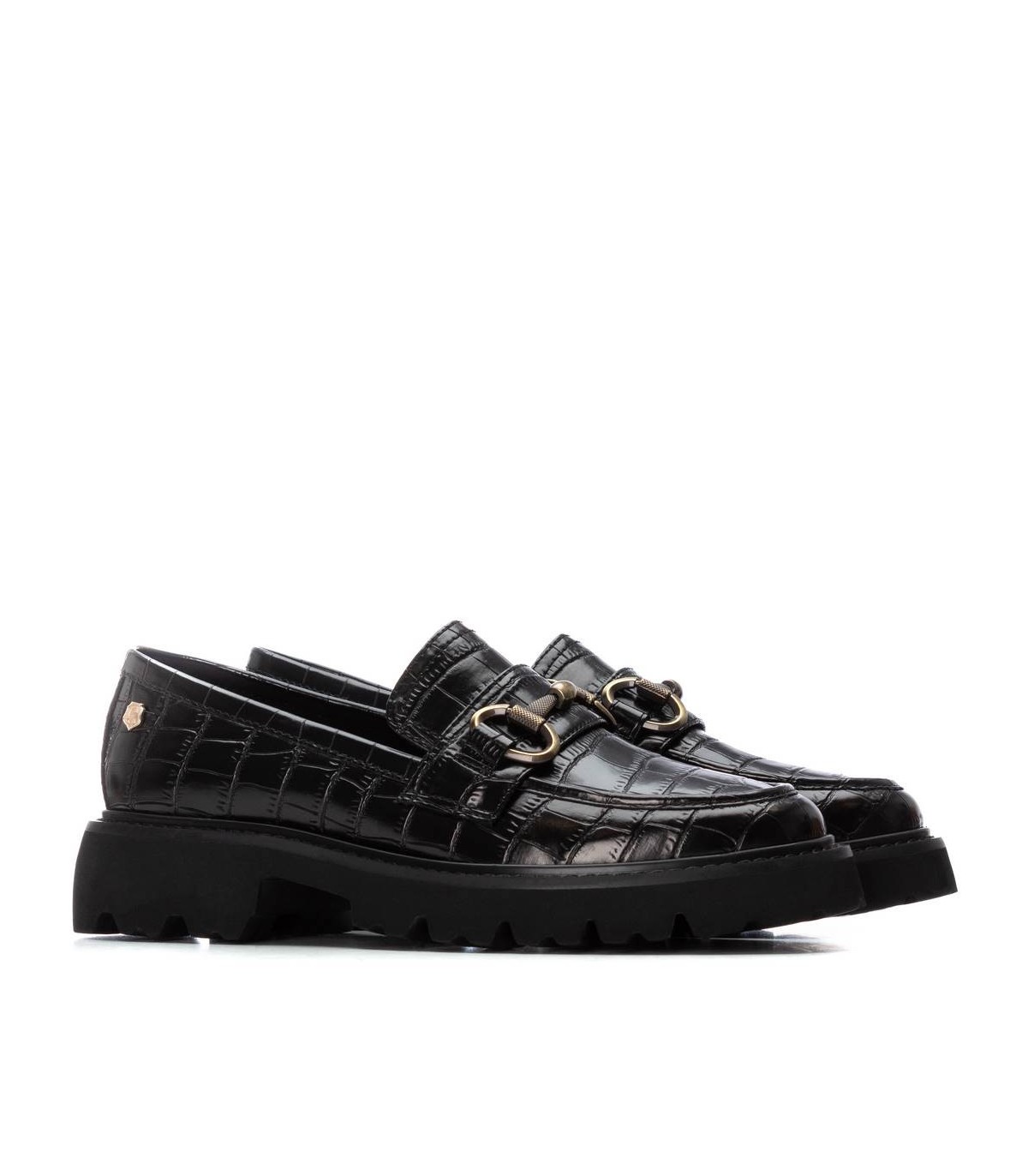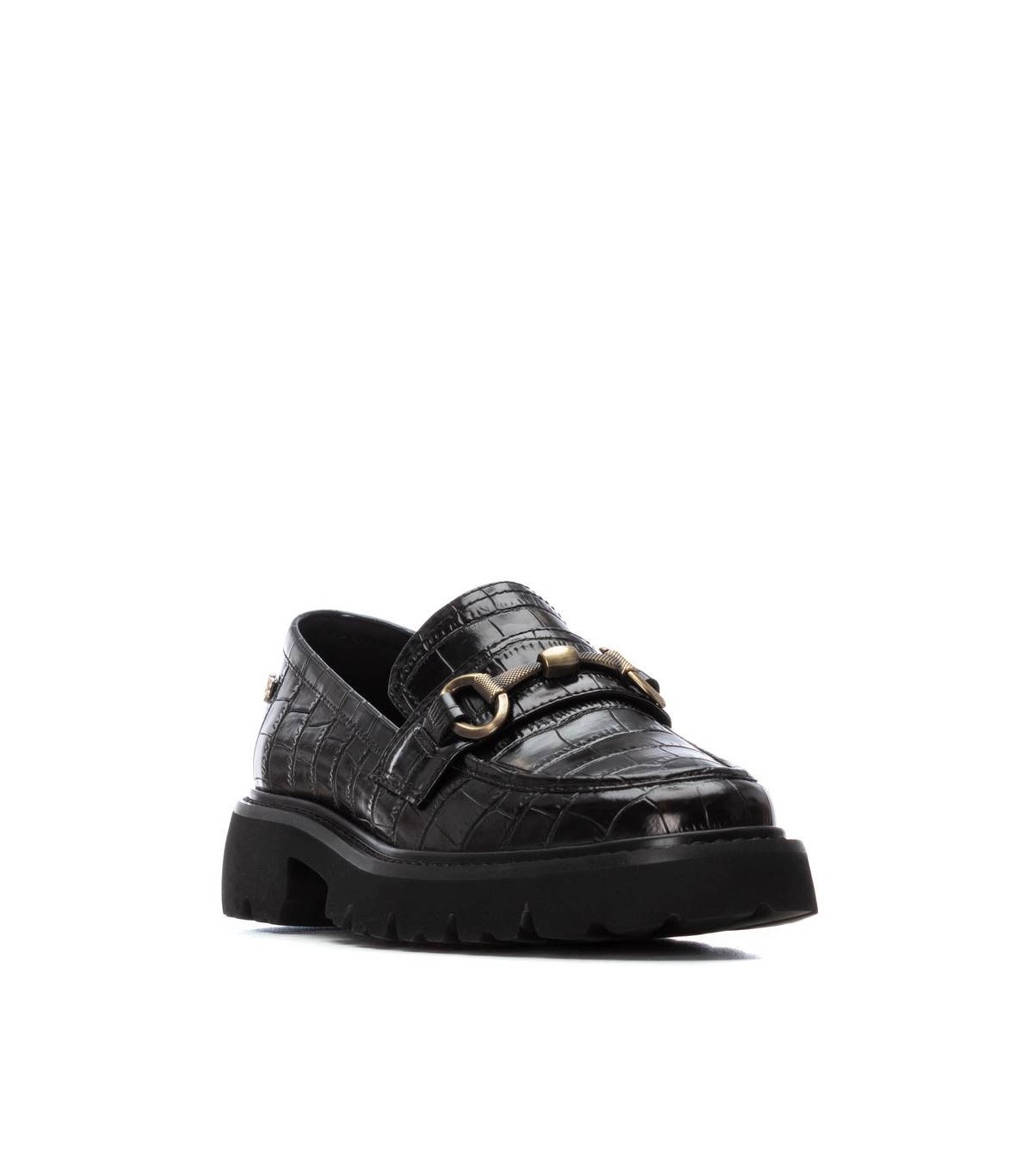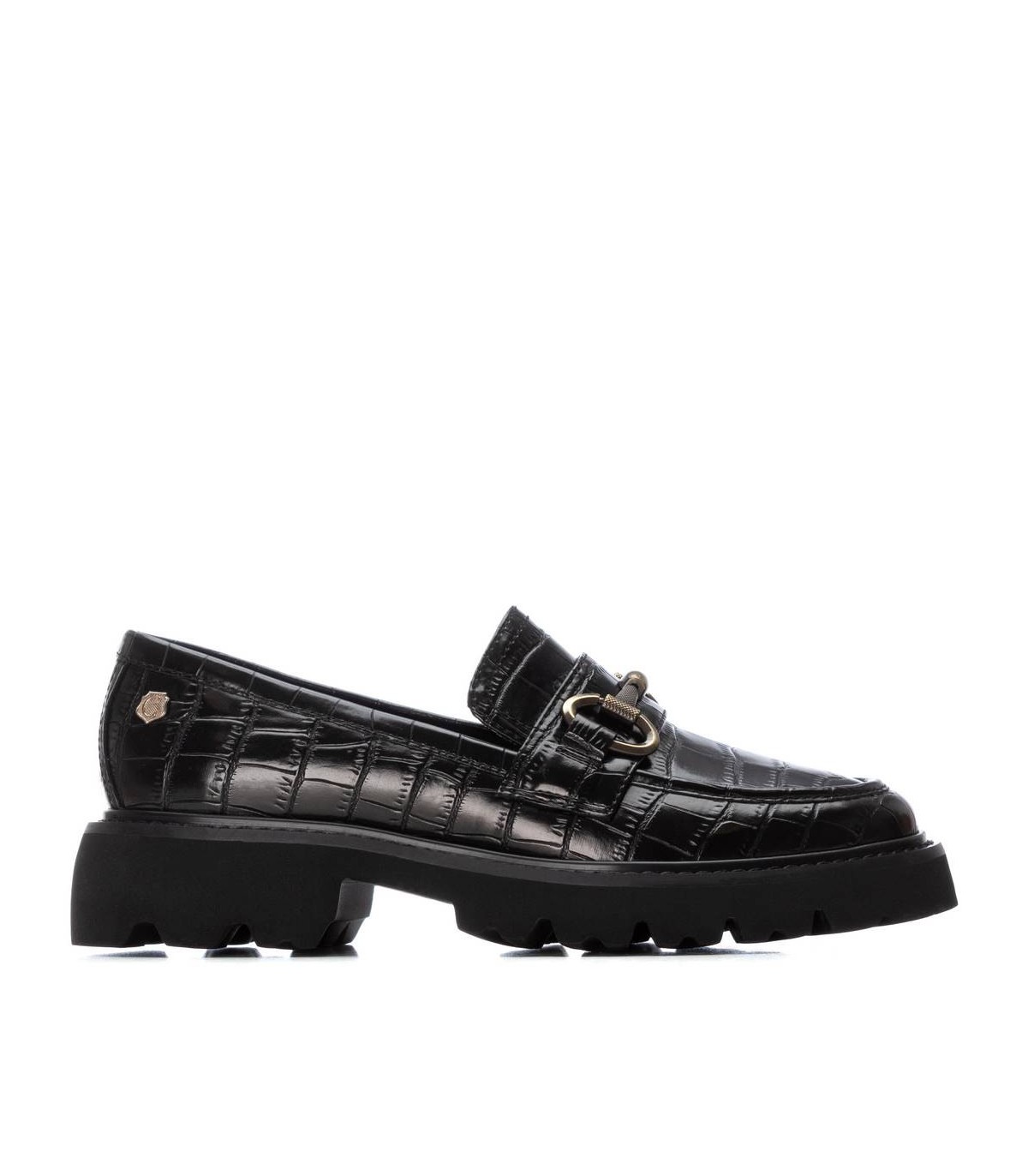 mocasin de mujer, de la marca Carmela. Fabricado con material sintético que imita la piel con bonito grabado en coco. Antifaz en el frente con cadena decorativa. Suela gorda de goma antideslizante. Plantilla extraíble.