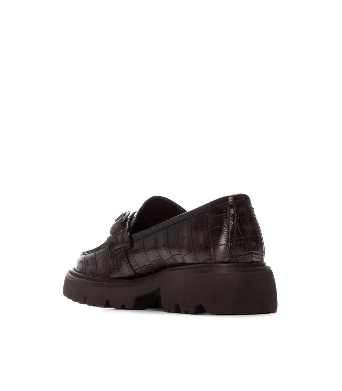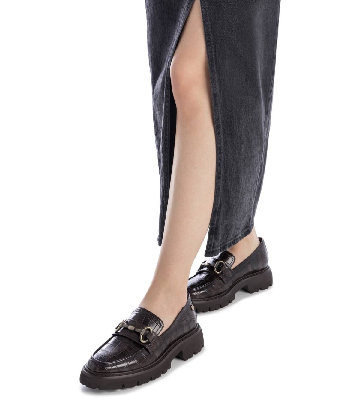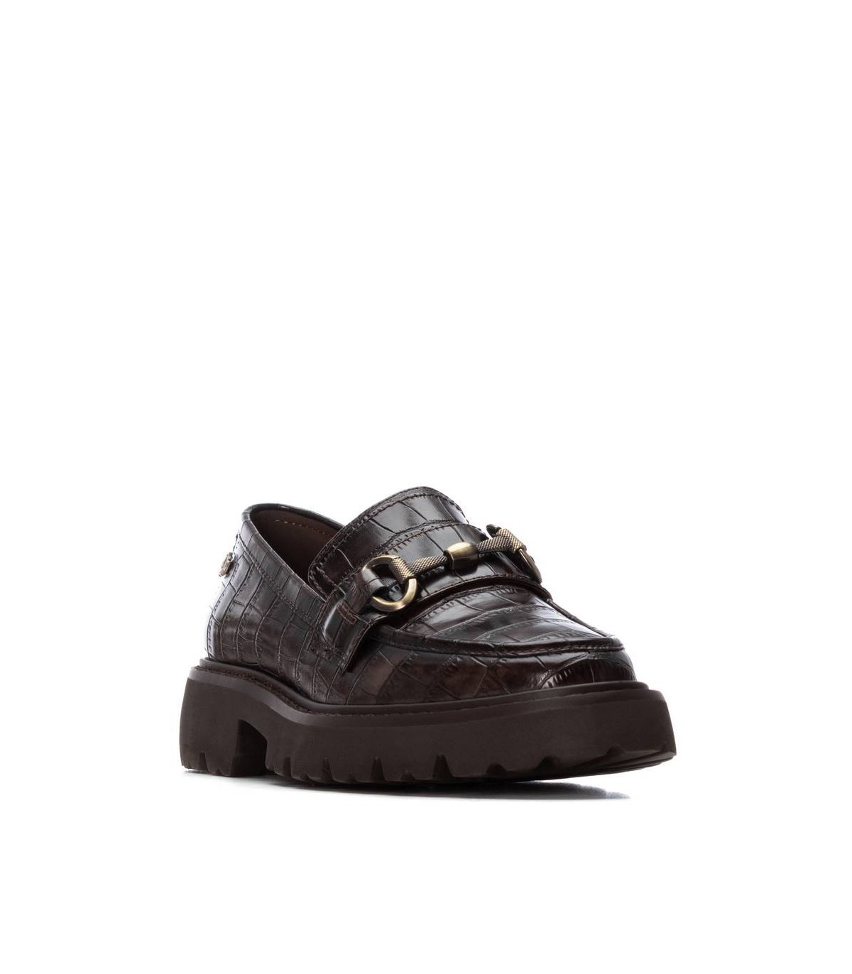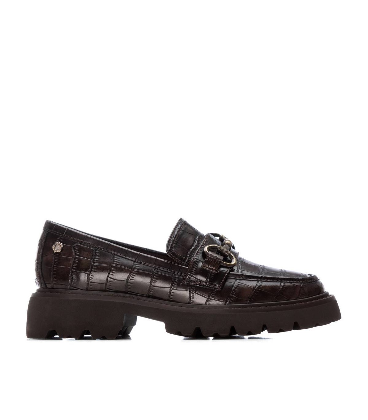 mocasin de mujer, de la marca Carmela. Fabricado con material sintético que imita la piel con bonito grabado en coco. Antifaz en el frente con cadena decorativa. Suela gorda de goma antideslizante. Plantilla extraíble.