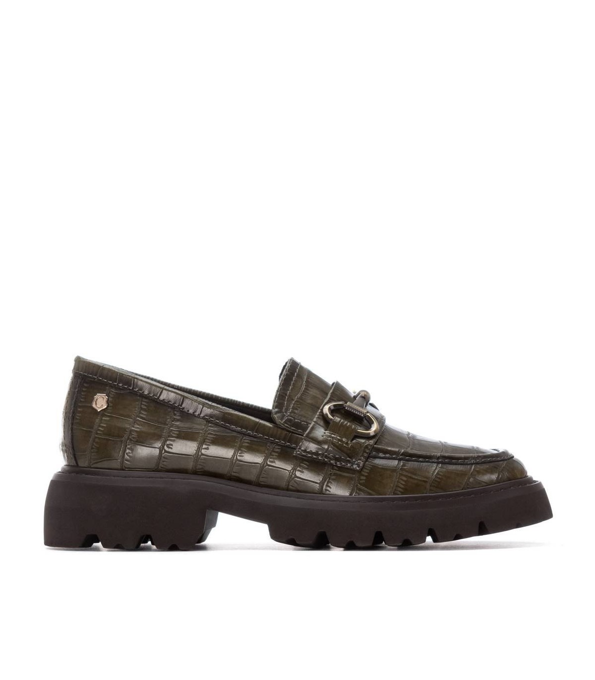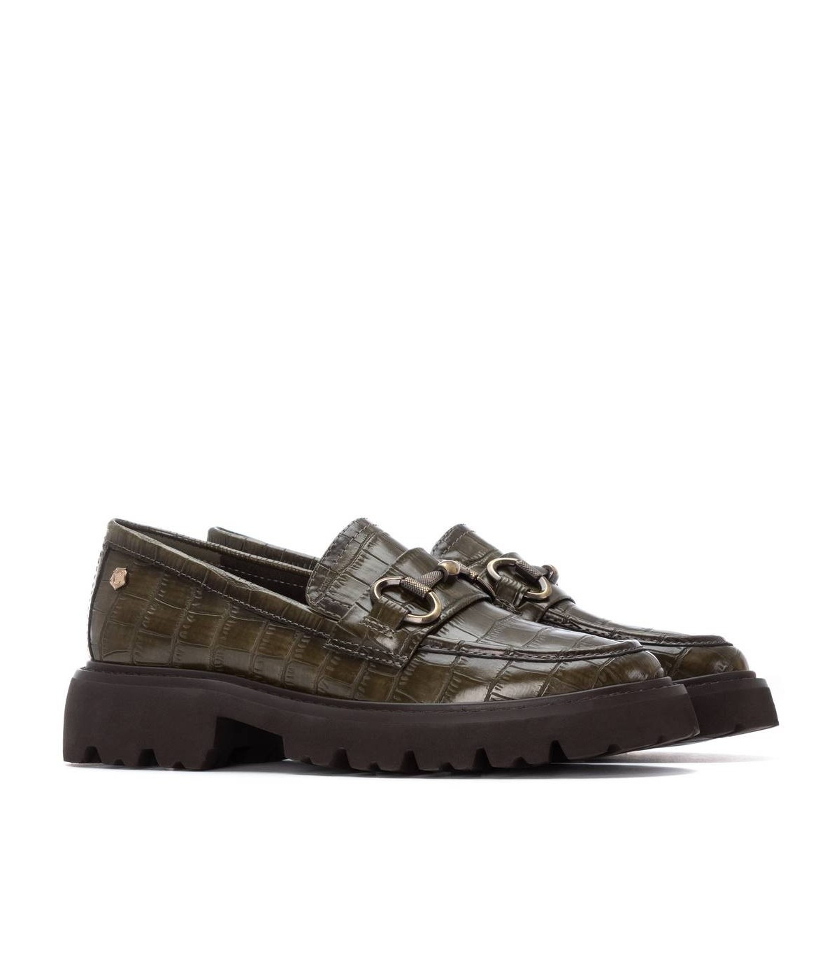 mocasin de mujer, de la marca Carmela. Fabricado con material sintético que imita la piel con bonito grabado en coco. Antifaz en el frente con cadena decorativa. Suela gorda de goma antideslizante. Plantilla extraíble.