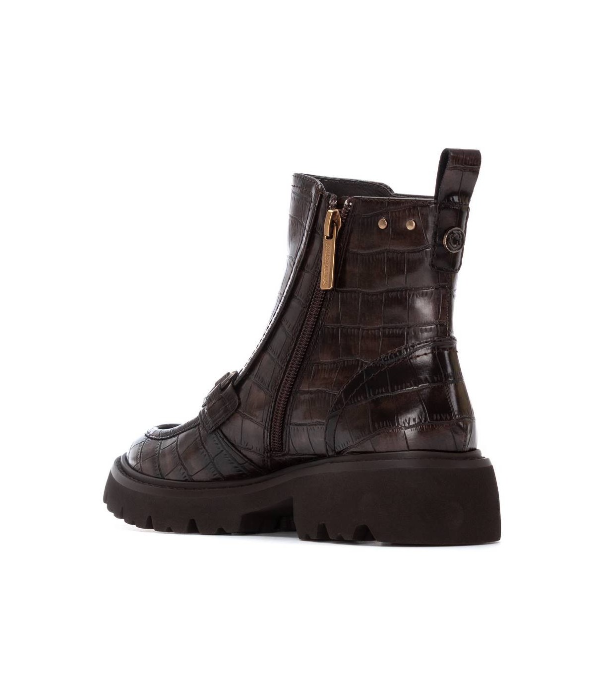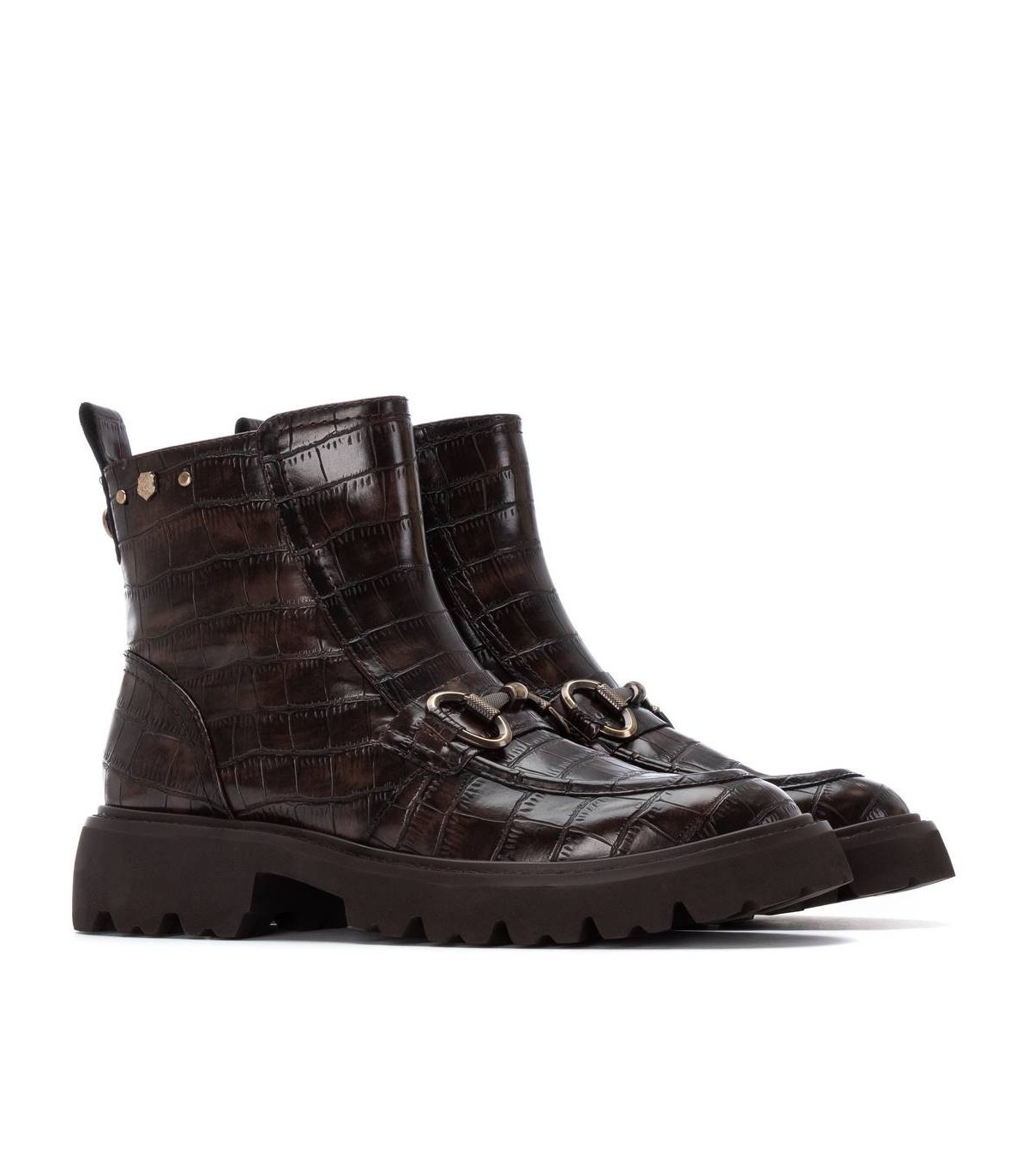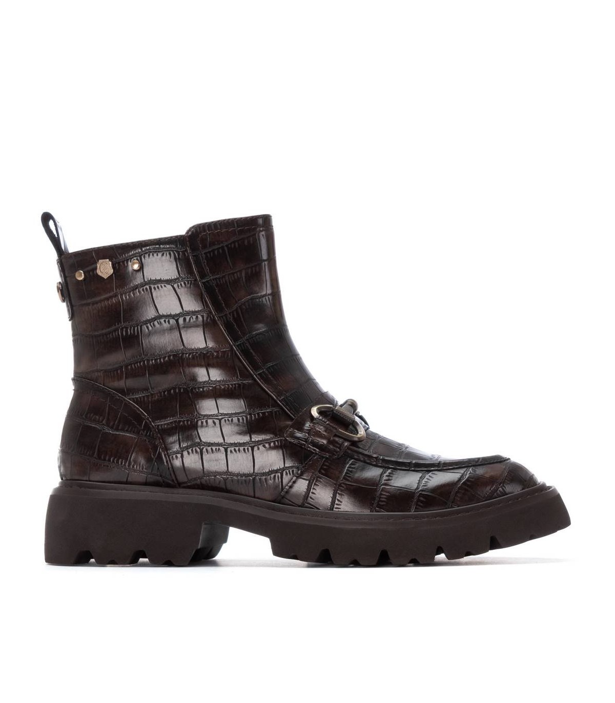 Botín de mujer, de la marca Carmela. Fabricado en material que imita la piel con bonito grabado en coco. Detalles laterales con tachuelas. Detalle con cadena decorativa en el frente. Tirador trasero para facilitar la puesta. Suela dentada de goma antideslizante. Plantilla extraíble.