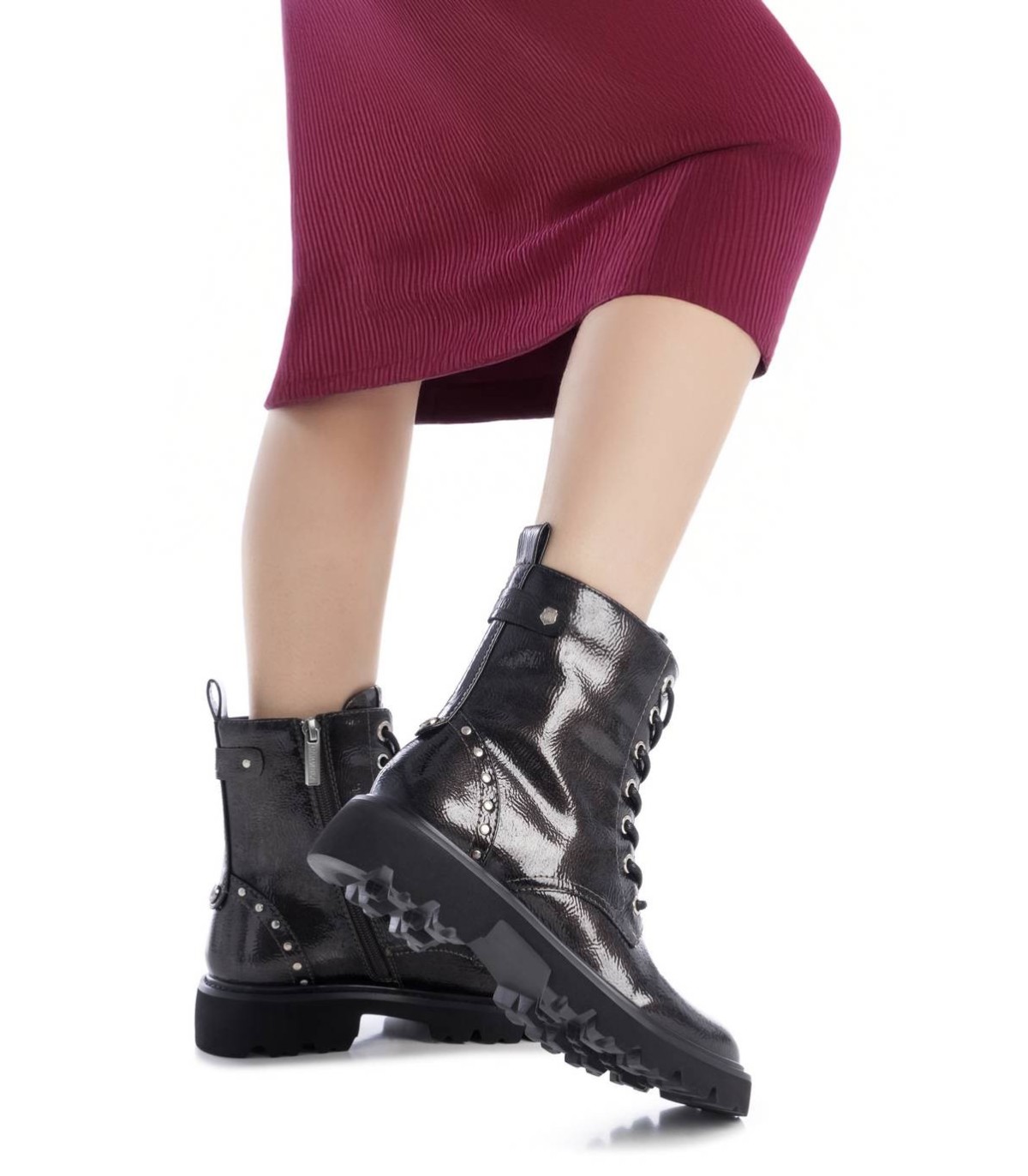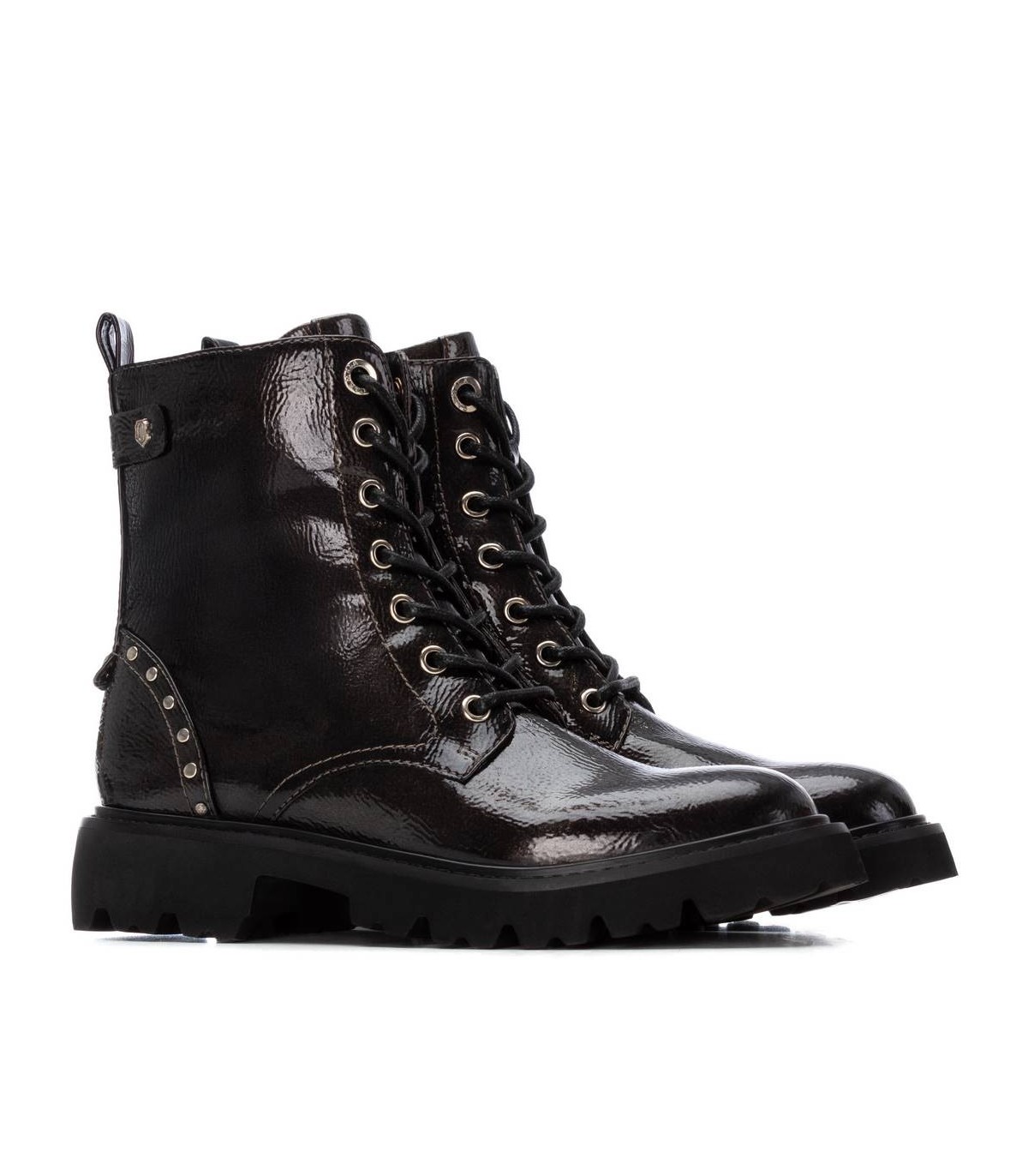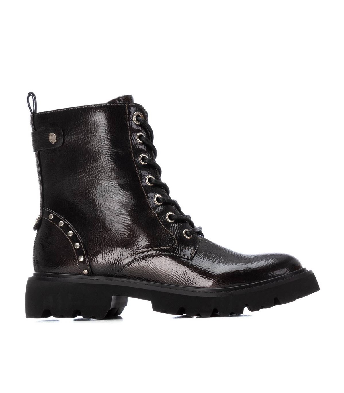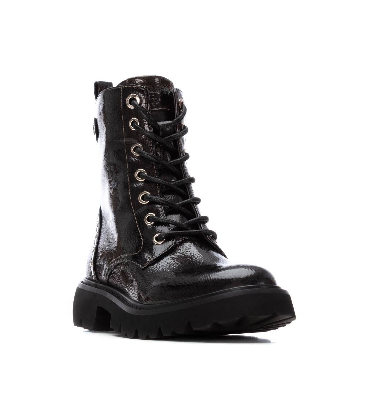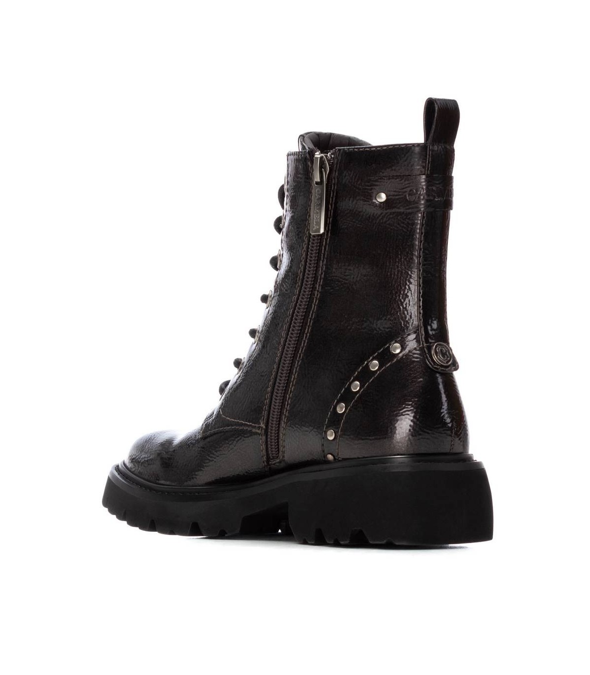 Botín de mujer, de la marca Carmela. Fabricado en charol. Cierre mediante cremallera interna y cordones ajustables. Tirador trasero para facilitar la puesta. Suela de goma gruesa antideslizante. Plantilla extraíble.