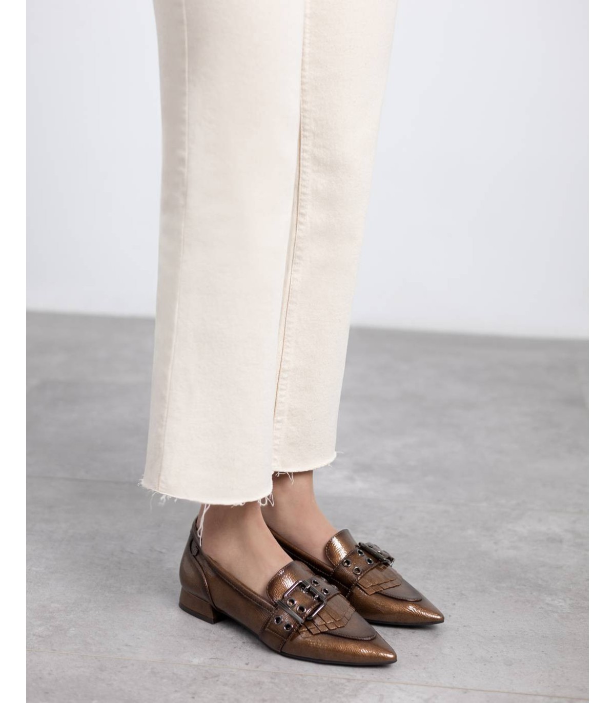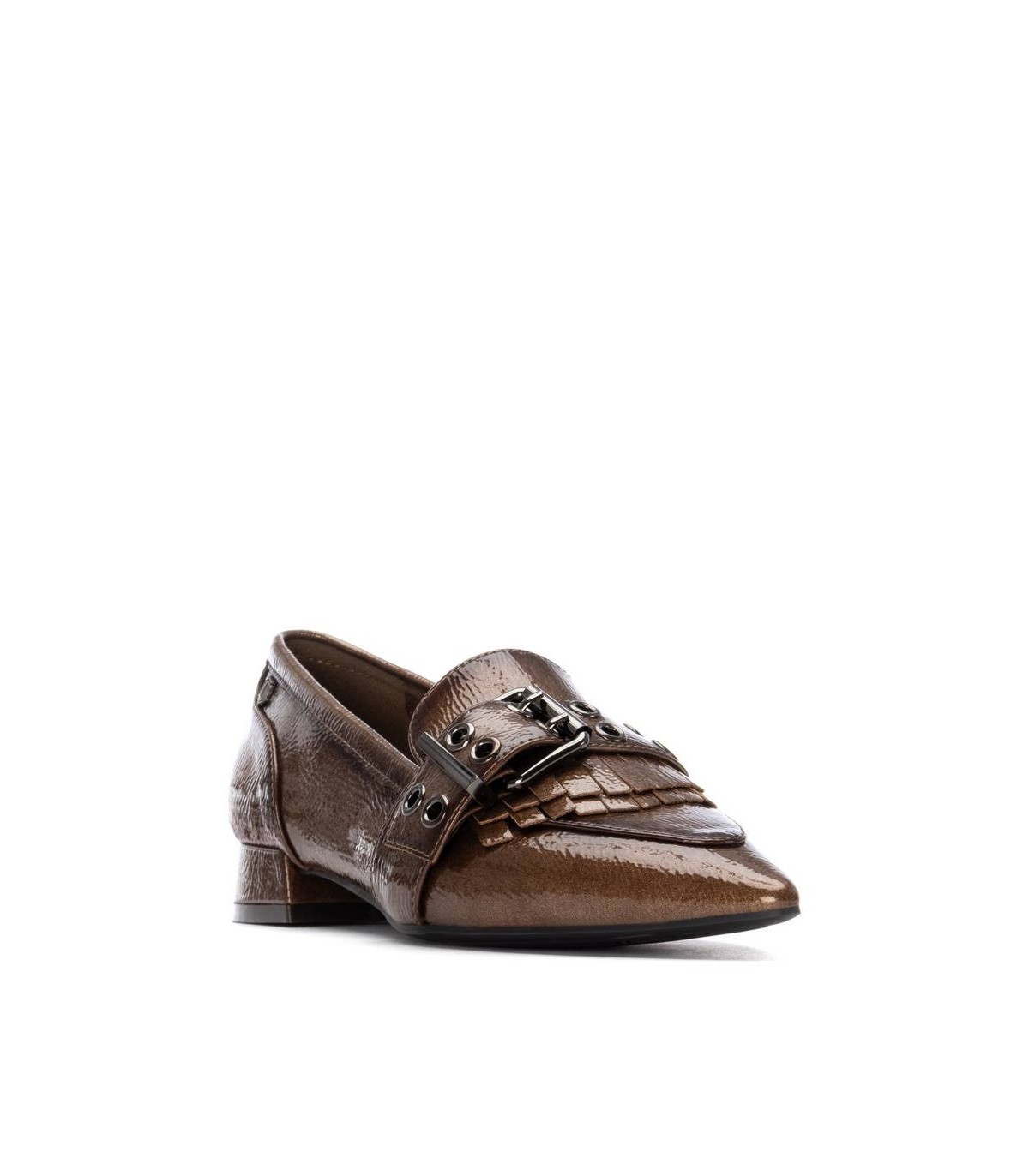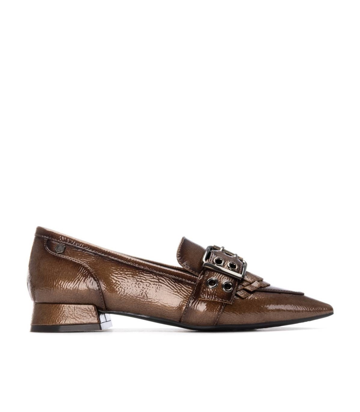 Zapato de mujer, de la marca Carmela. Fabricado en charol. Antifaz al frente con decorado de hebilla y flecos. Cómoda suela plana antideslizante. Plantilla extraíble.
