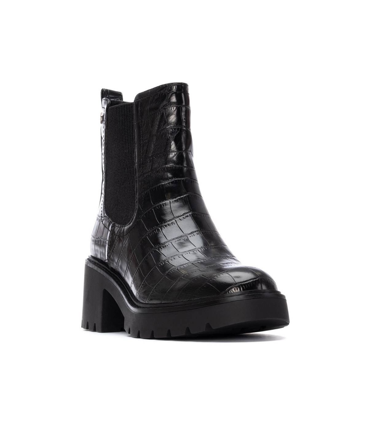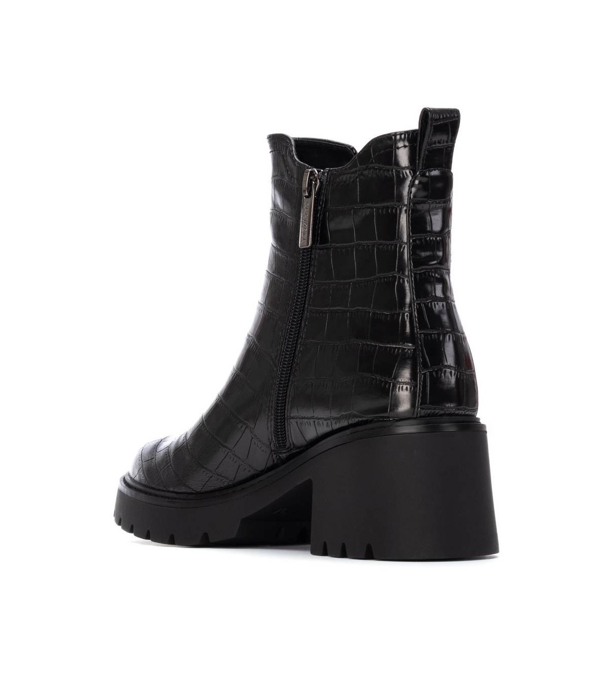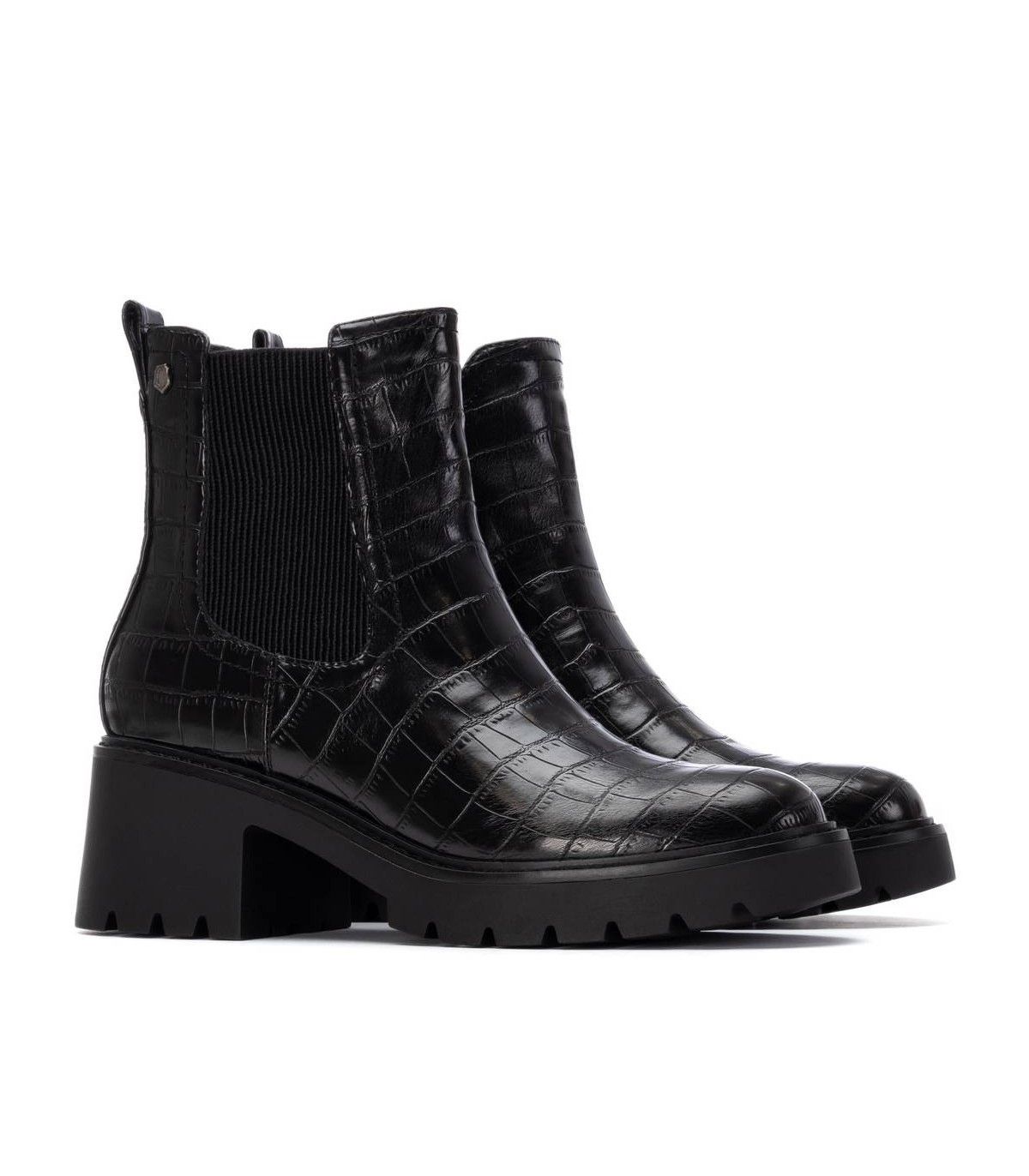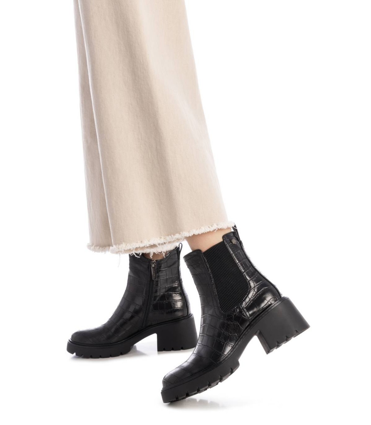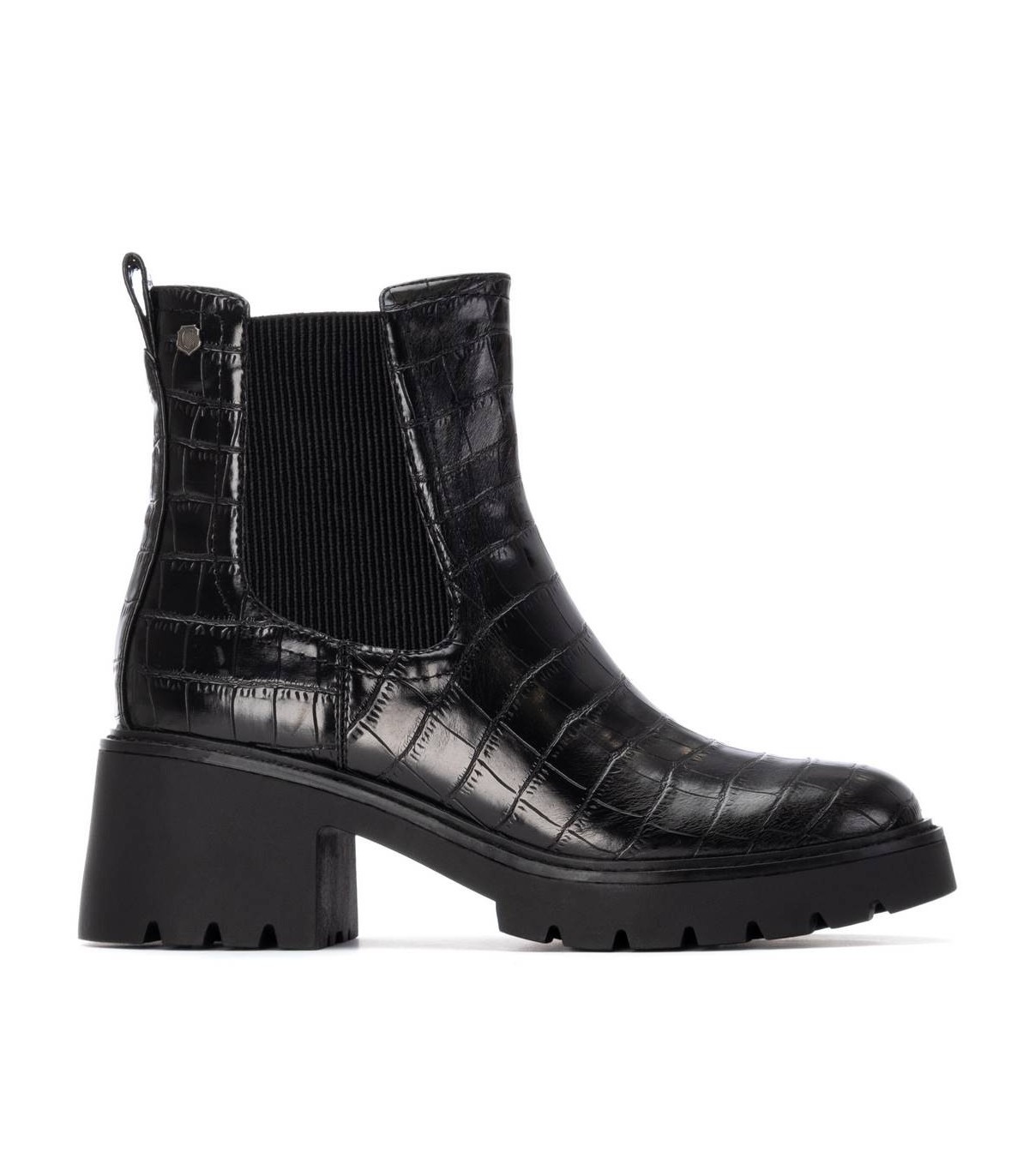 Botín de mujer, de la marca Carmela. Fabricado con material sintético que imita la piel con bonito grabado en coco. Cierre mediante chelseas laterales. Tirador trasero para facilitar la puesta. Suela de goma antideslizante. Plantilla extraíble