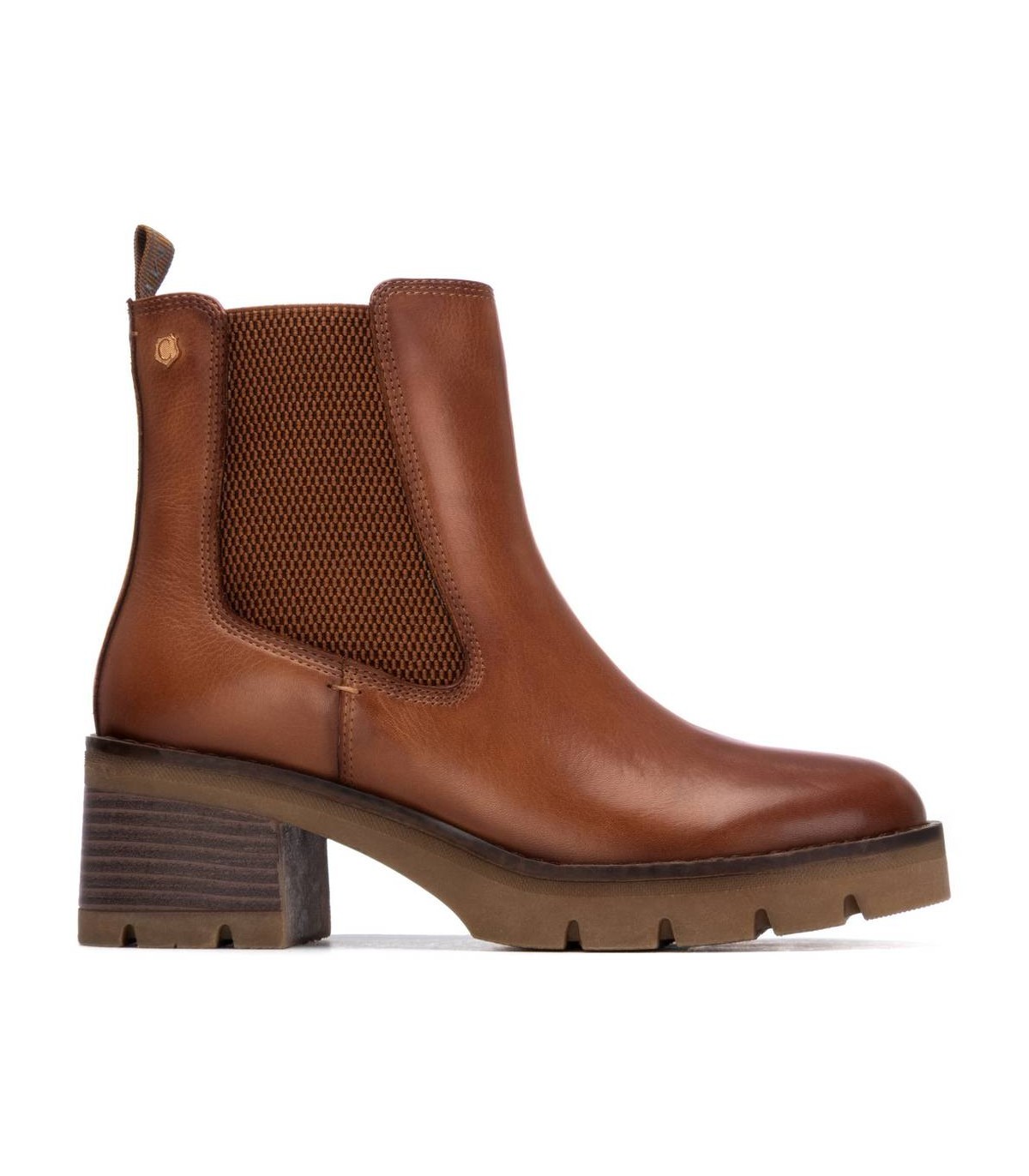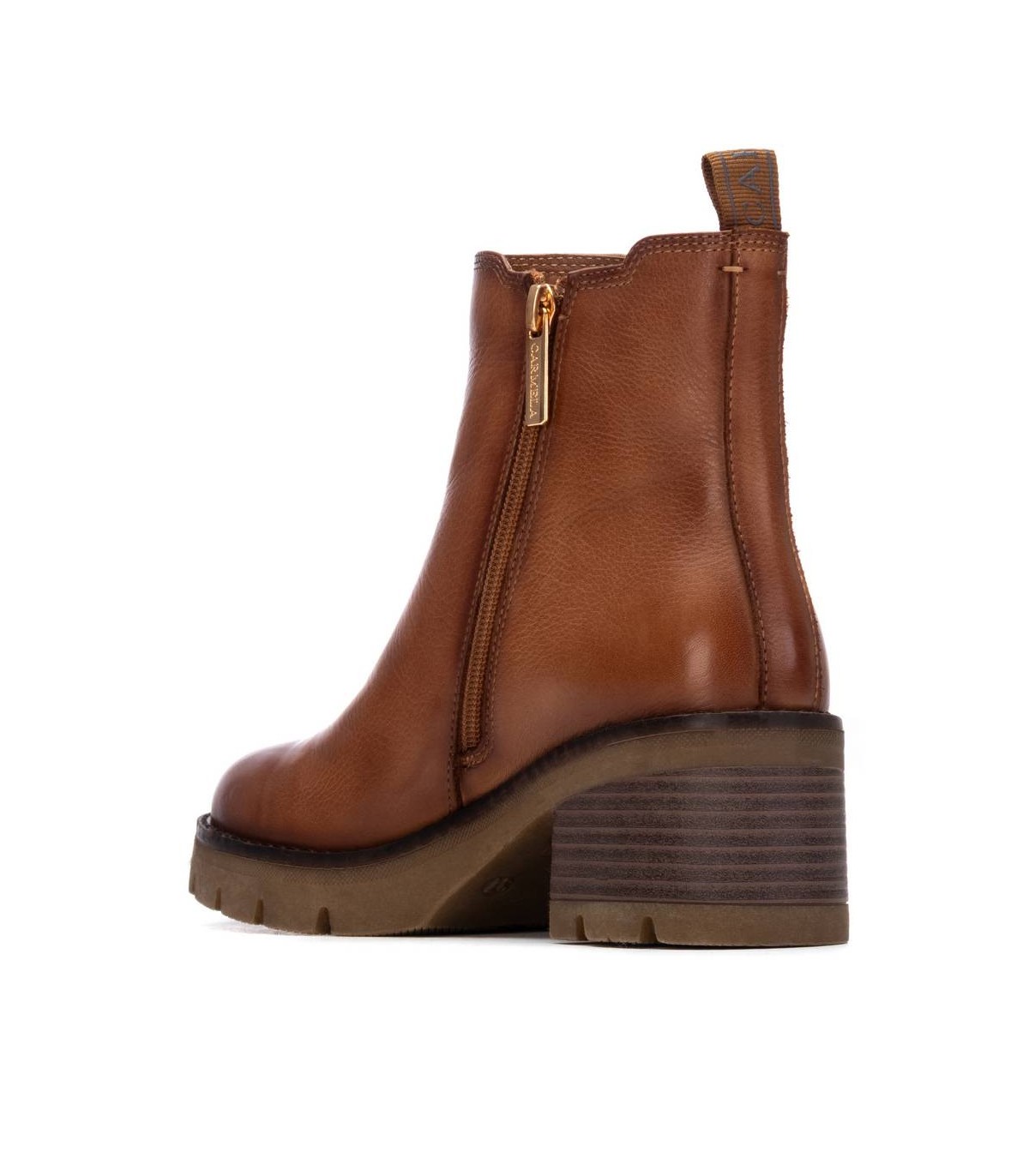 Botín de mujer, de la marca Carmela. Fabricado en piel de alta calidad. Tirador trasero para facilitar la puesta. Chelseas laterales. Suela antideslizante. Plantilla extraíble