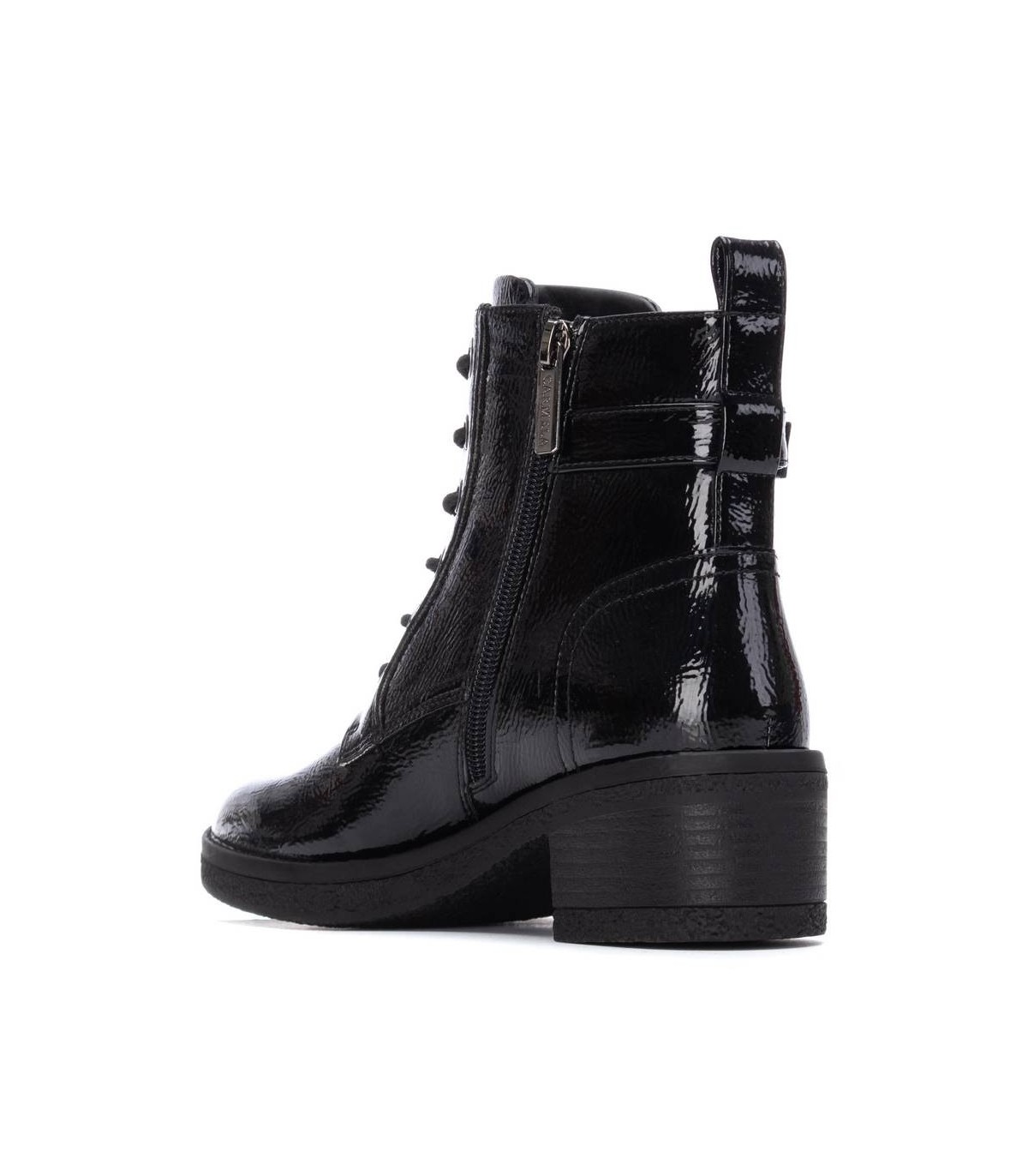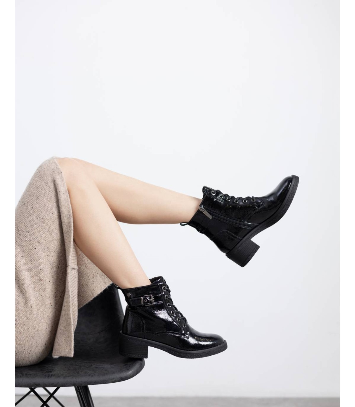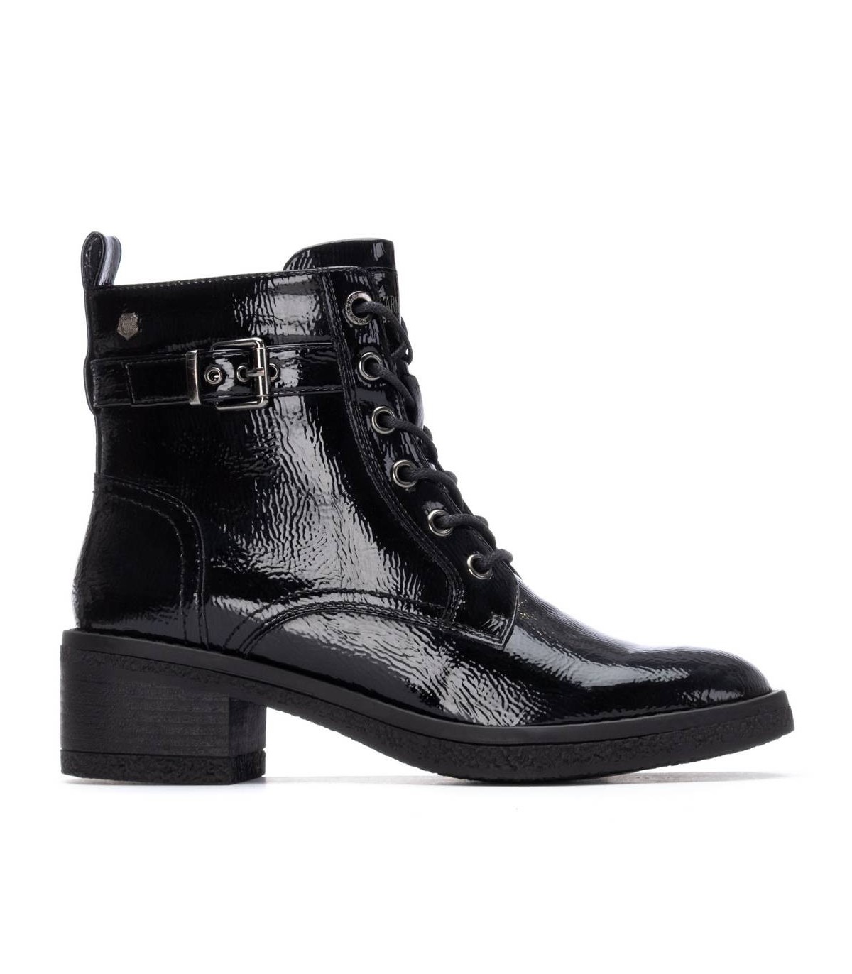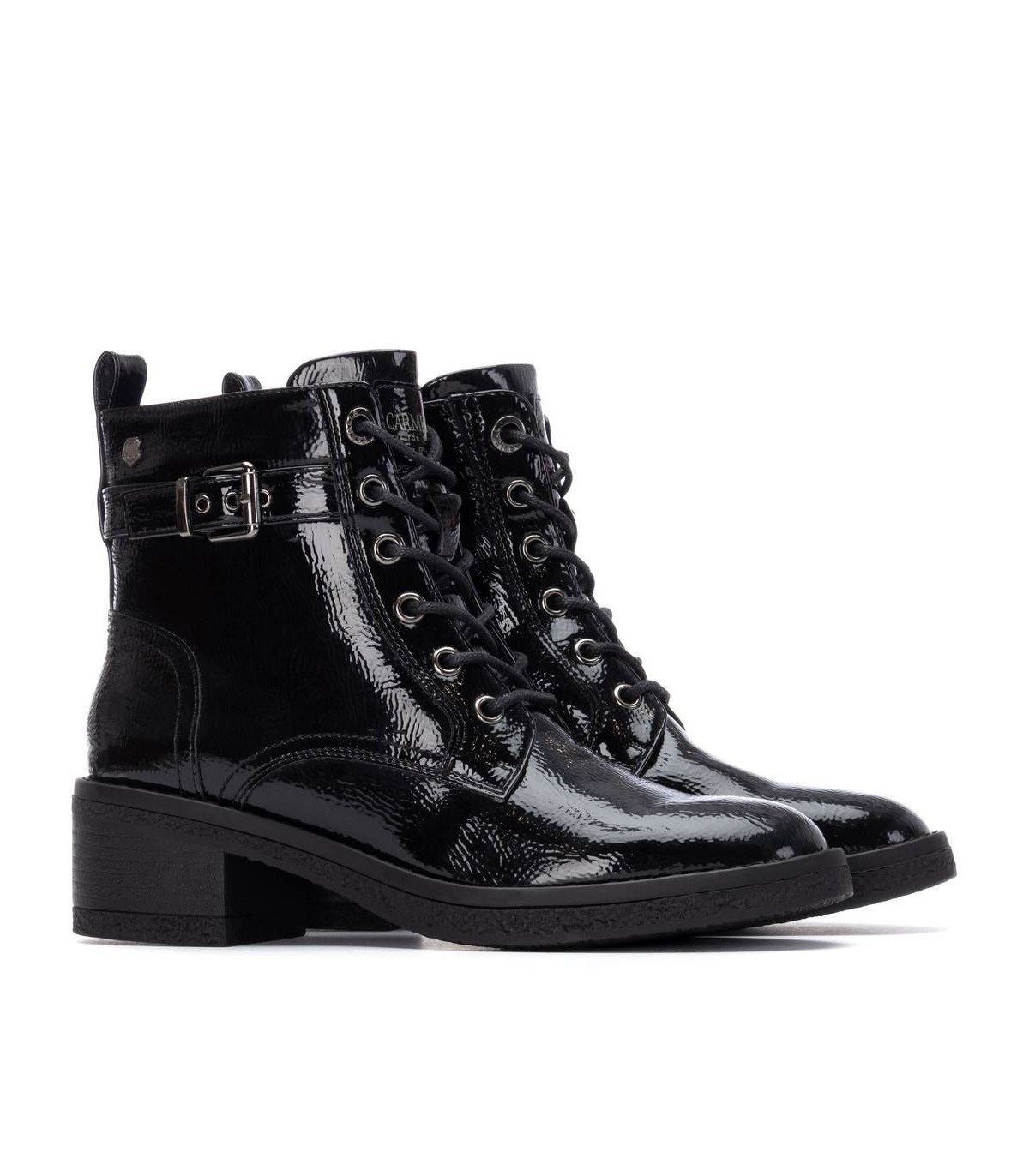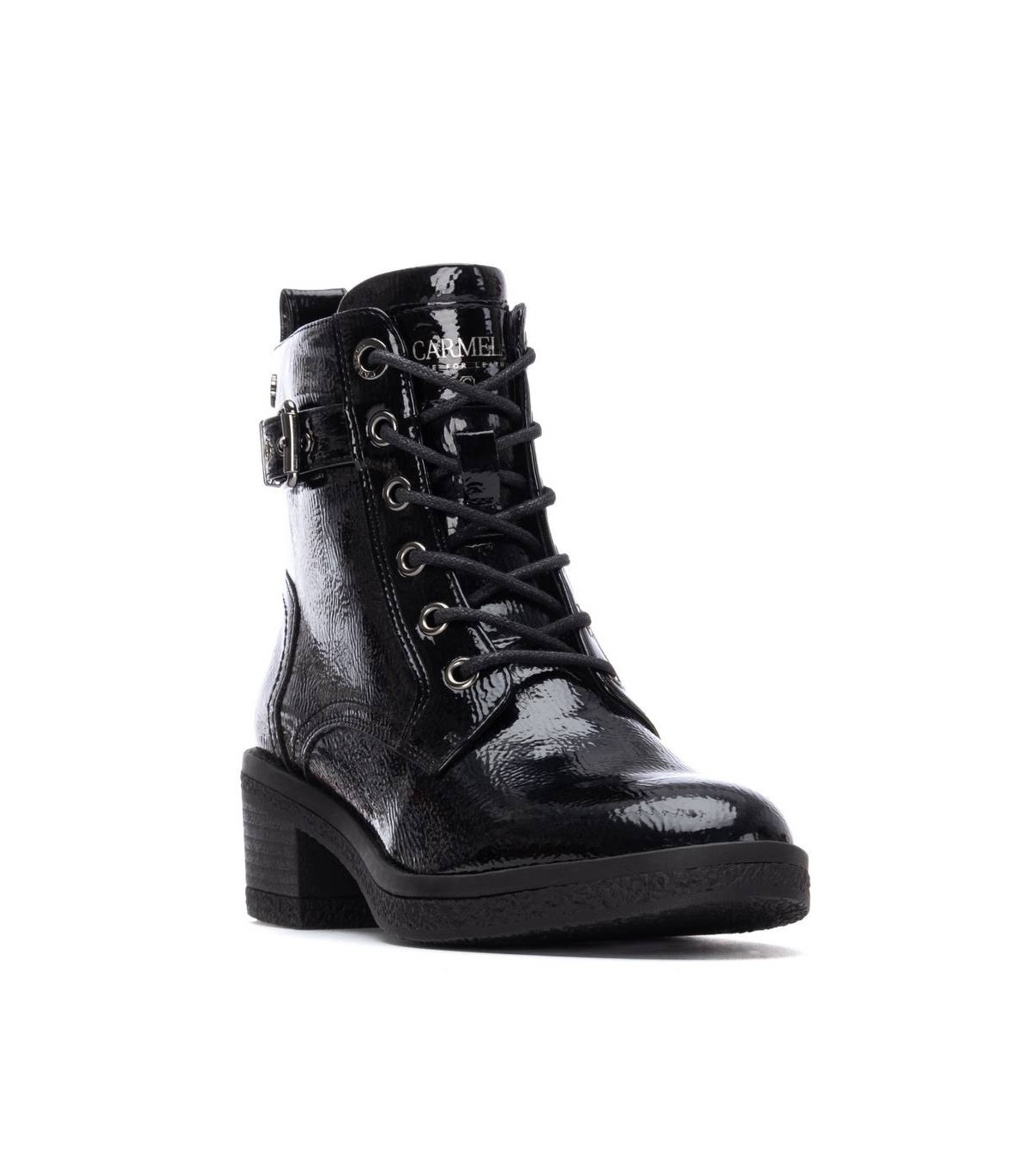 Botín de mujer, de la marca Carmela. Fabricado en charol. Cierre mediante cremallera interna. Detalle al frente de cordones y hebilla lateral. Tirador trasero para facilitar la puesta. Suela de goma antideslizante. Plantilla extraíble