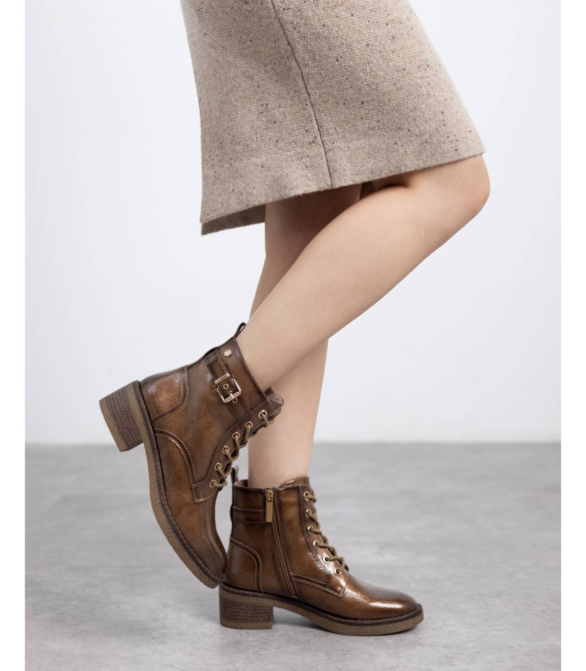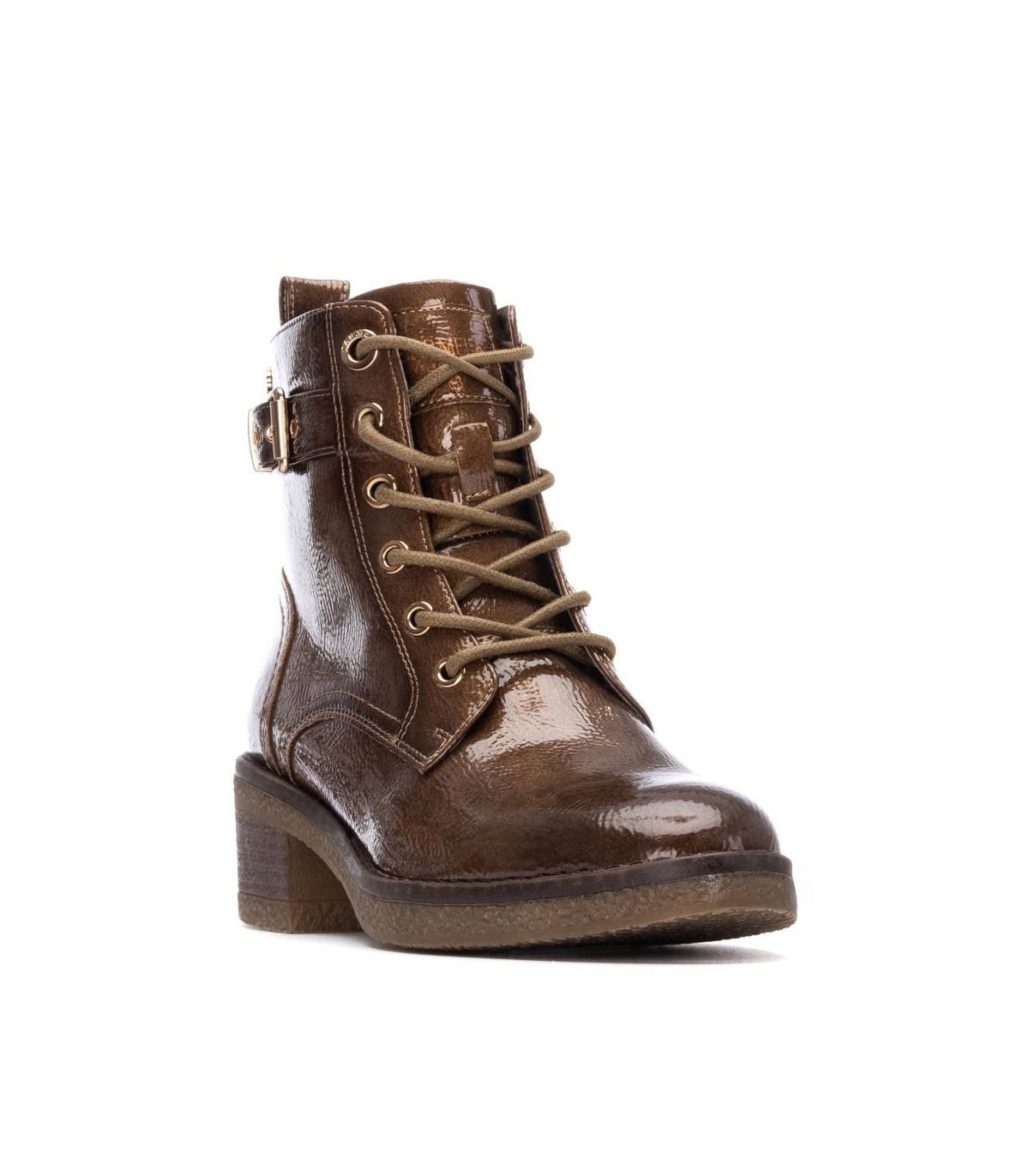 Botín de mujer, de la marca Carmela. Fabricado en charol. Cierre mediante cremallera interna. Detalle al frente de cordones y hebilla lateral. Tirador trasero para facilitar la puesta. Suela de goma antideslizante. Plantilla extraíble