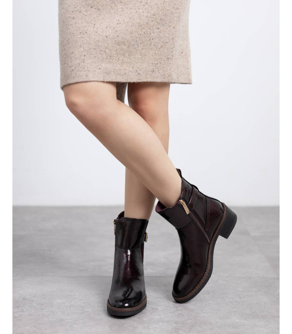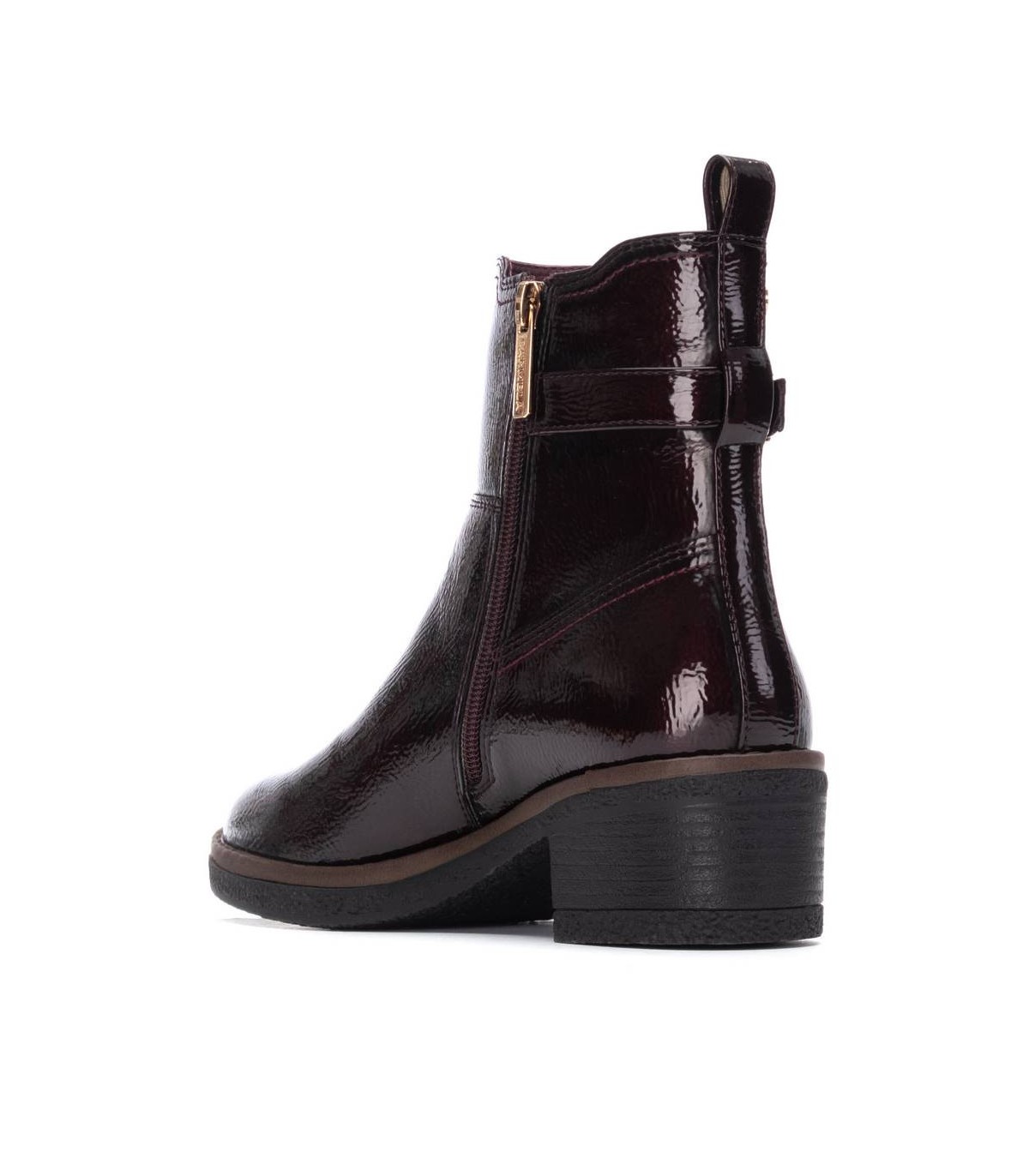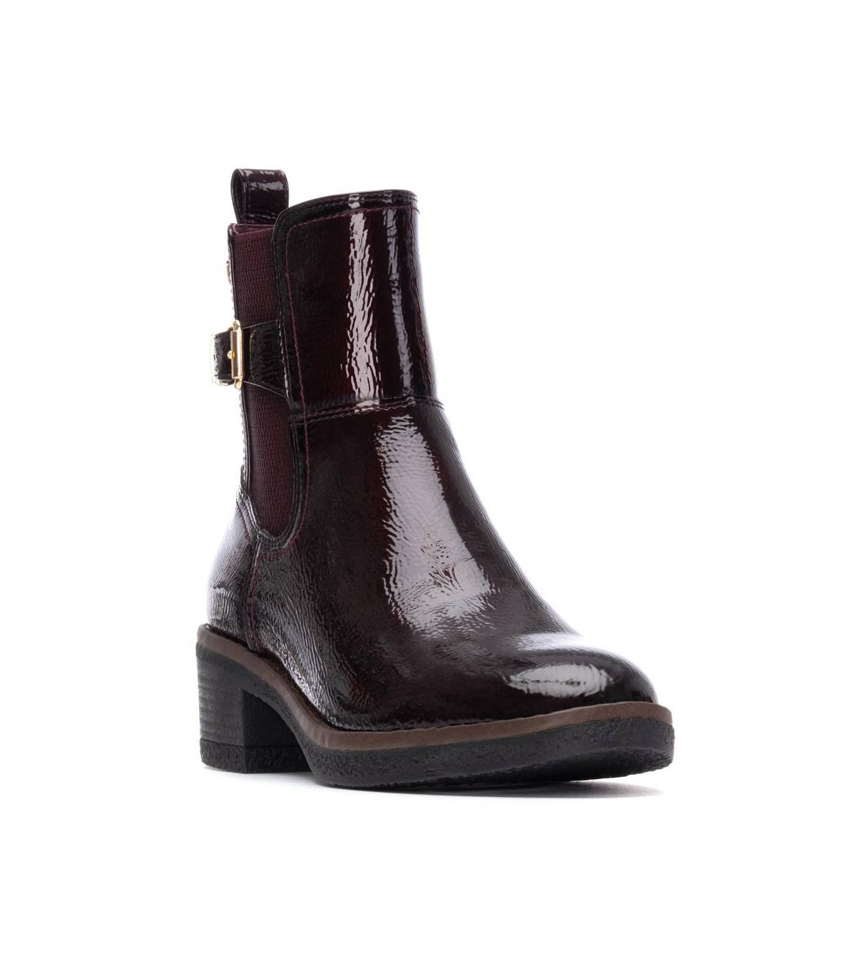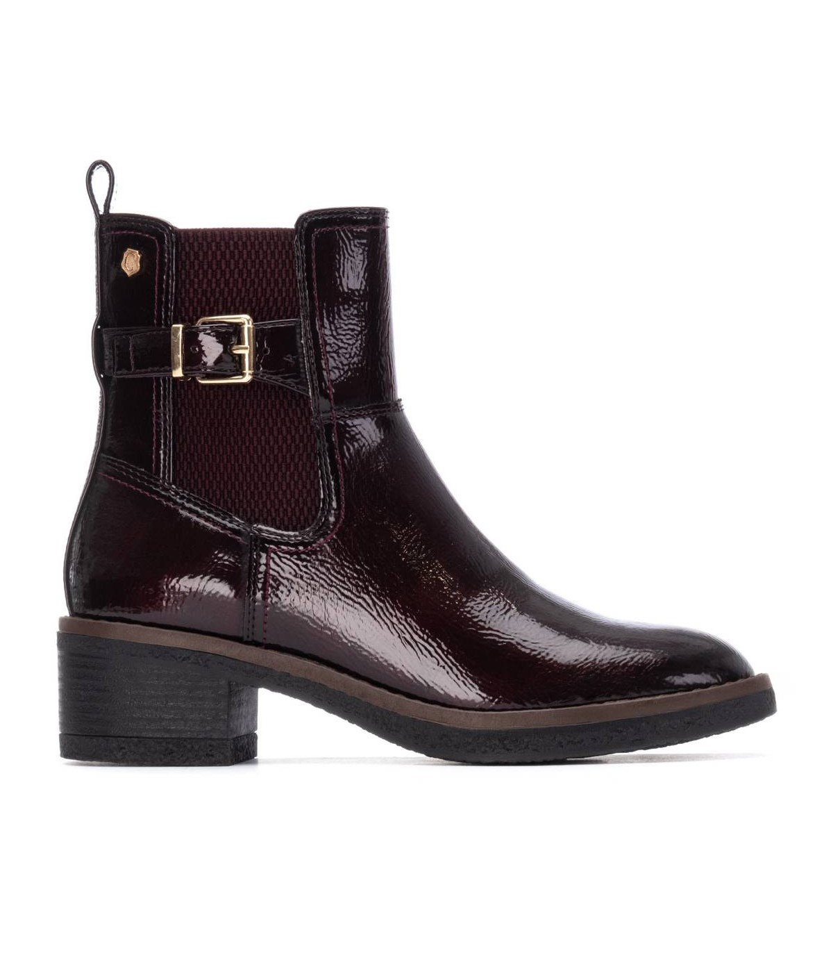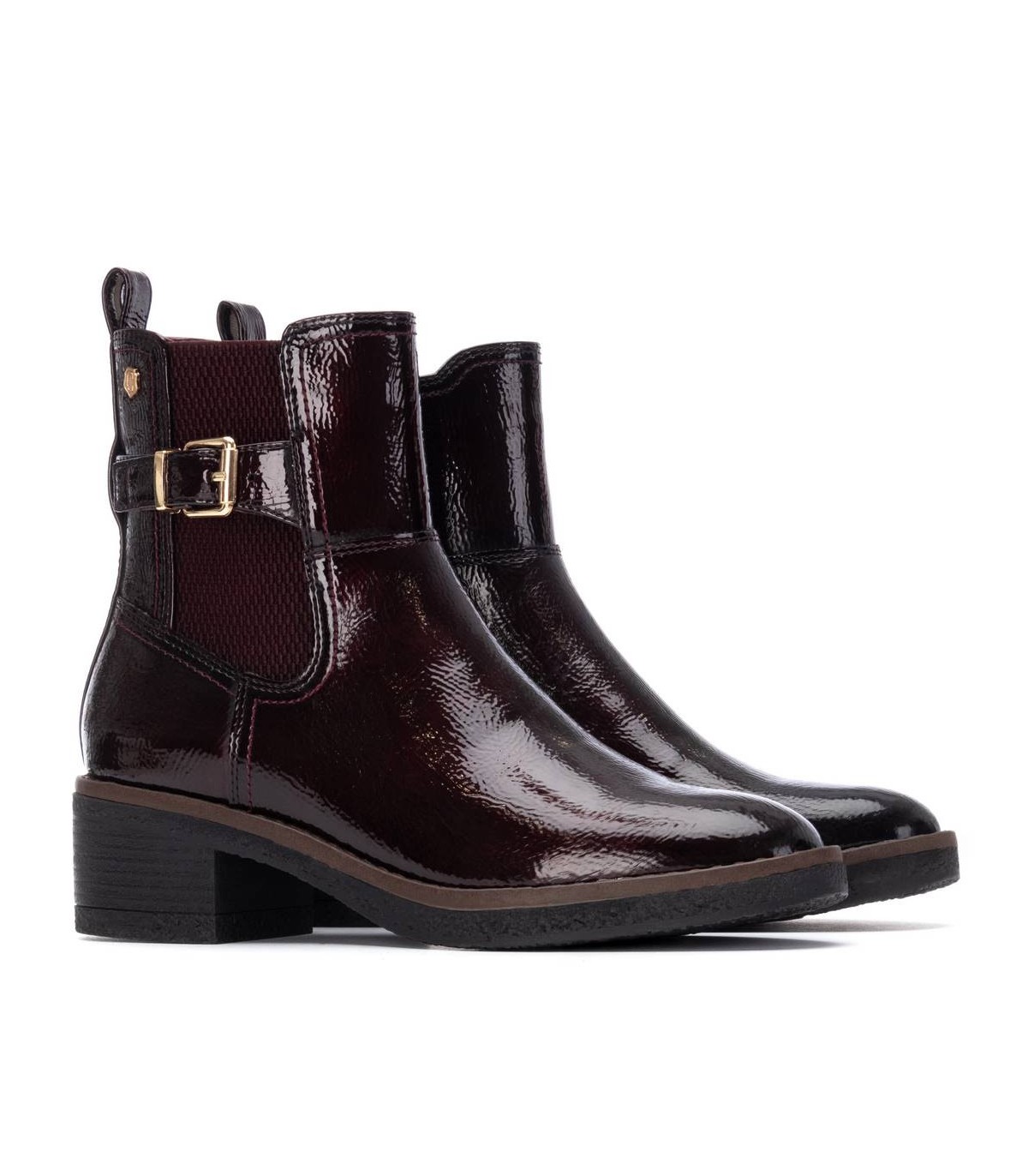 Botín de mujer, de la marca Carmela. Fabricado en charol. Cierre lateral con hebilla. Chelseas laterales. Tirador trasero para facilitar la puesta. Suela de goma antideslizante.
