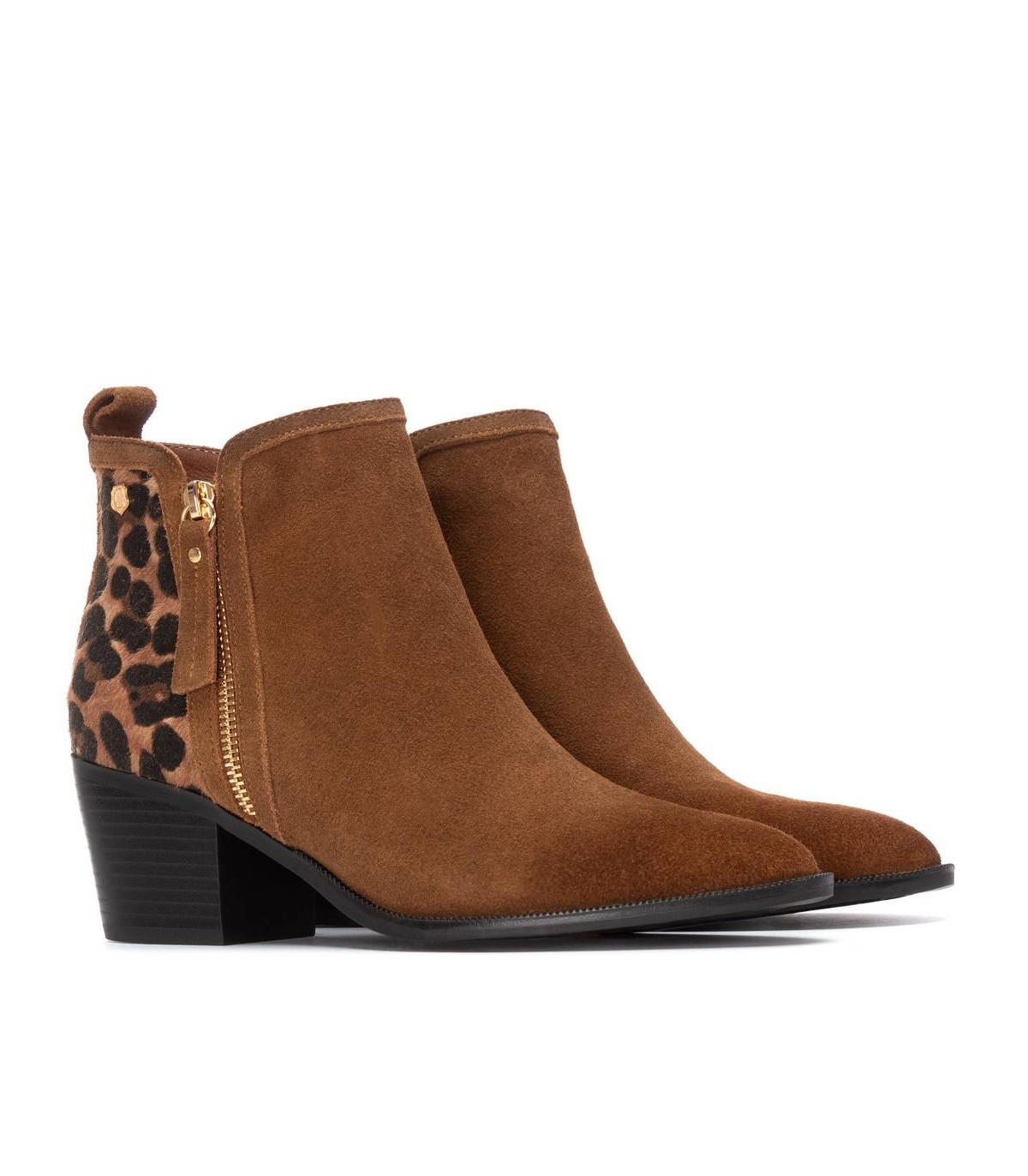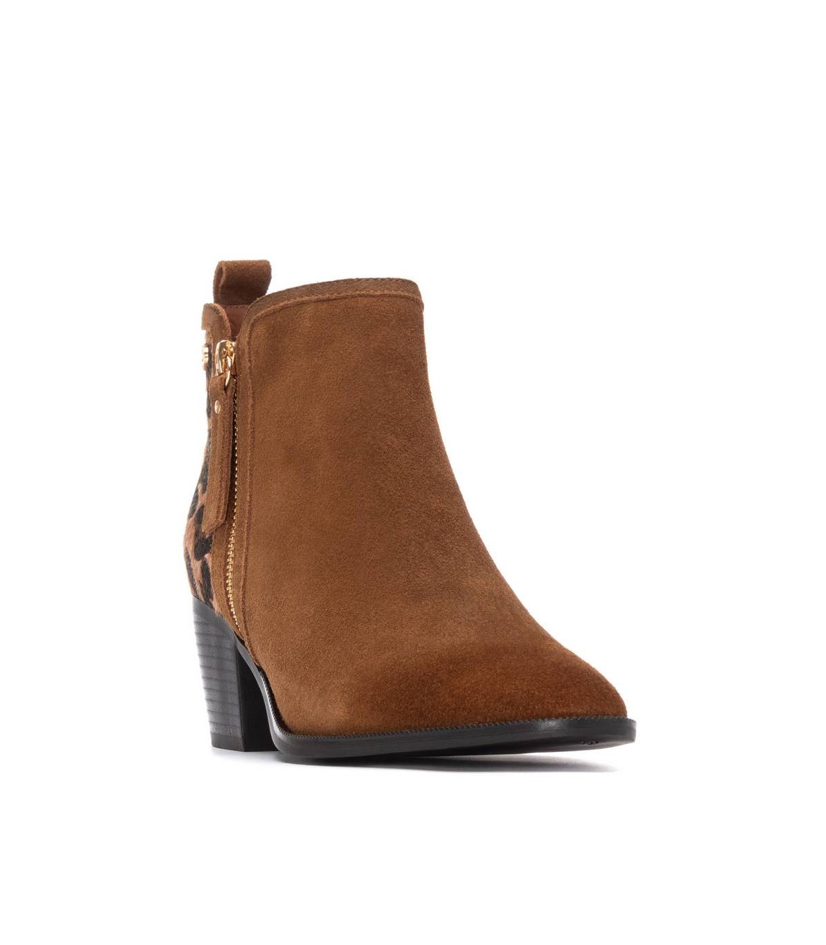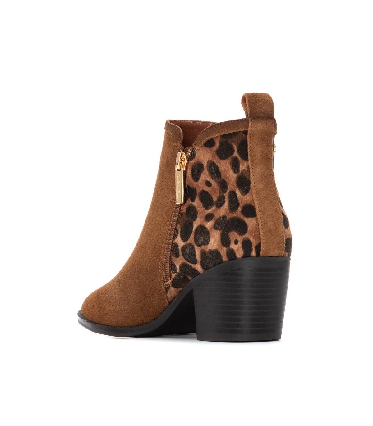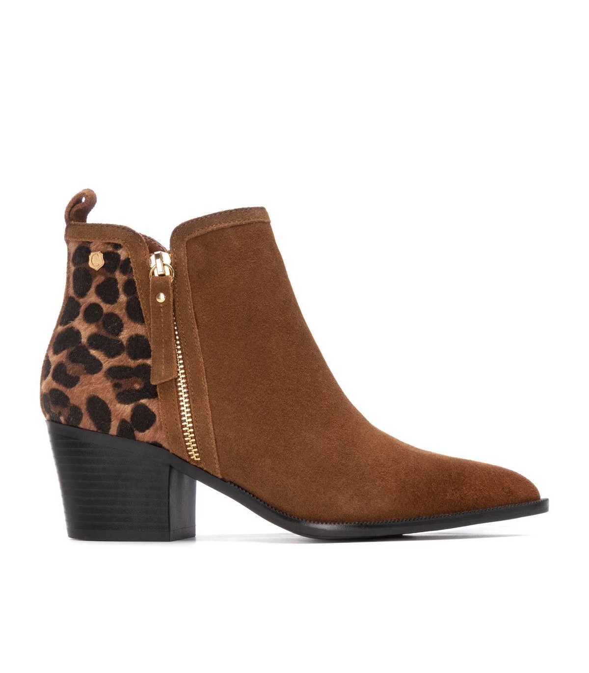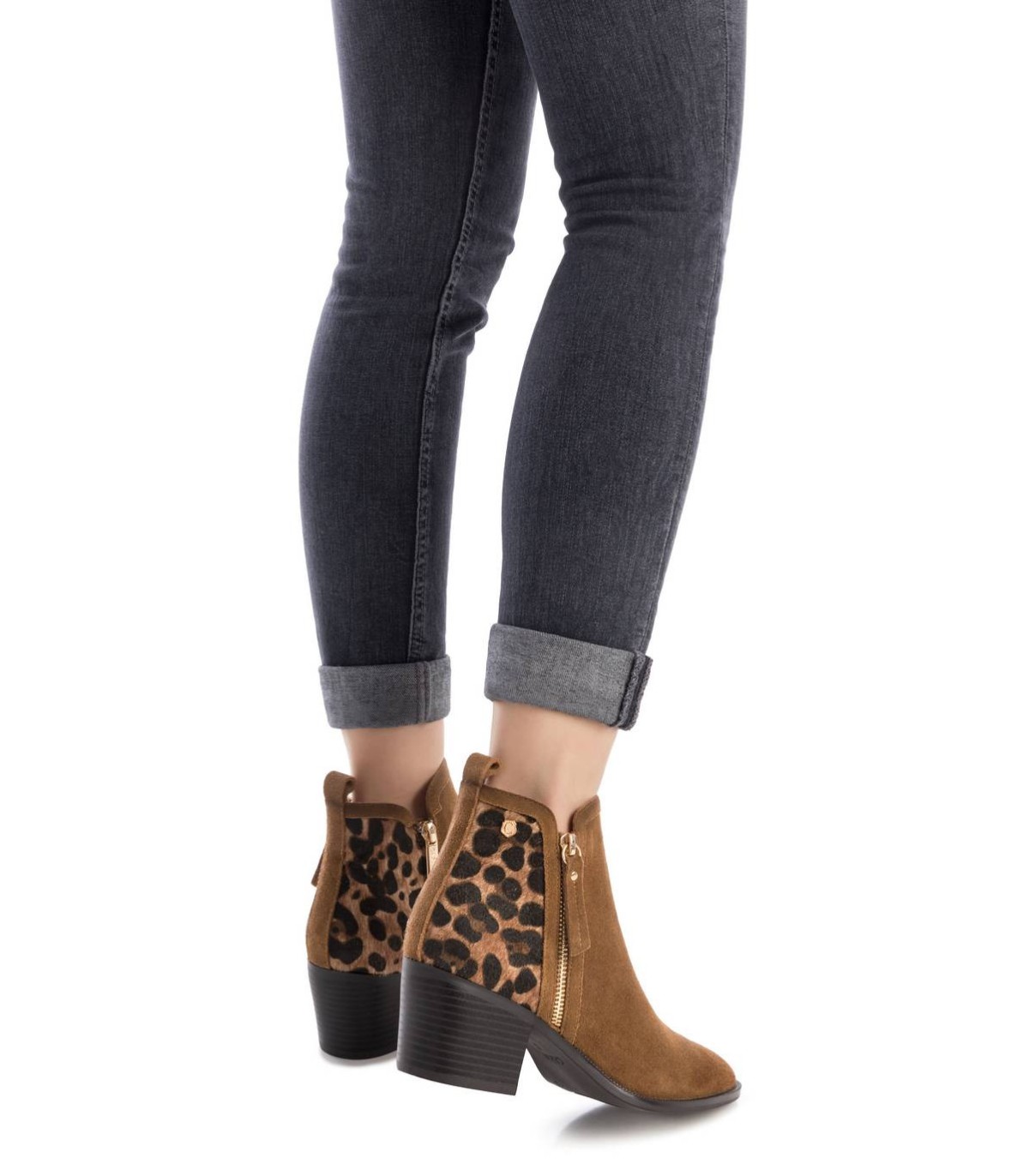 Botín de mujer, de la marca Carmela. Fabricado en un suave serraje. Cierre lateral con cremallera. Parte trasera con estampado. Tirador trasero para facilitar la puesta. Suela antideslizante.