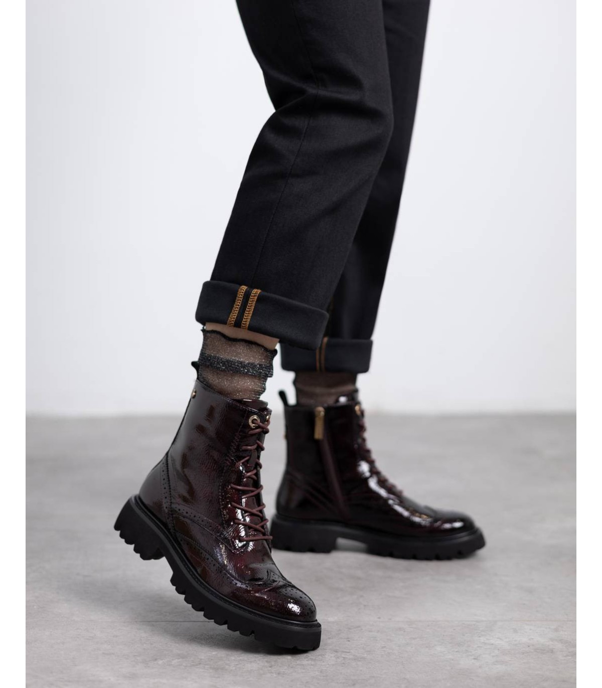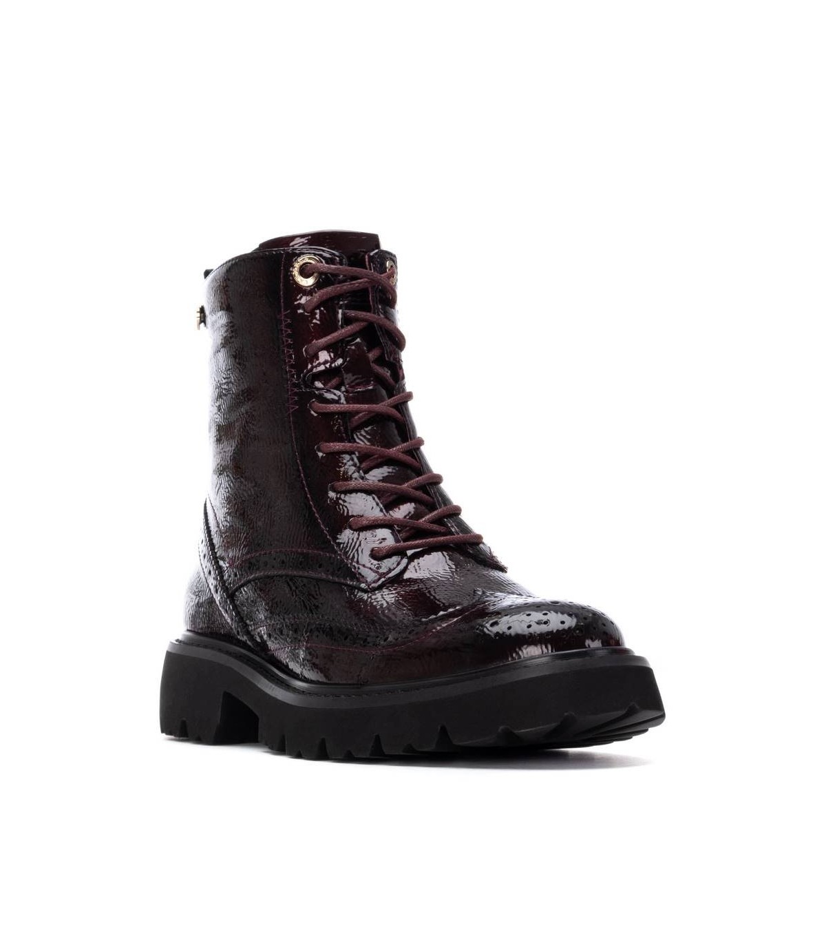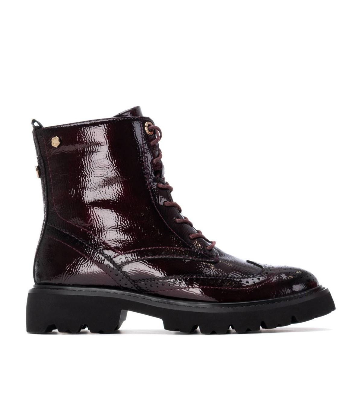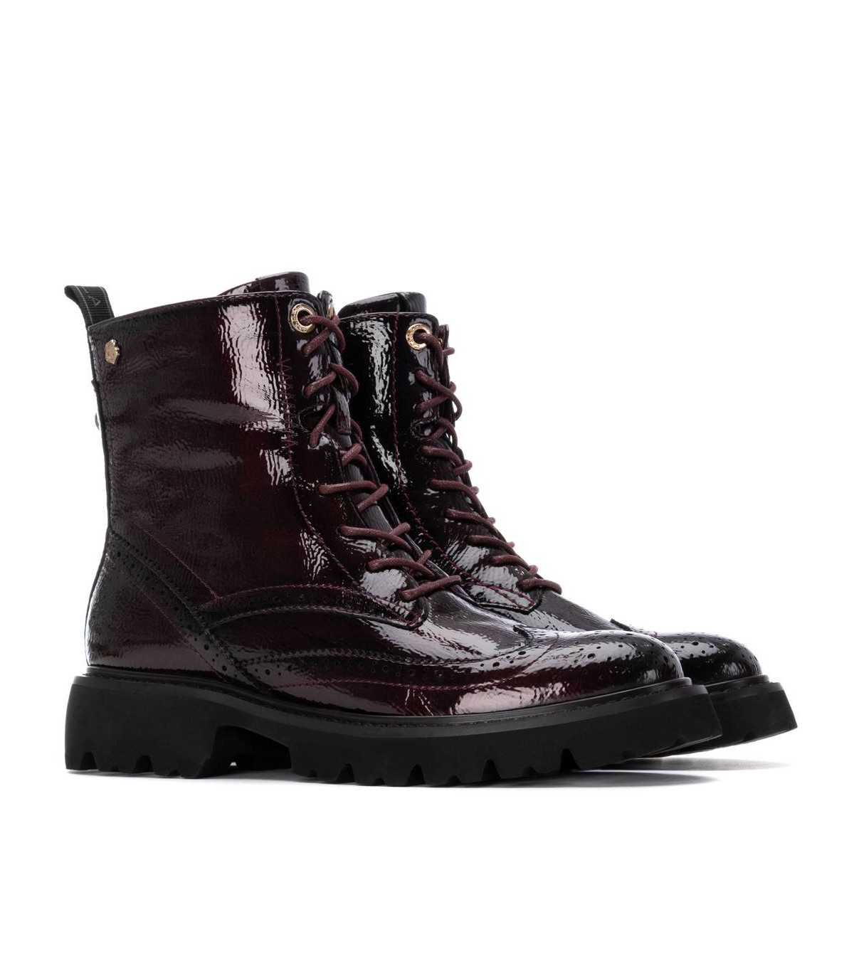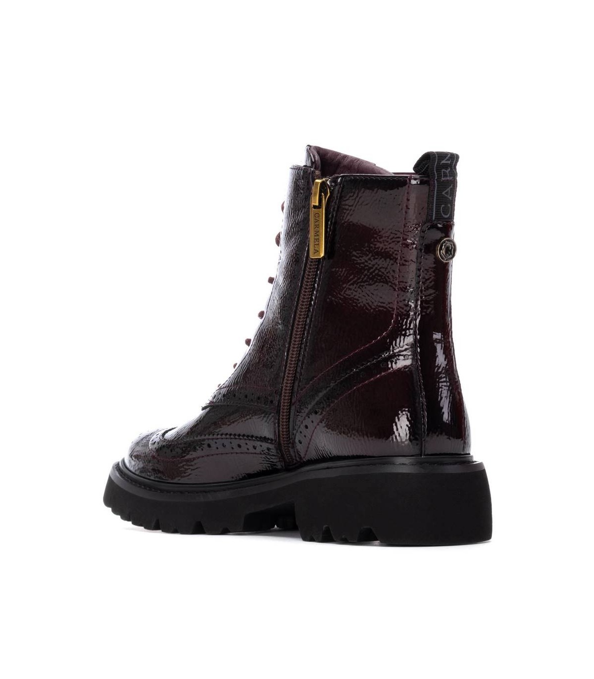 Botín de mujer, de la marca Carmela. Fabricado en charol. Cierre mediante cremallera y cordones ajustables. Tirador trasero para facilitar la puesta. Suela de goma antideslizante. Plantilla extraíble