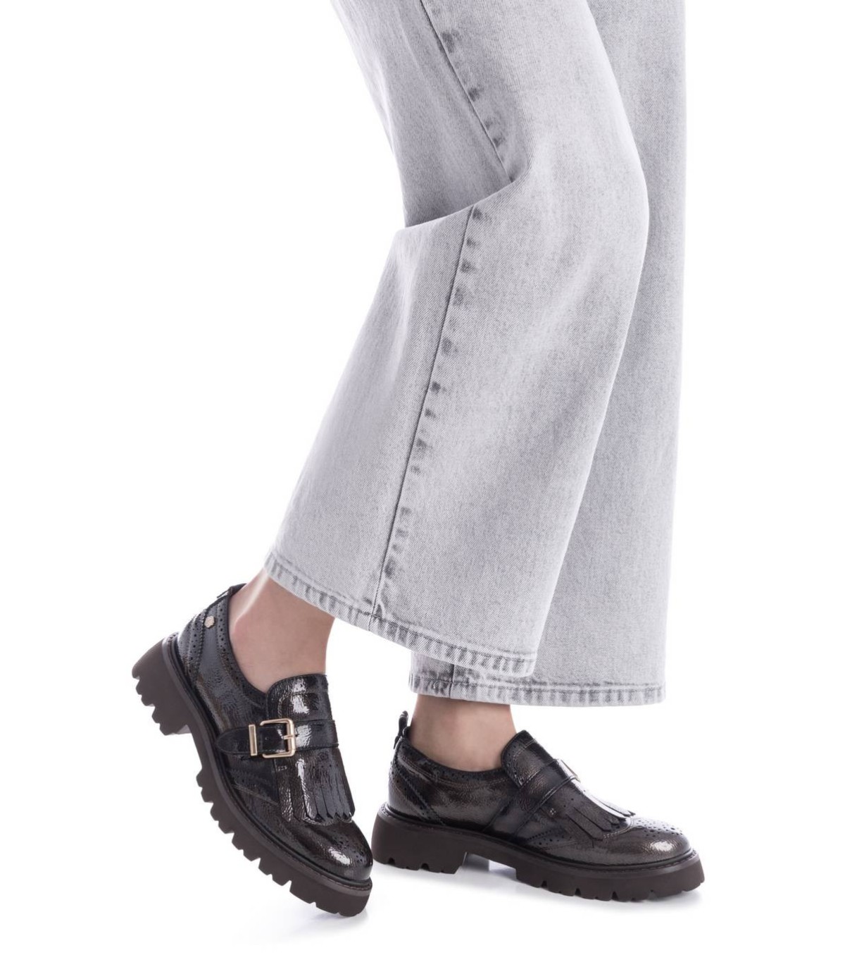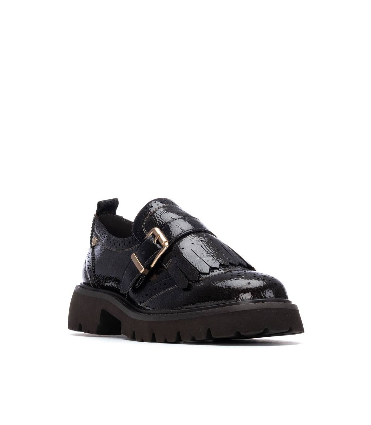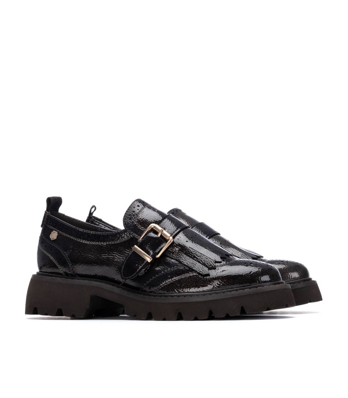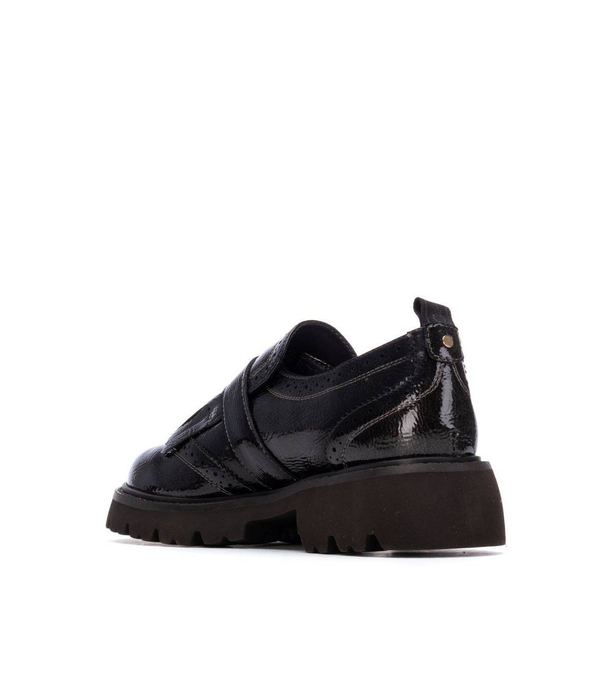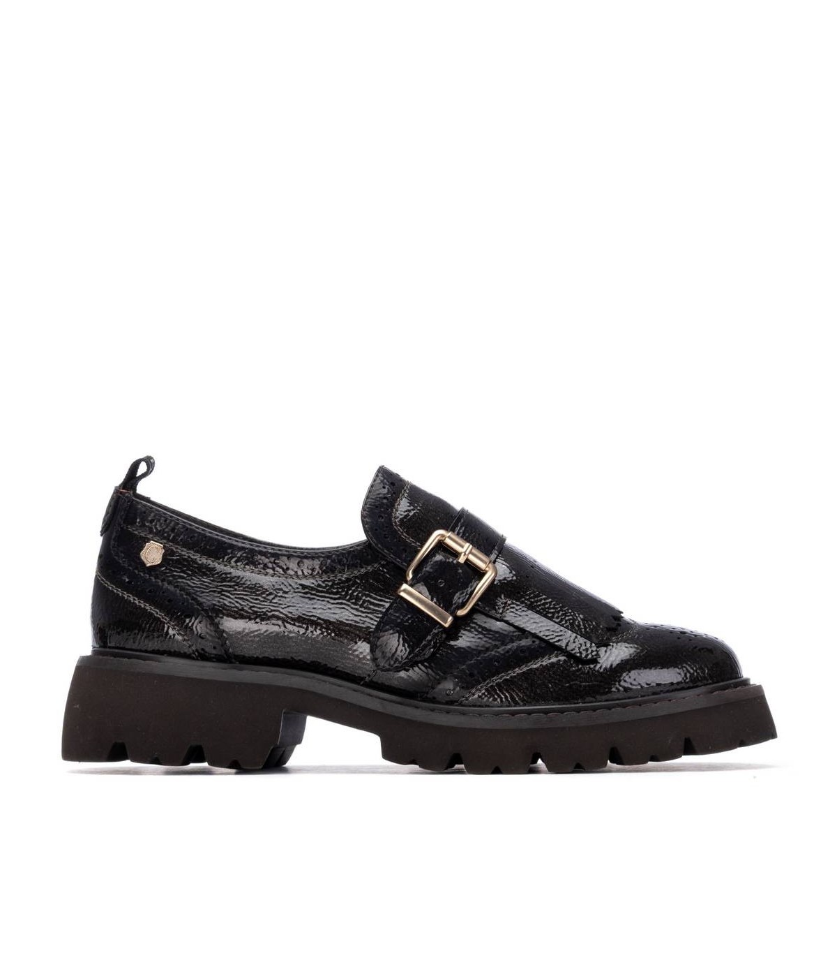 mocasin de mujer, de la marca Carmela. Fabricado en charol. Antifaz en el frente con hebilla decorativa. Tirador trasero para facilitar la puesta. Suela volumen de goma antideslizante. Plantilla extraíble