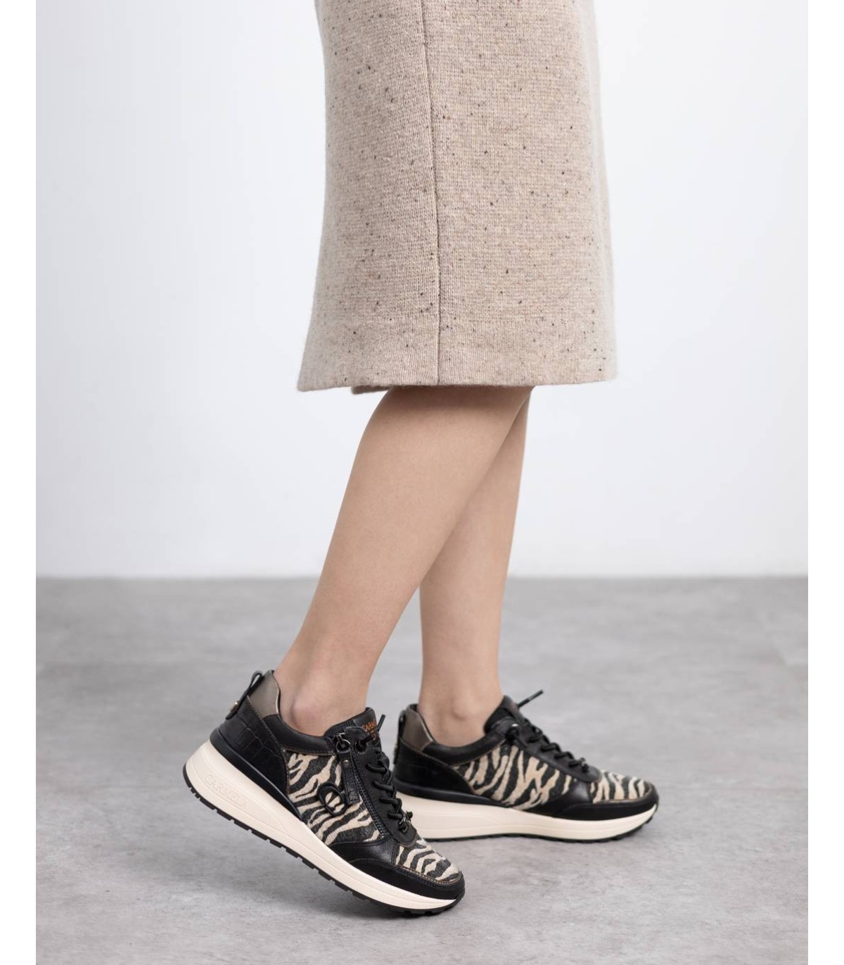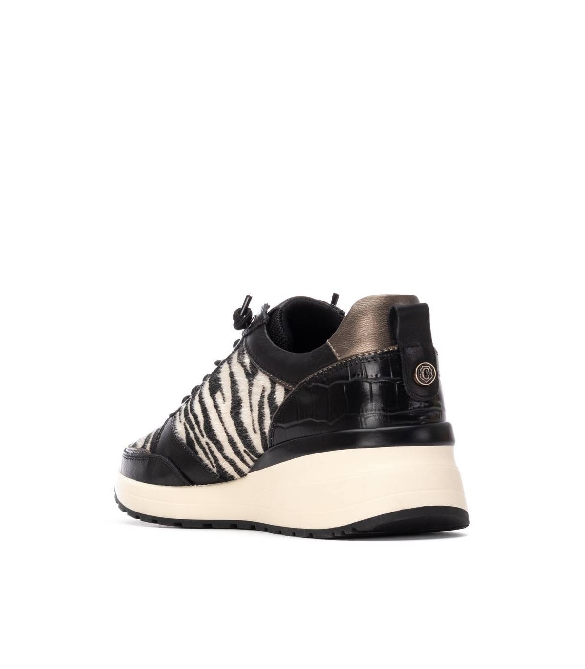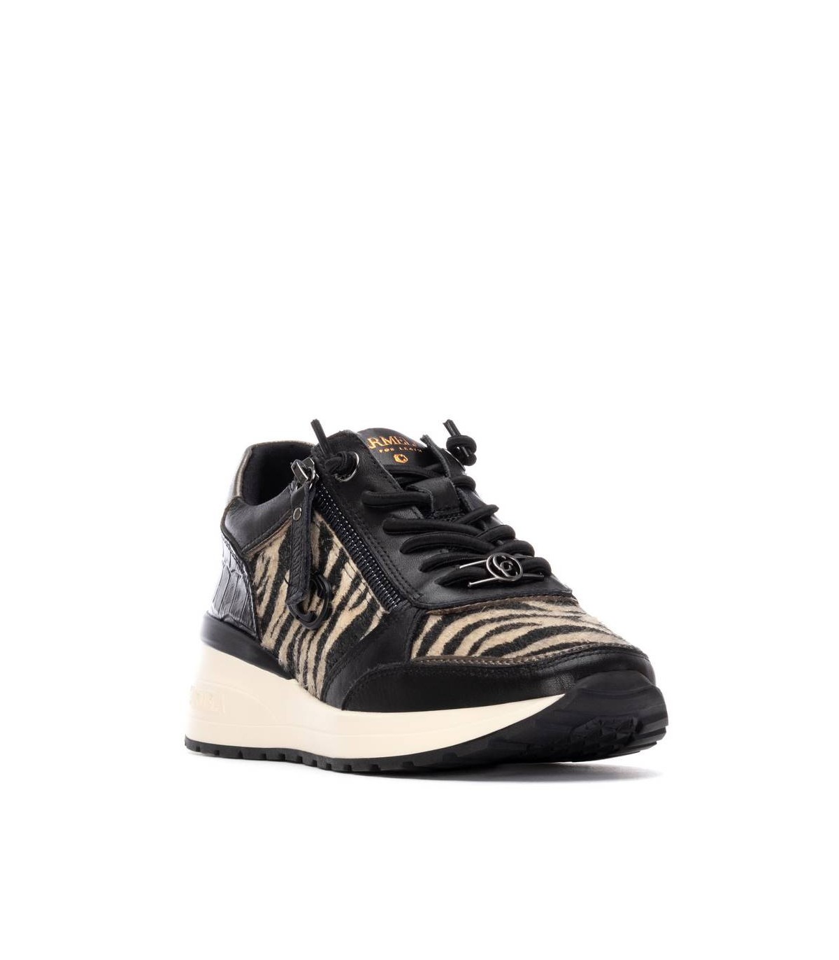 Zapatilla de mujer, de la marca Carmela. Fabricada en piel de alta calidad. Cierre mediante cremallera lateral y cordones ajustables. Detalles con bonito grabado en coco y efecto metalizado. Tirador trasero para facilitar la puesta. Suela de goma antideslizante.