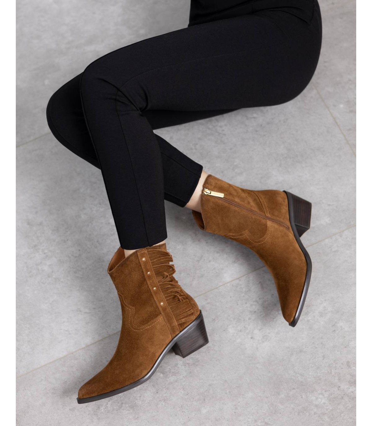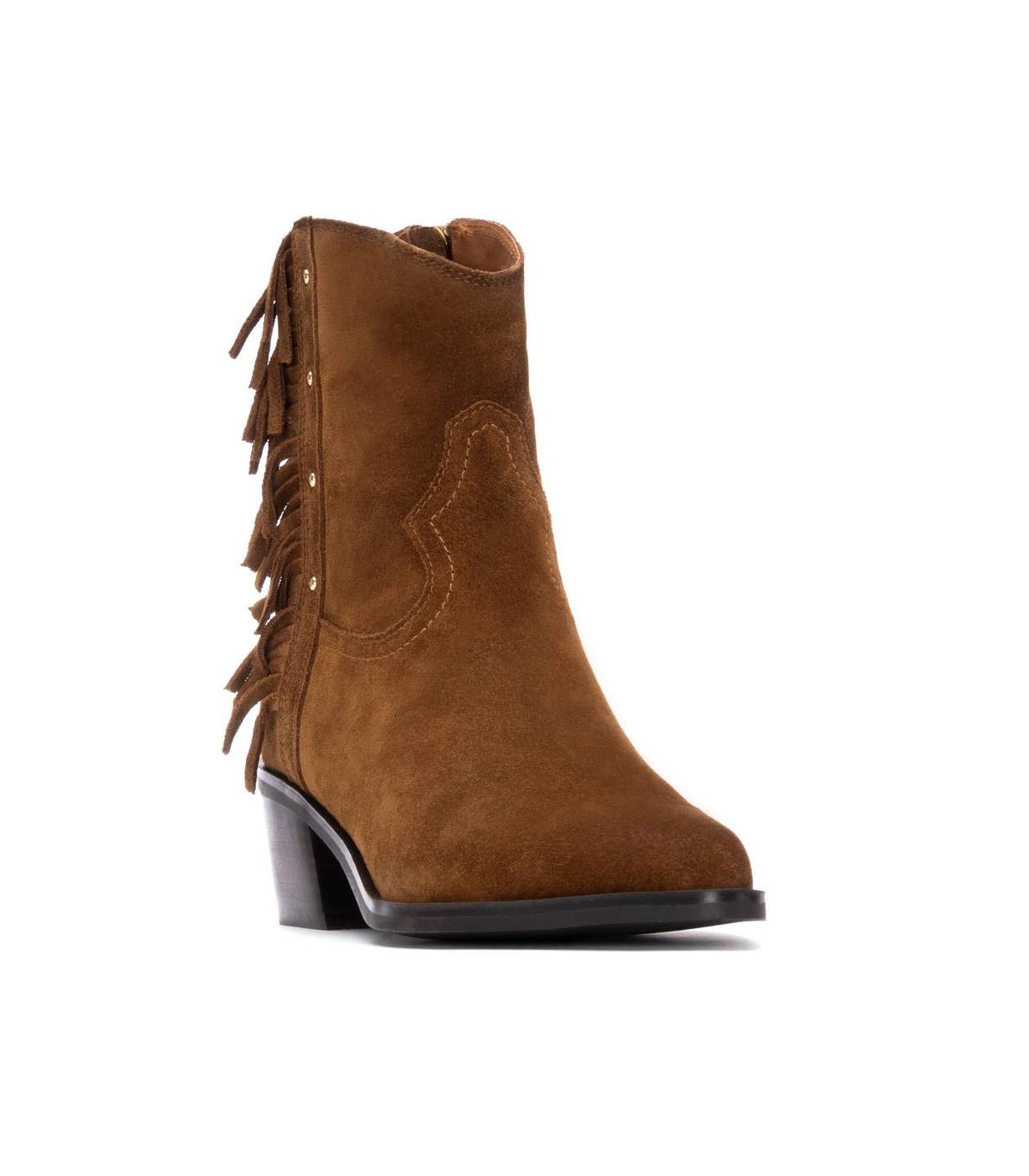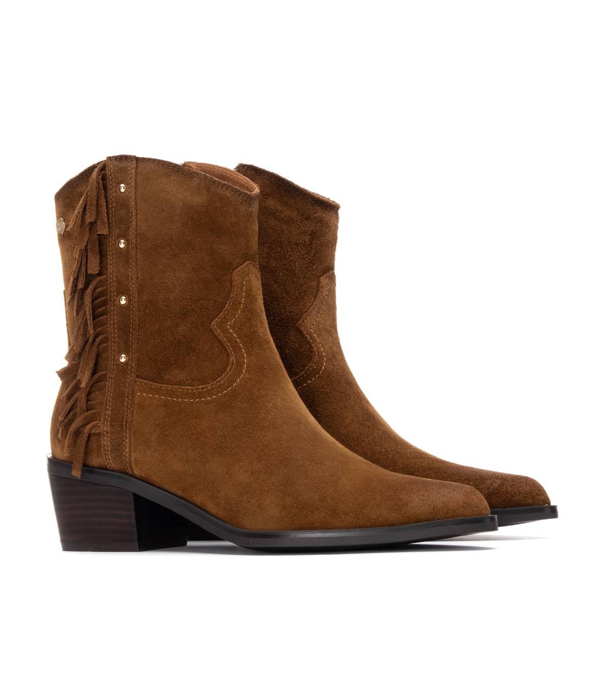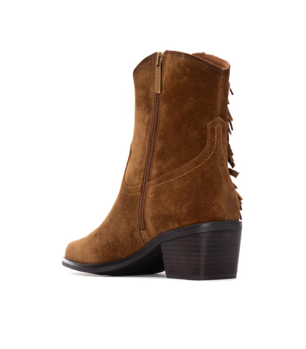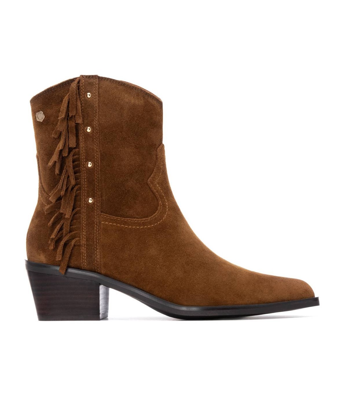 Botín de mujer, de la marca Carmela. Fabricado en un suave serraje. Detalle lateral con tachuelas pequeñas y flecos. Plantilla extraíble