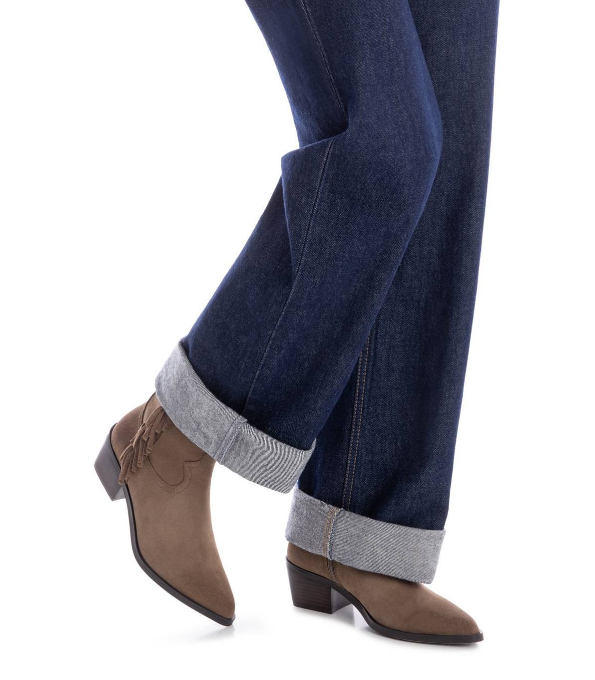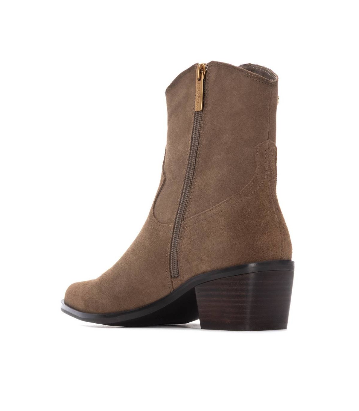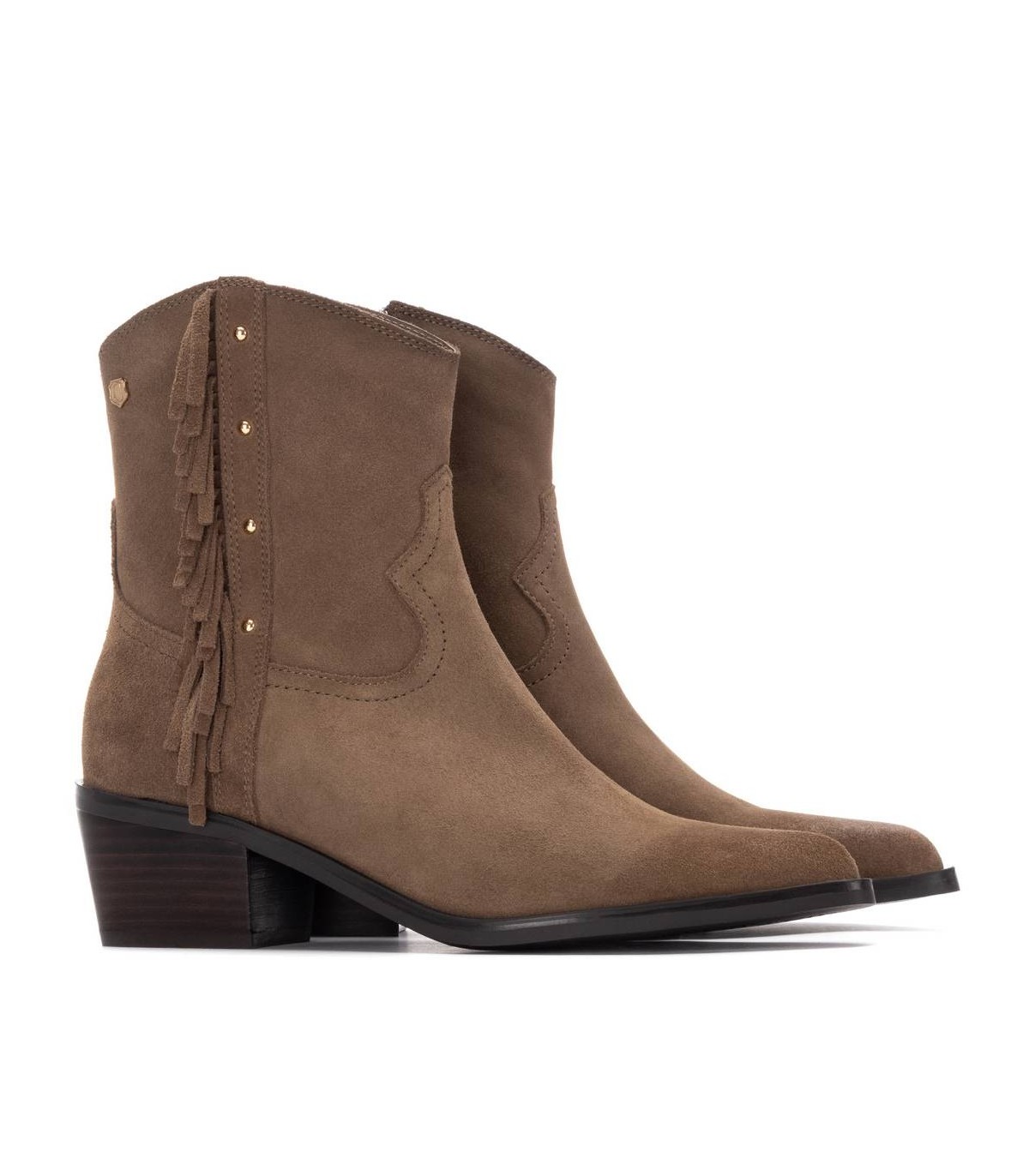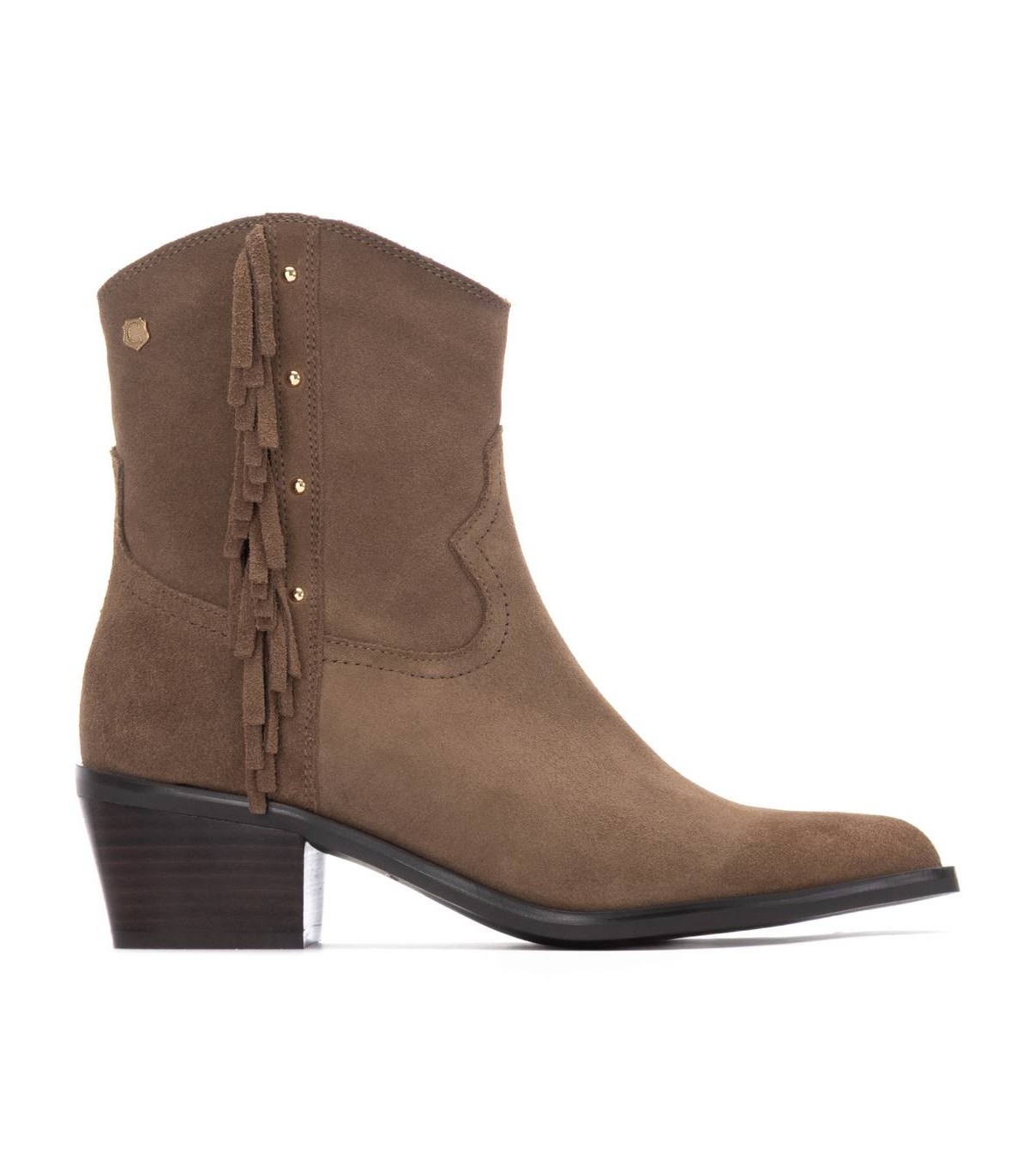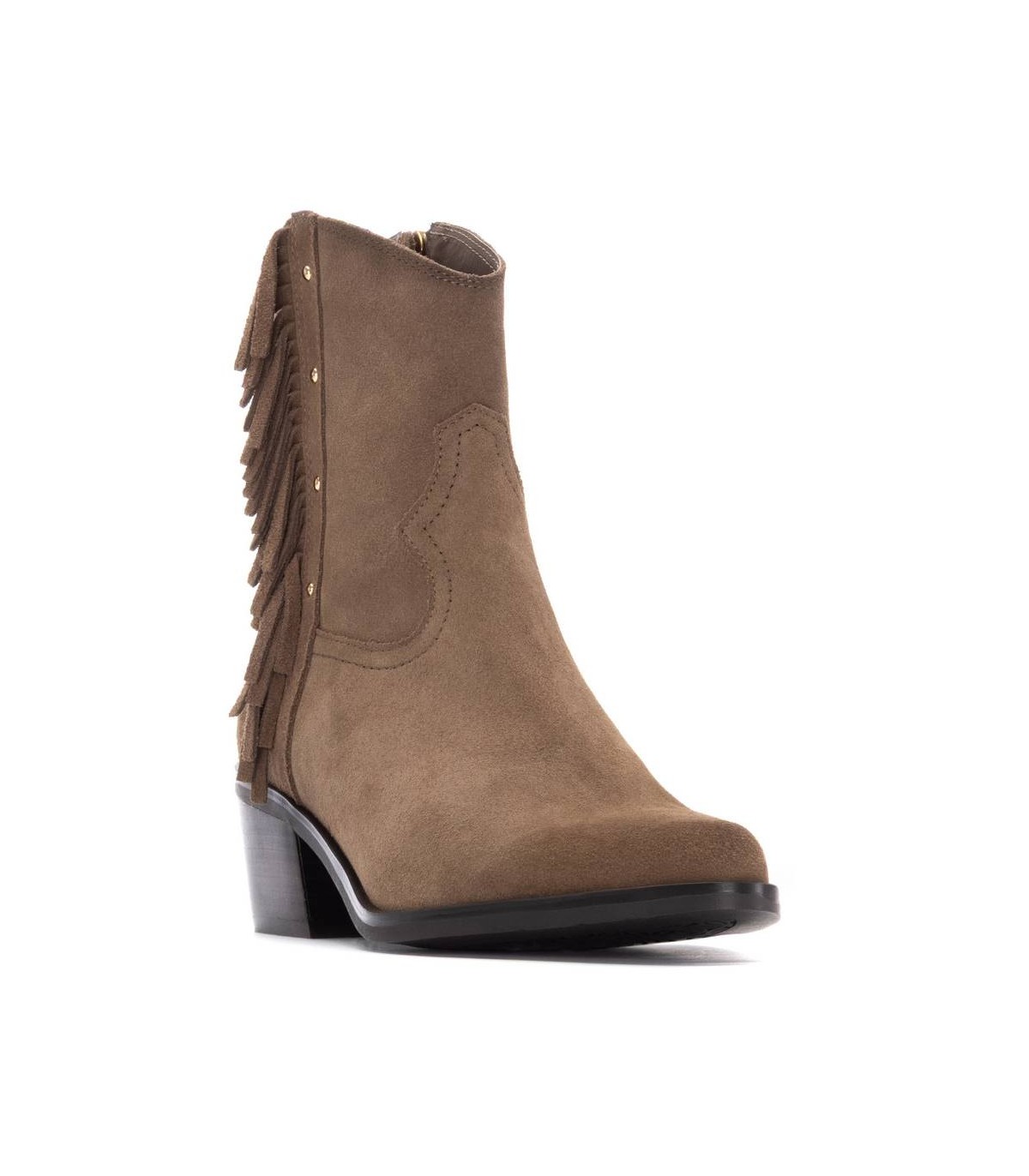 Botín de mujer, de la marca Carmela. Fabricado en un suave serraje. Detalle lateral con tachuelas pequeñas y flecos. Plantilla extraíble