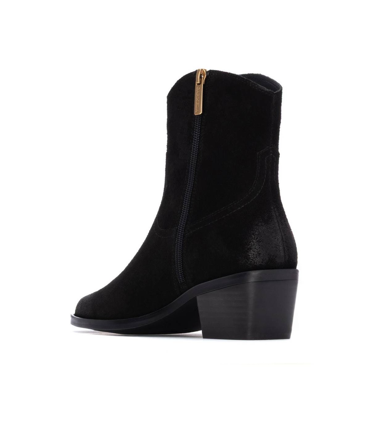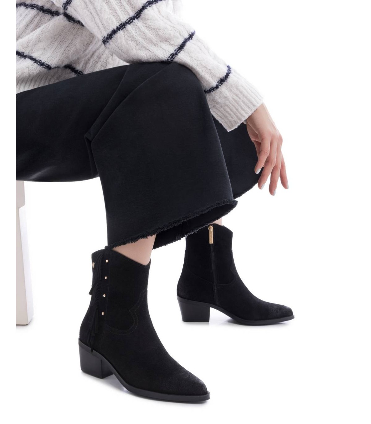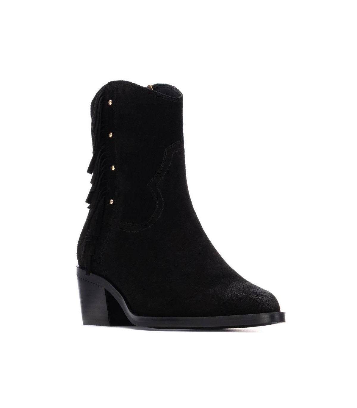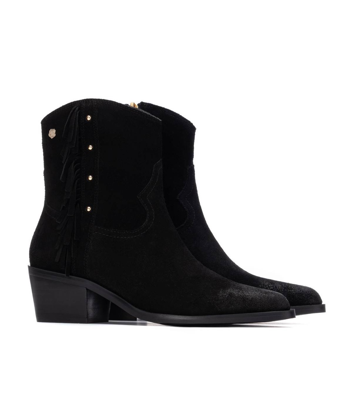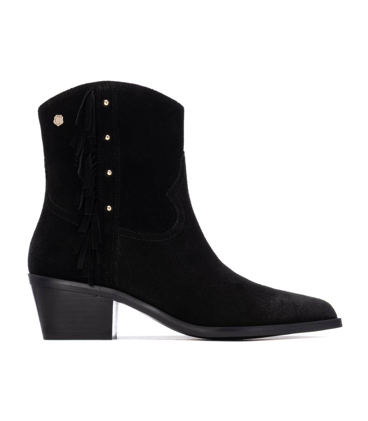 Botín de mujer, de la marca Carmela. Fabricado en un suave serraje. Detalle lateral con tachuelas pequeñas y flecos. Plantilla extraíble