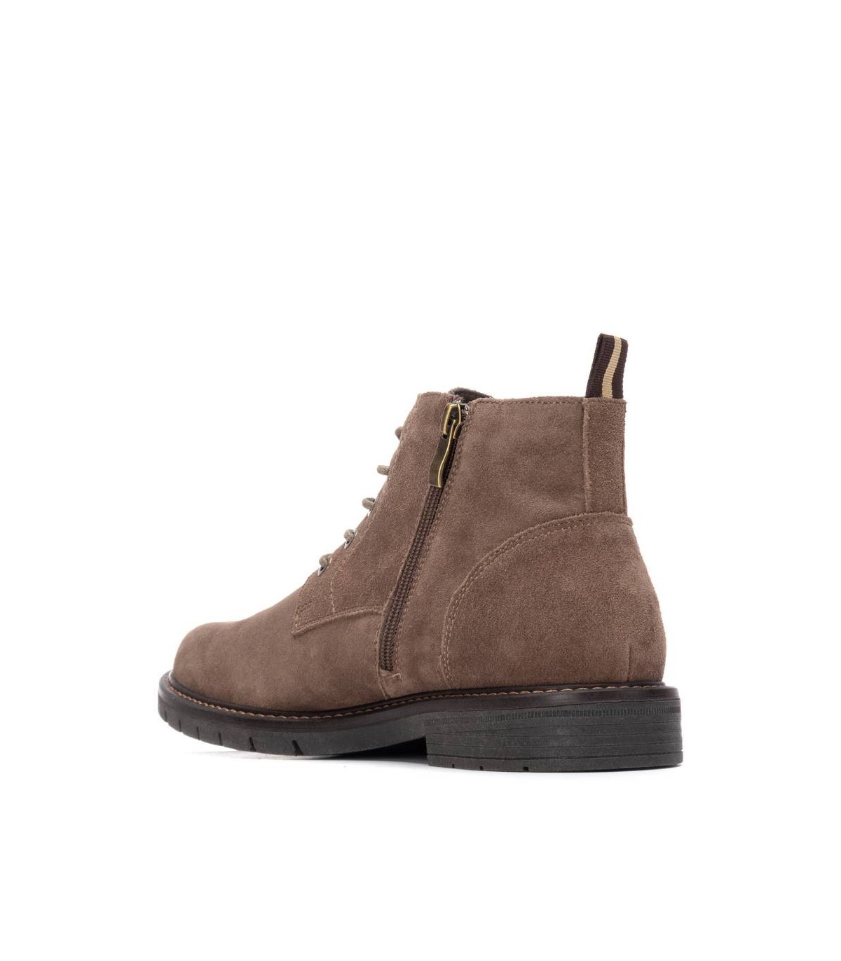 Botín de mujer, de la marca Carmela. Fabricado en un suave serraje. Cierre mediante cremallera lateral. Cordones ajustables. Tirador trasero para facilitar la puesta. Suela de goma antideslizante.