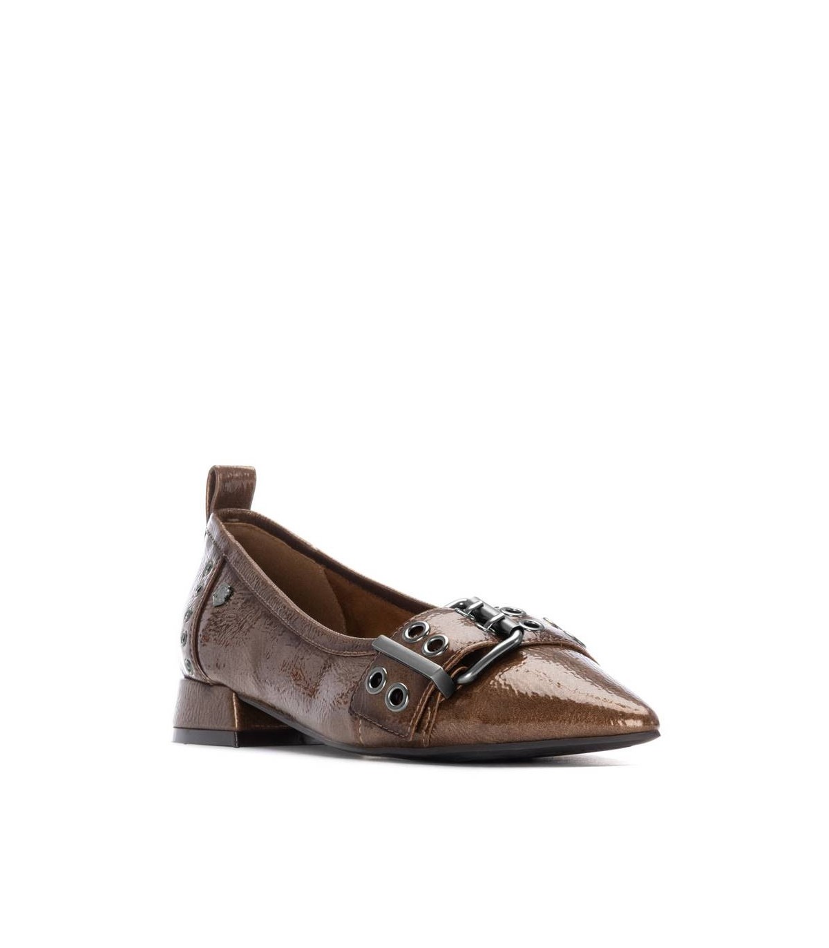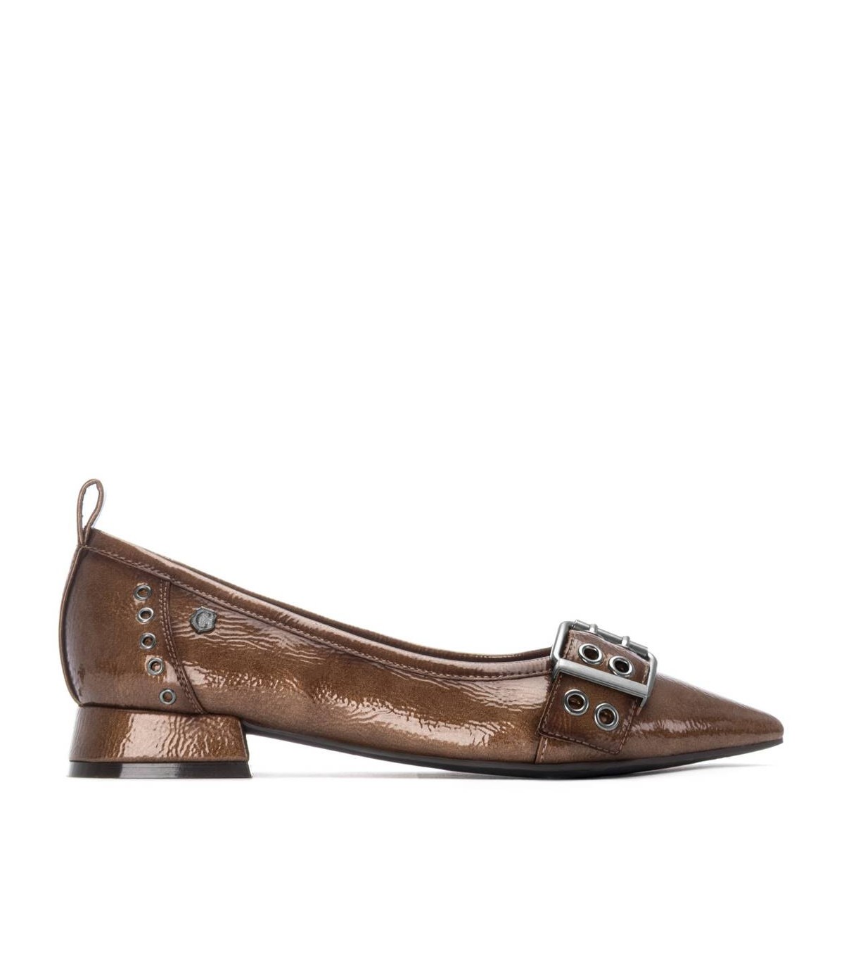 Zapato de mujer, de la marca Carmela. Fabricado en charol. Estilo bailarina con cierre mediante hebilla. Tirador trasero para facilitar la puesta. Decorado laterales metalizados. Plantilla extraíble