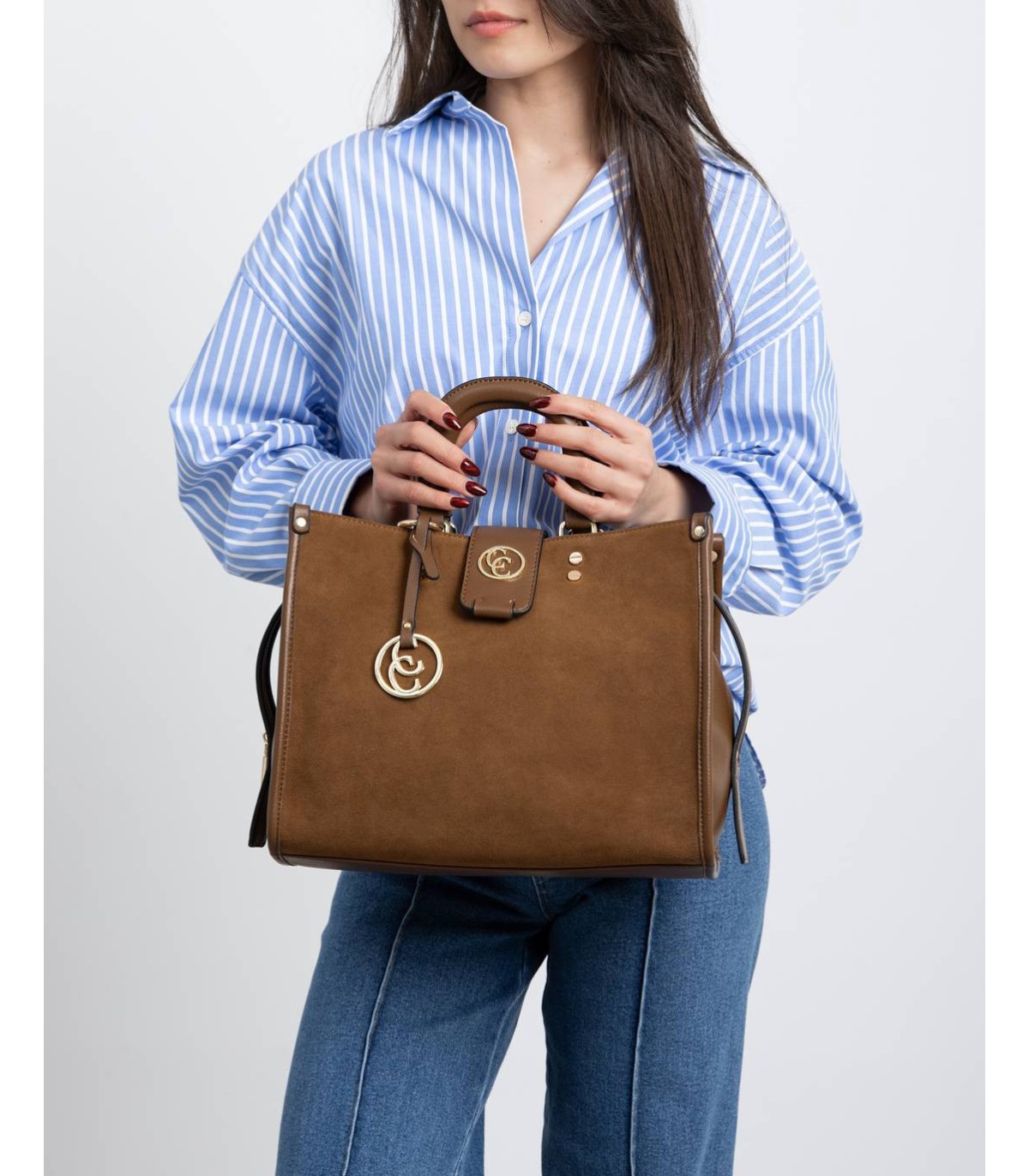 Bolso de piel de la marca Carmela con cierre de cremallera y bolsillos interiores. Medidas: 27x34x15