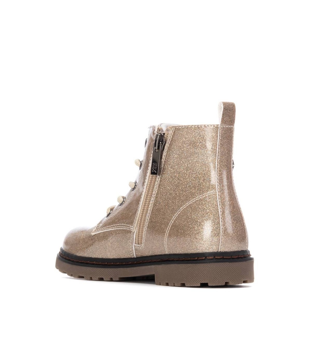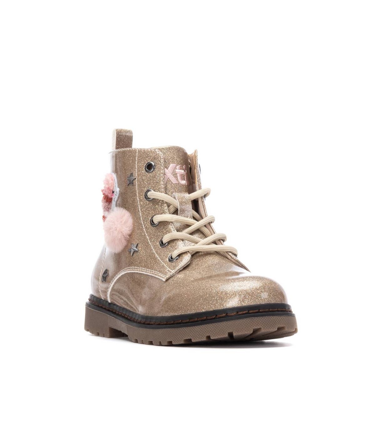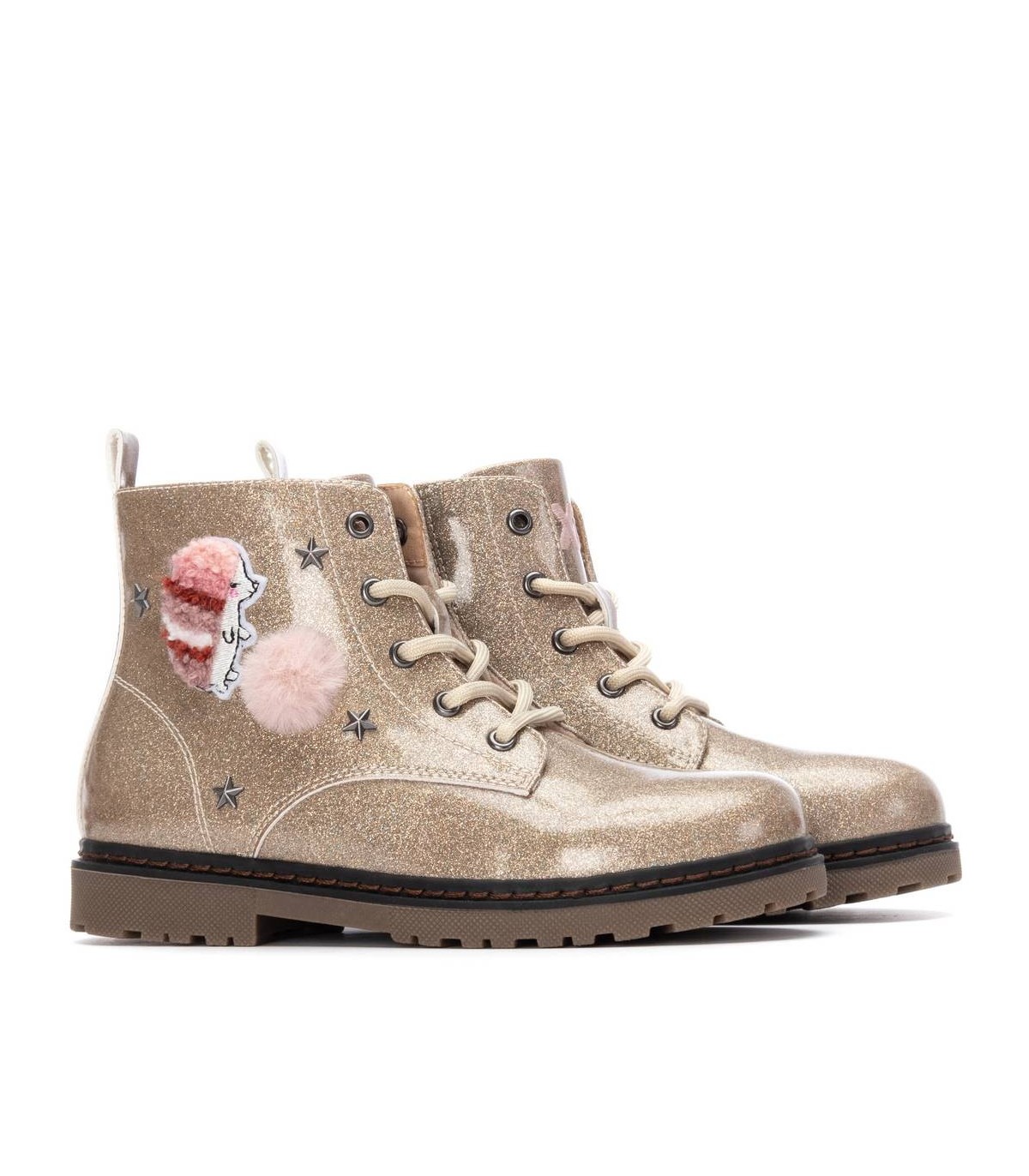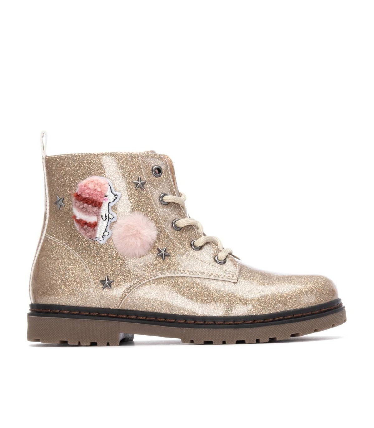 Botín estilo militar de niña, de la marca Xti Kids. Fabricado en charol con acabado glitter que aporta un brillo llamativo y moderno. Presenta un detalle decorativo cosido en el lateral con forma de erizo de animal, que añade un toque divertido y original al diseño. Suela de goma resistente que proporciona comodidad y buen agarre. Perfecto para un look con personalidad y estilo único.