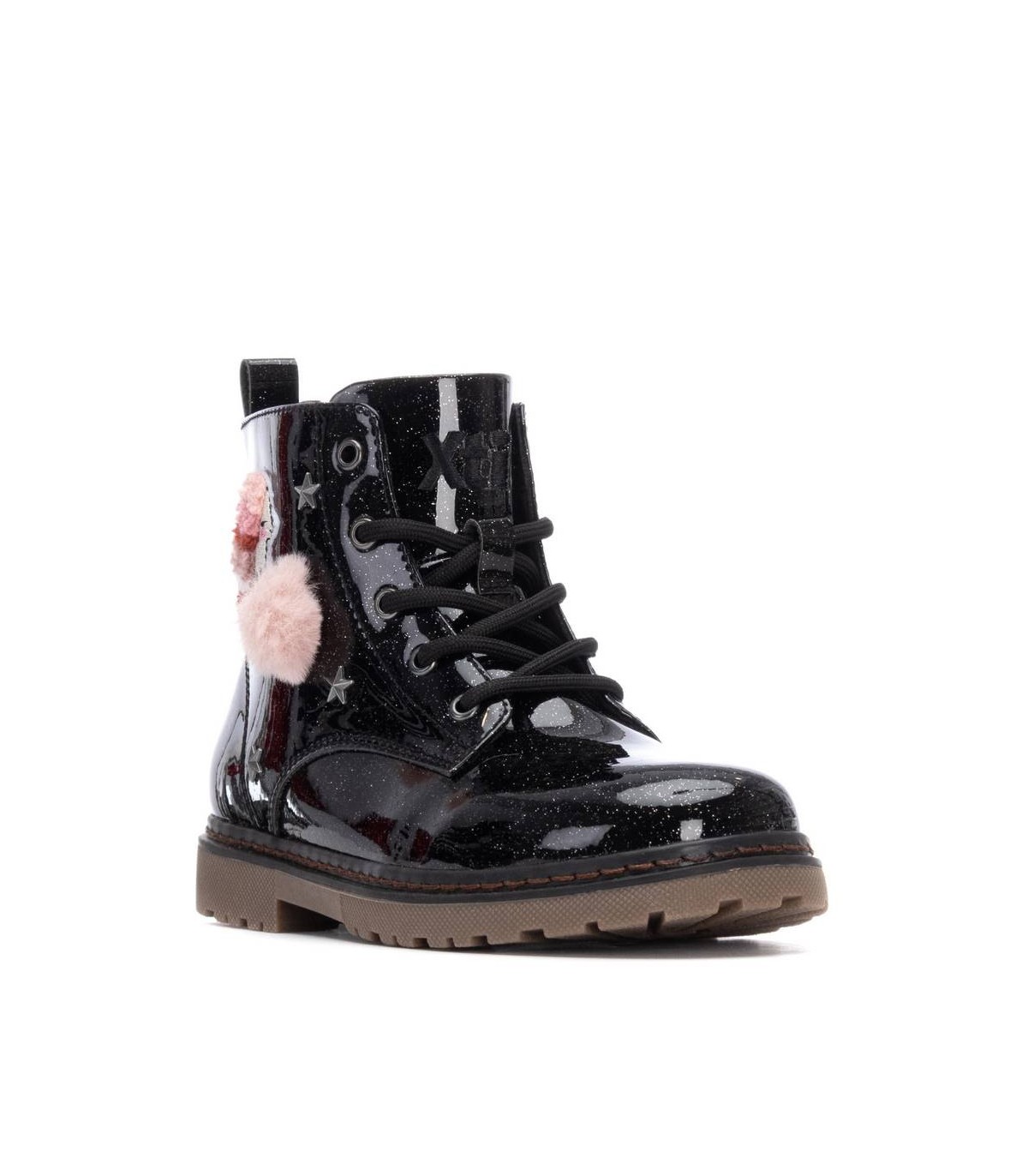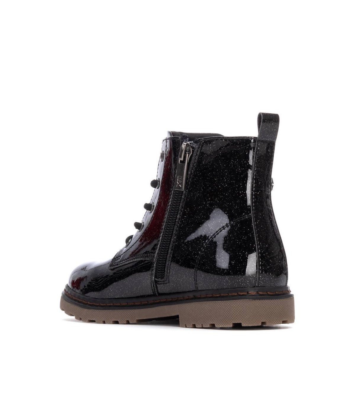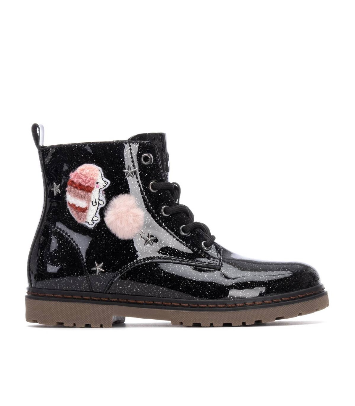 Botín estilo militar de niña, de la marca Xti Kids. Fabricado en charol con acabado glitter que aporta un brillo llamativo y moderno. Presenta un detalle decorativo cosido en el lateral con forma de erizo de animal, que añade un toque divertido y original al diseño. Suela de goma resistente que proporciona comodidad y buen agarre. Perfecto para un look con personalidad y estilo único.