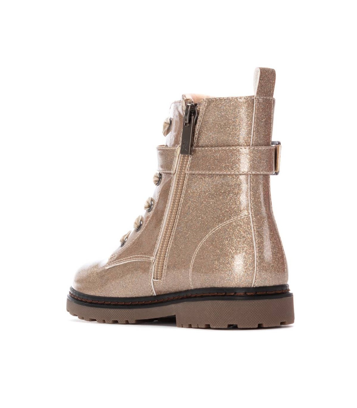Botín estilo militar de niña, de la marca Xti Kids. Fabricado en charol con acabado glitter que aporta un brillo llamativo y moderno. Presenta estrellas decorativas en el lateral que añaden un toque divertido y estilizado. Además, cuenta con una tira lateral con hebilla que aporta un detalle original y elegante al diseño. Suela de goma resistente que garantiza comodidad y buen agarre. Perfecto para un look con personalidad y estilo único.