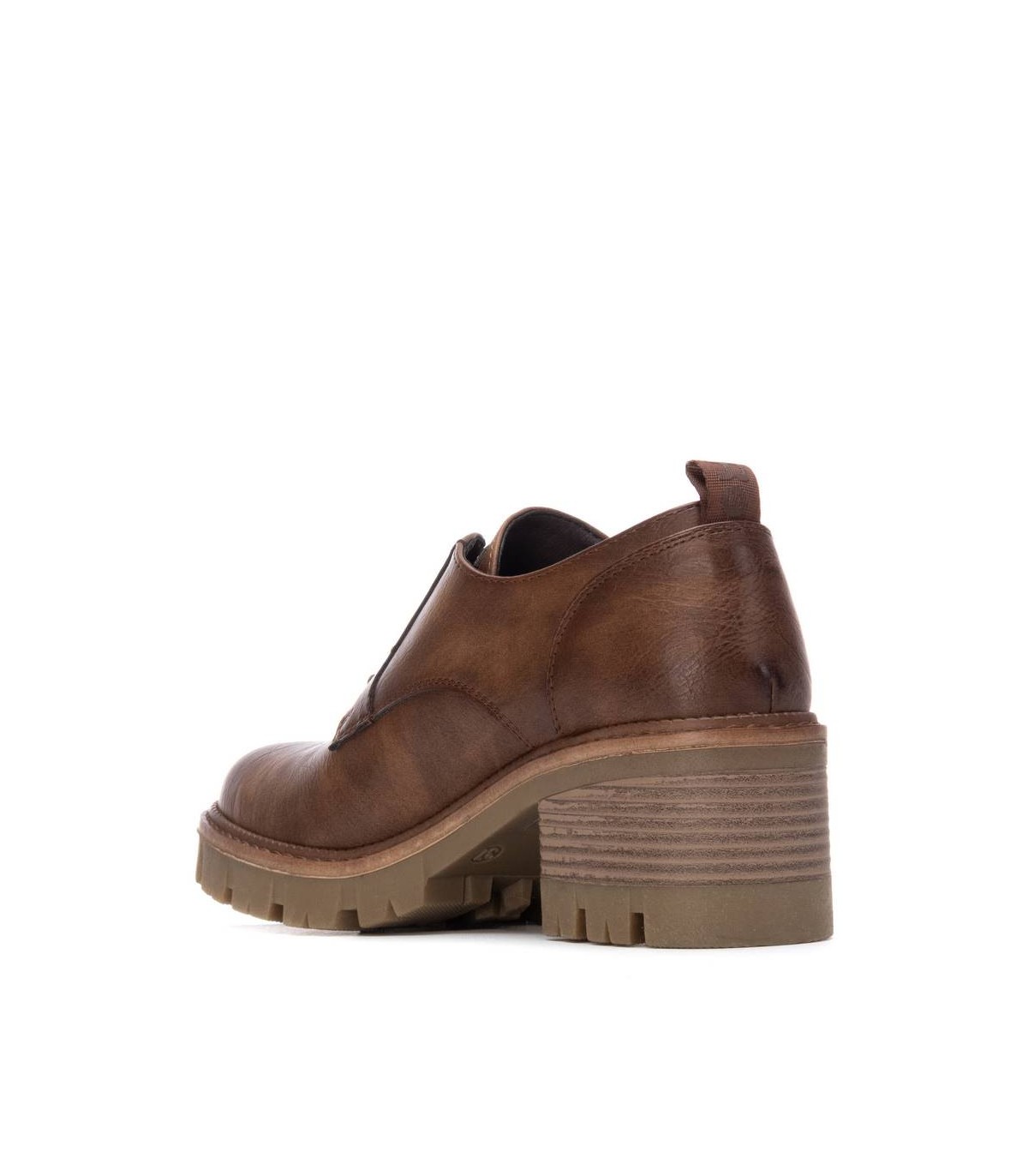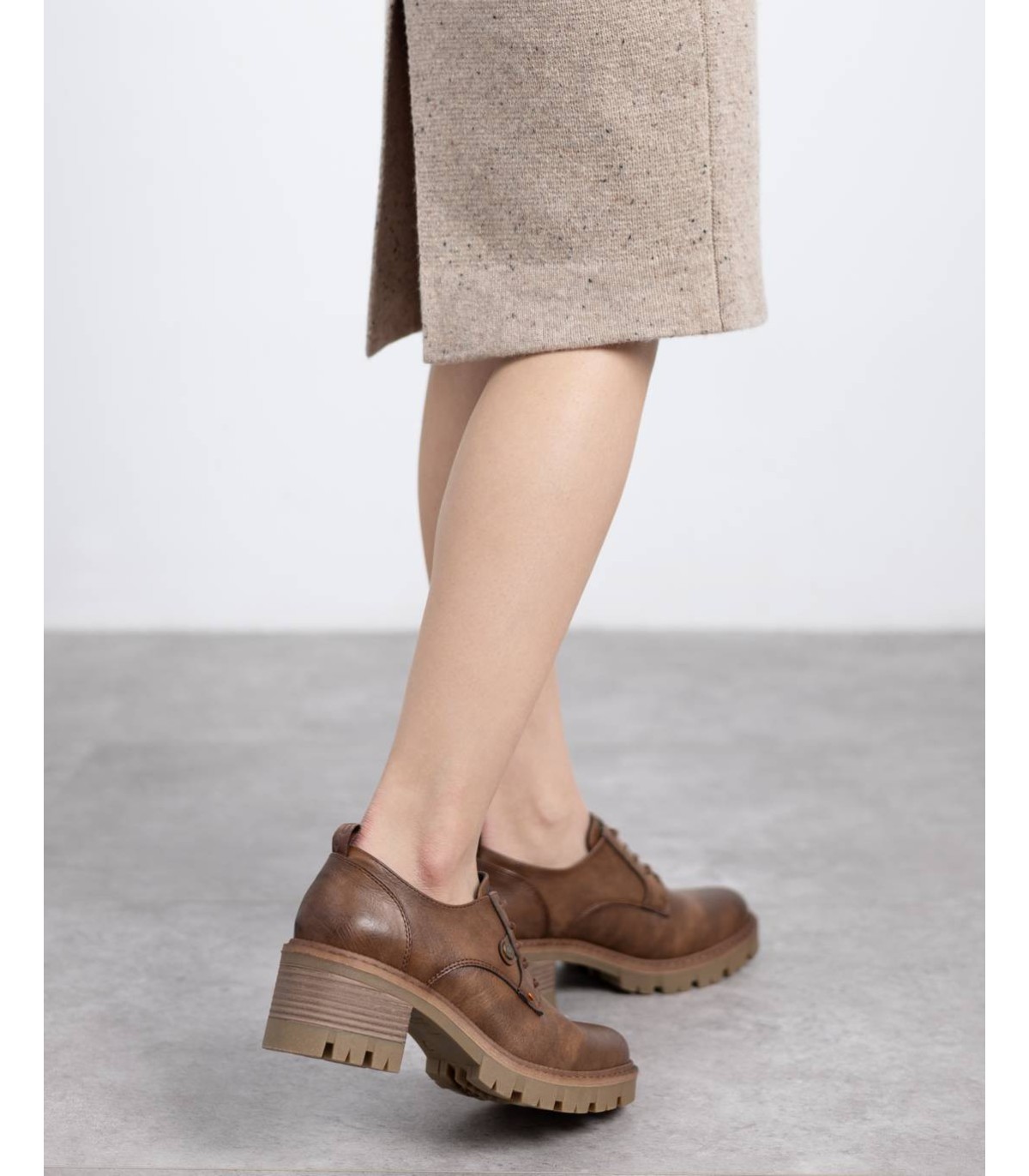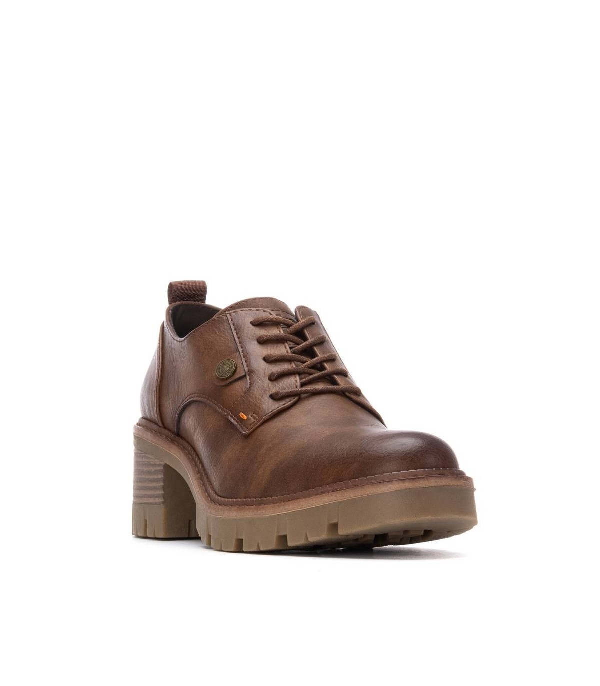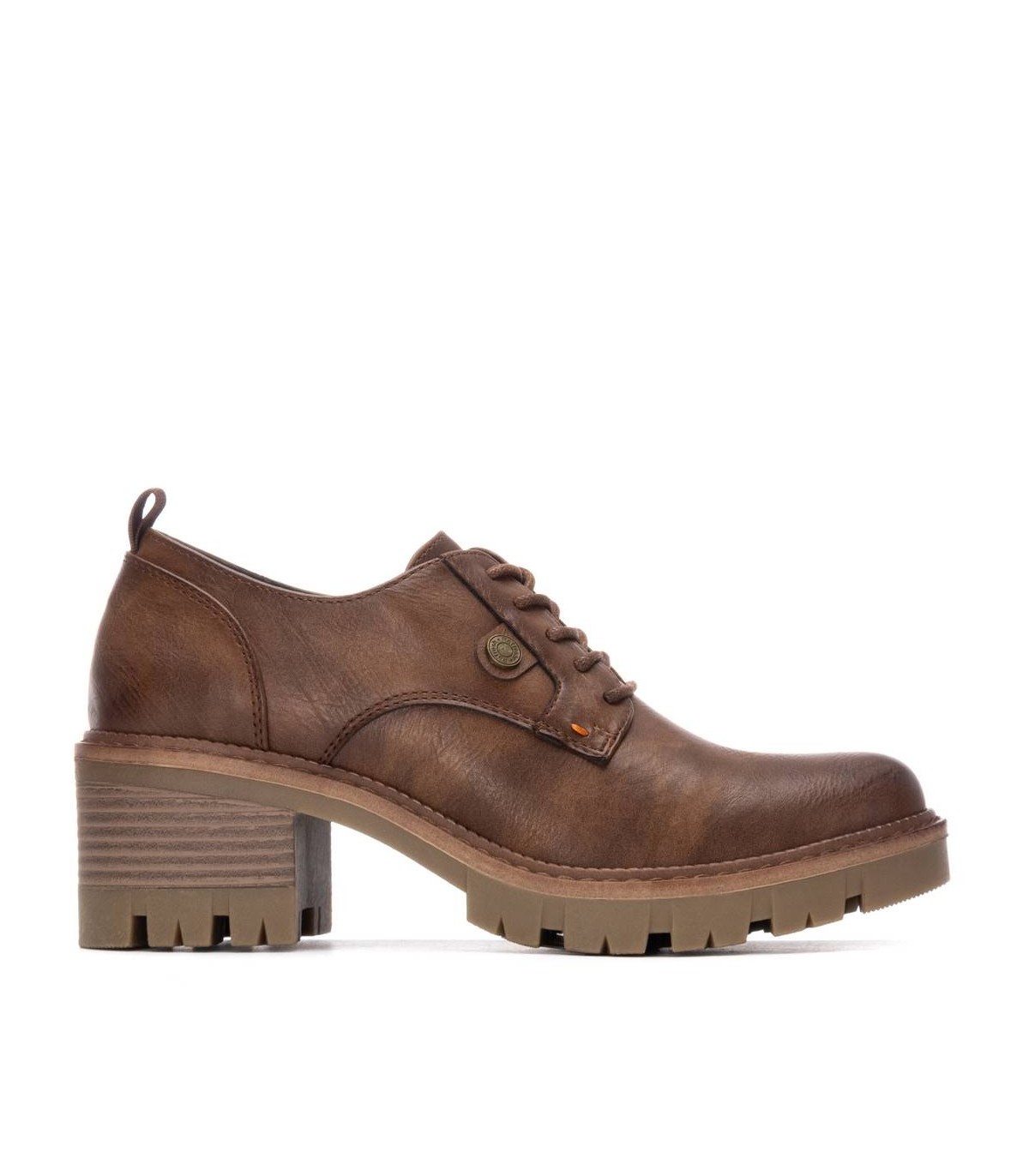 Zapato tipo mocasin de mujer. Marca Refresh. Fabricado en material que imita a la piel. Cierre mediante cordones encerados. Tirador trasero. Tacón en bloque de 6 cm. Plantilla extraíble. Este modelo ha obtenido el certificado vegano por la organización mundial PETA (Organización de los derechos de los animales).