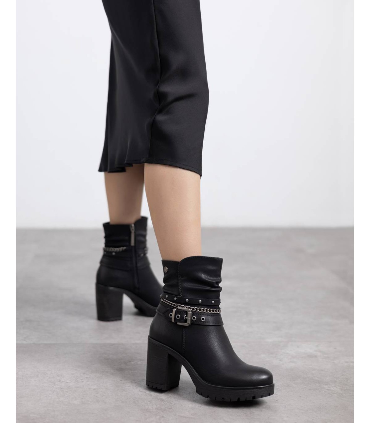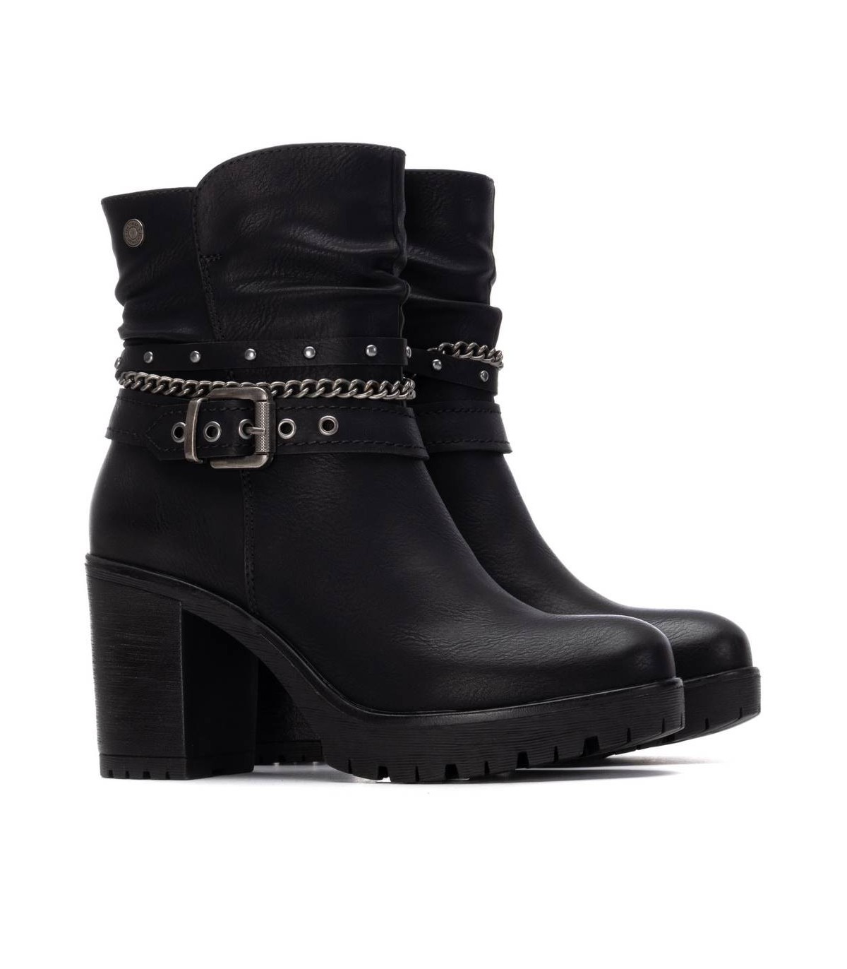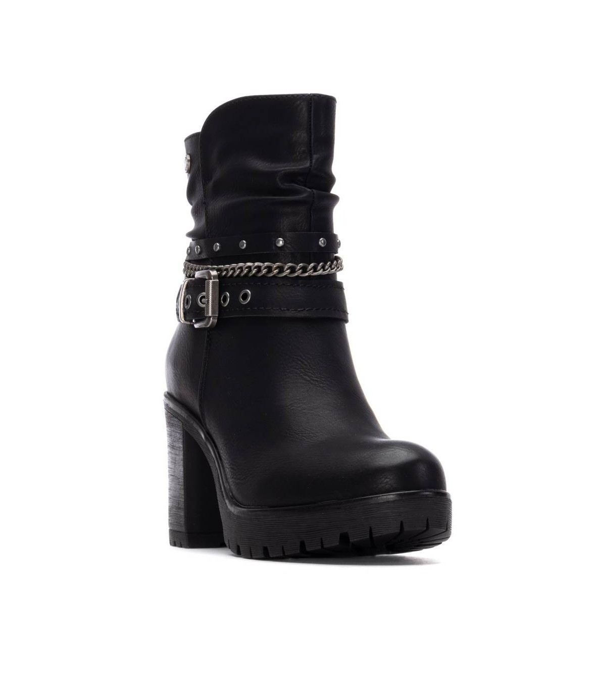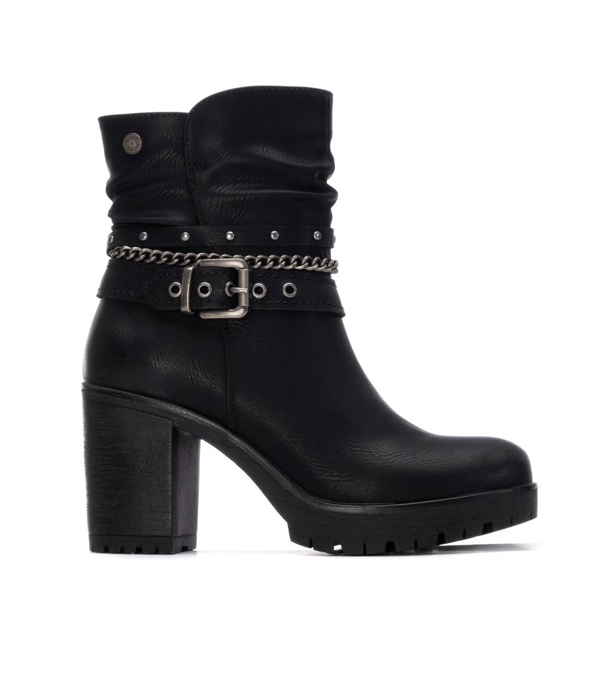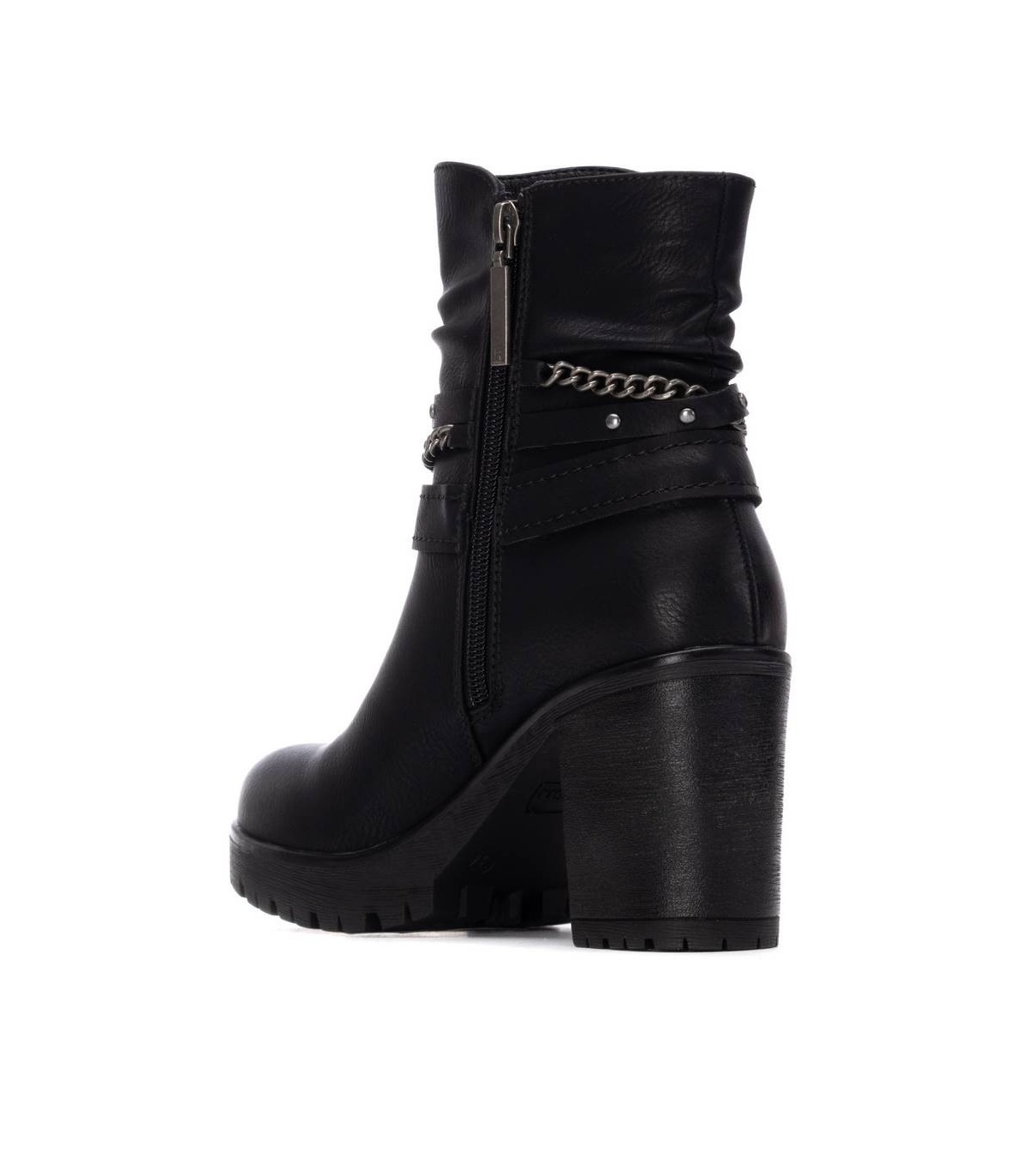 Botín de mujer, de la marca Refresh. Fabricado en material que imita a la piel. Cintas y correas al tobillo decorativas. Cierre mediante cremallera interior. Tacón de 9 cm con suela de goma antideslizante. Con plantilla extraíble. Este modelo ha obtenido el certificado vegano por la organización mundial PETA (Organización de los derechos de los animales).