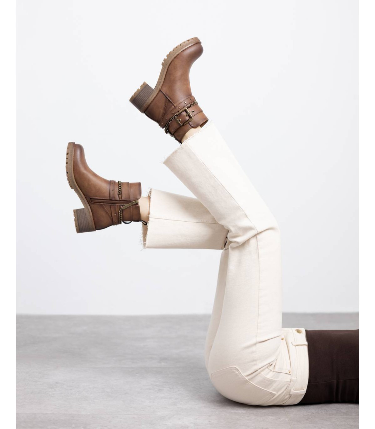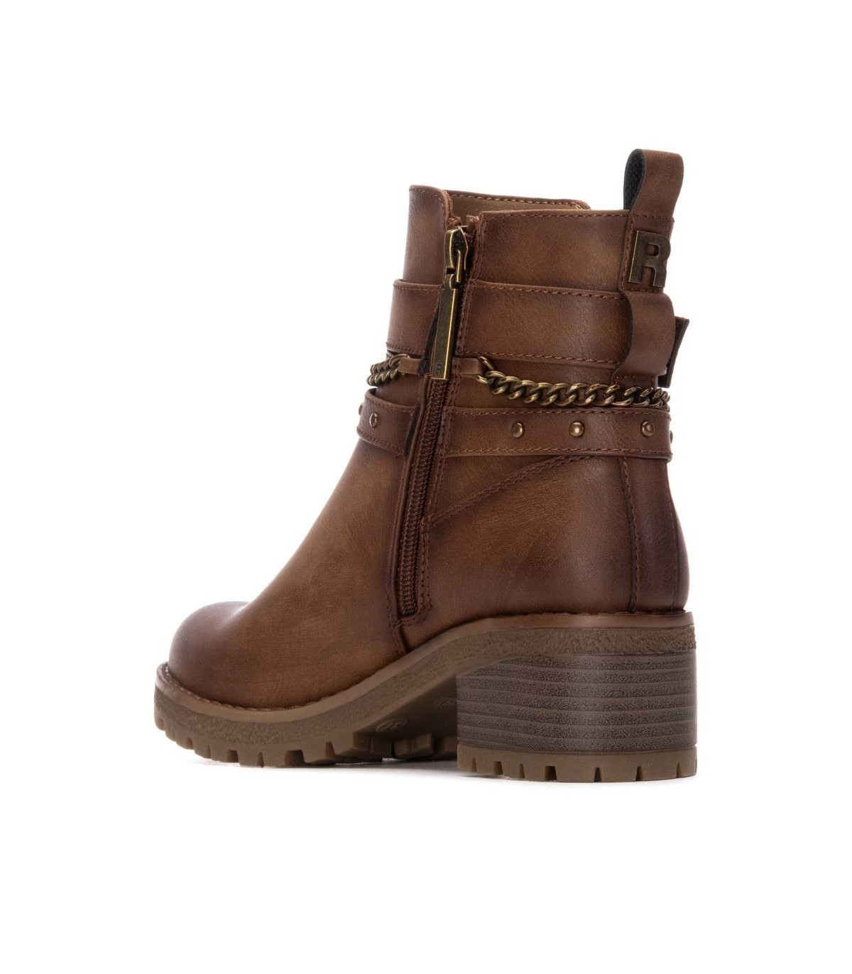 Botín de mujer, de la marca Refresh. Fabricado en material que imita a la piel. Cintas y correas al tobillo decorativas. Cierre mediante cremallera interior. Tirador trasero para facilitar la puesta. Tacón de 5 cm con suela de goma antideslizante. Con plantilla extraíble. Este modelo ha obtenido el certificado vegano por la organización mundial PETA (Organización de los derechos de los animales).