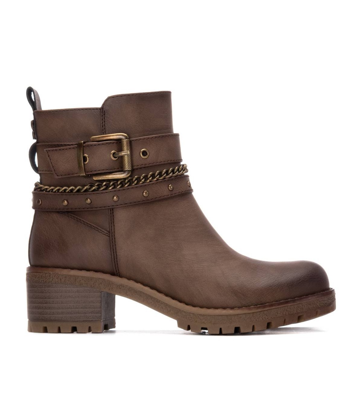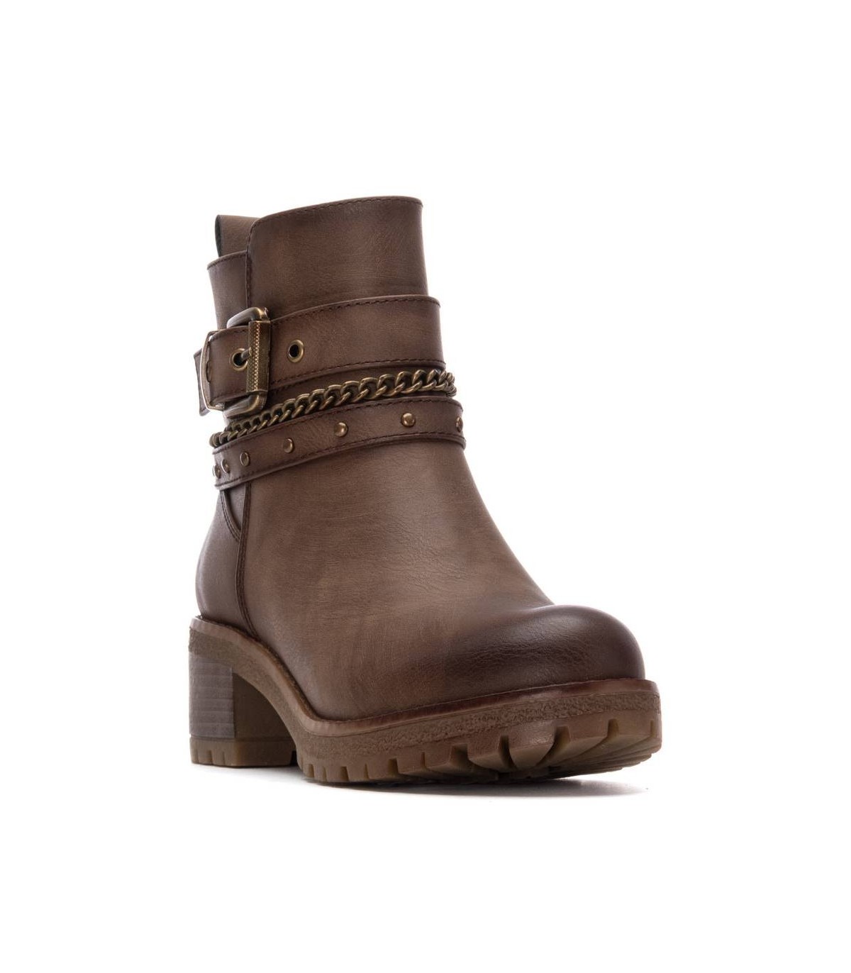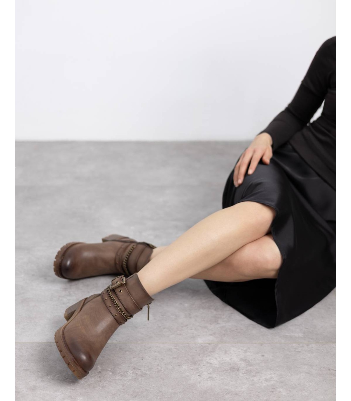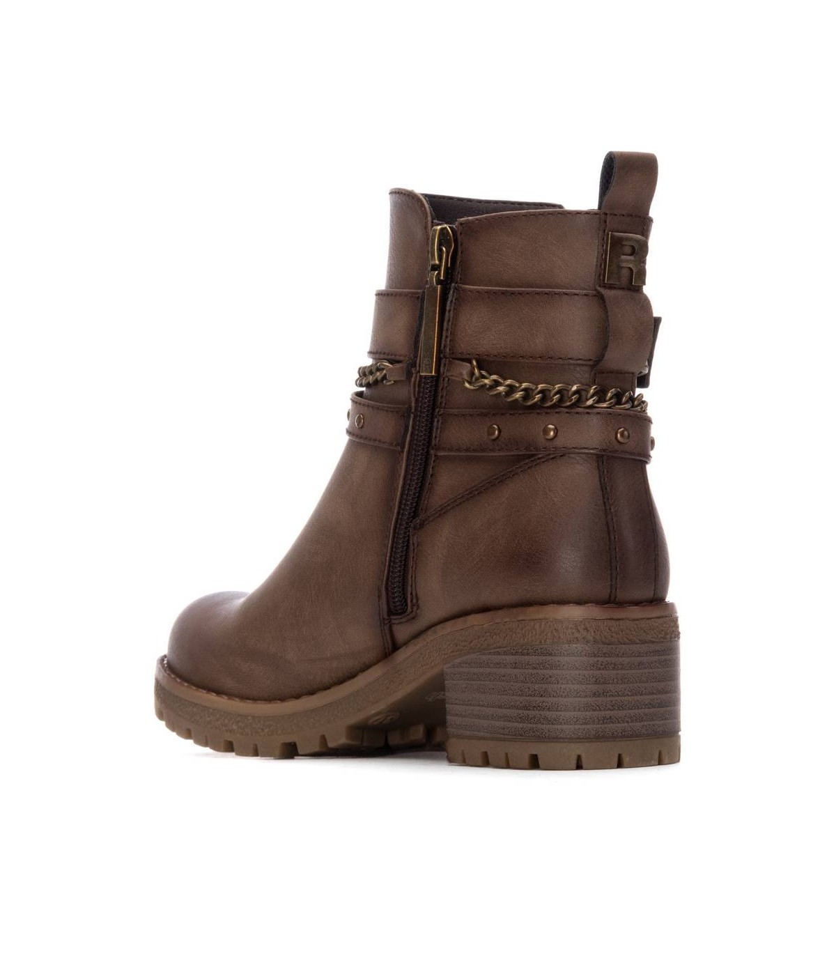 Botín de mujer, de la marca Refresh. Fabricado en material que imita a la piel. Cintas y correas al tobillo decorativas. Cierre mediante cremallera interior. Tirador trasero para facilitar la puesta. Tacón de 5 cm con suela de goma antideslizante. Con plantilla extraíble. Este modelo ha obtenido el certificado vegano por la organización mundial PETA (Organización de los derechos de los animales).