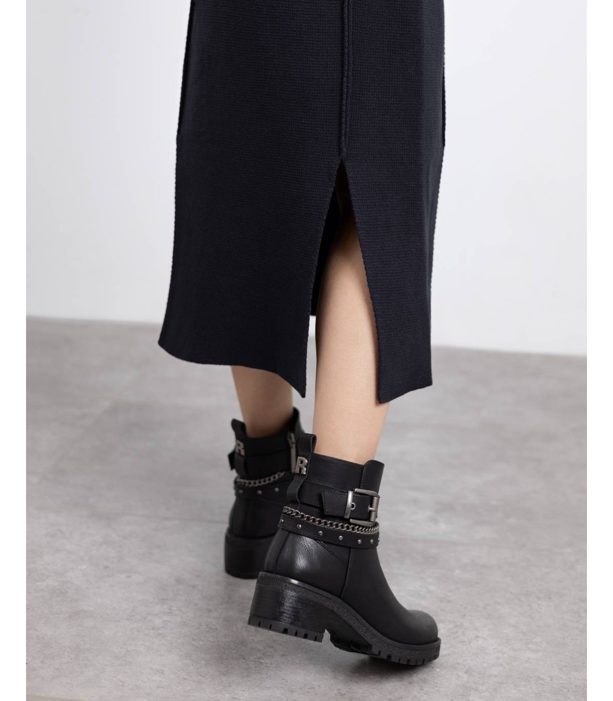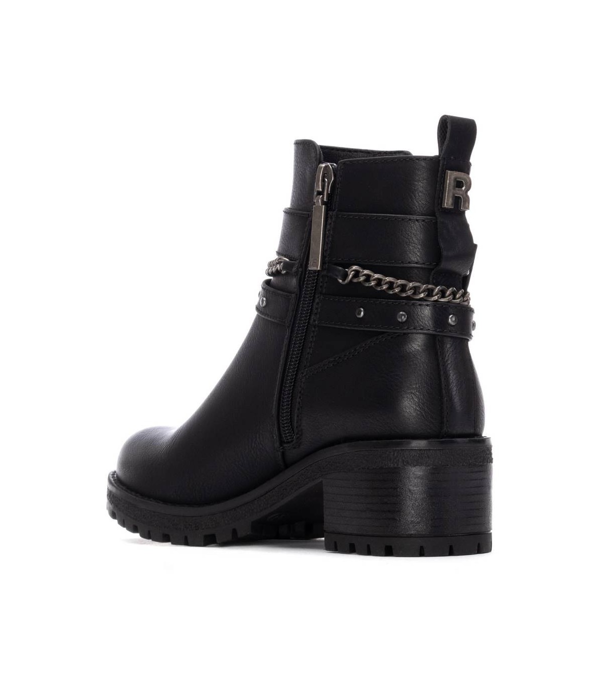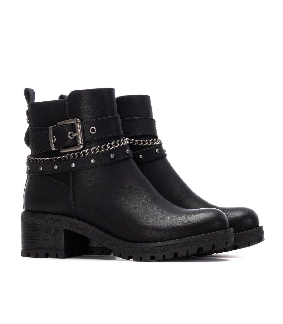 Botín de mujer, de la marca Refresh. Fabricado en material que imita a la piel. Cintas y correas al tobillo decorativas. Cierre mediante cremallera interior. Tirador trasero para facilitar la puesta. Tacón de 5 cm con suela de goma antideslizante. Con plantilla extraíble. Este modelo ha obtenido el certificado vegano por la organización mundial PETA (Organización de los derechos de los animales).