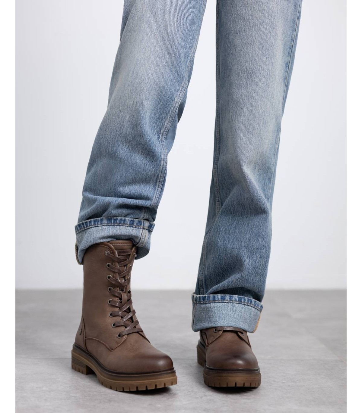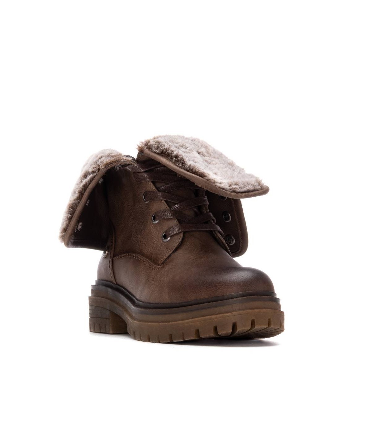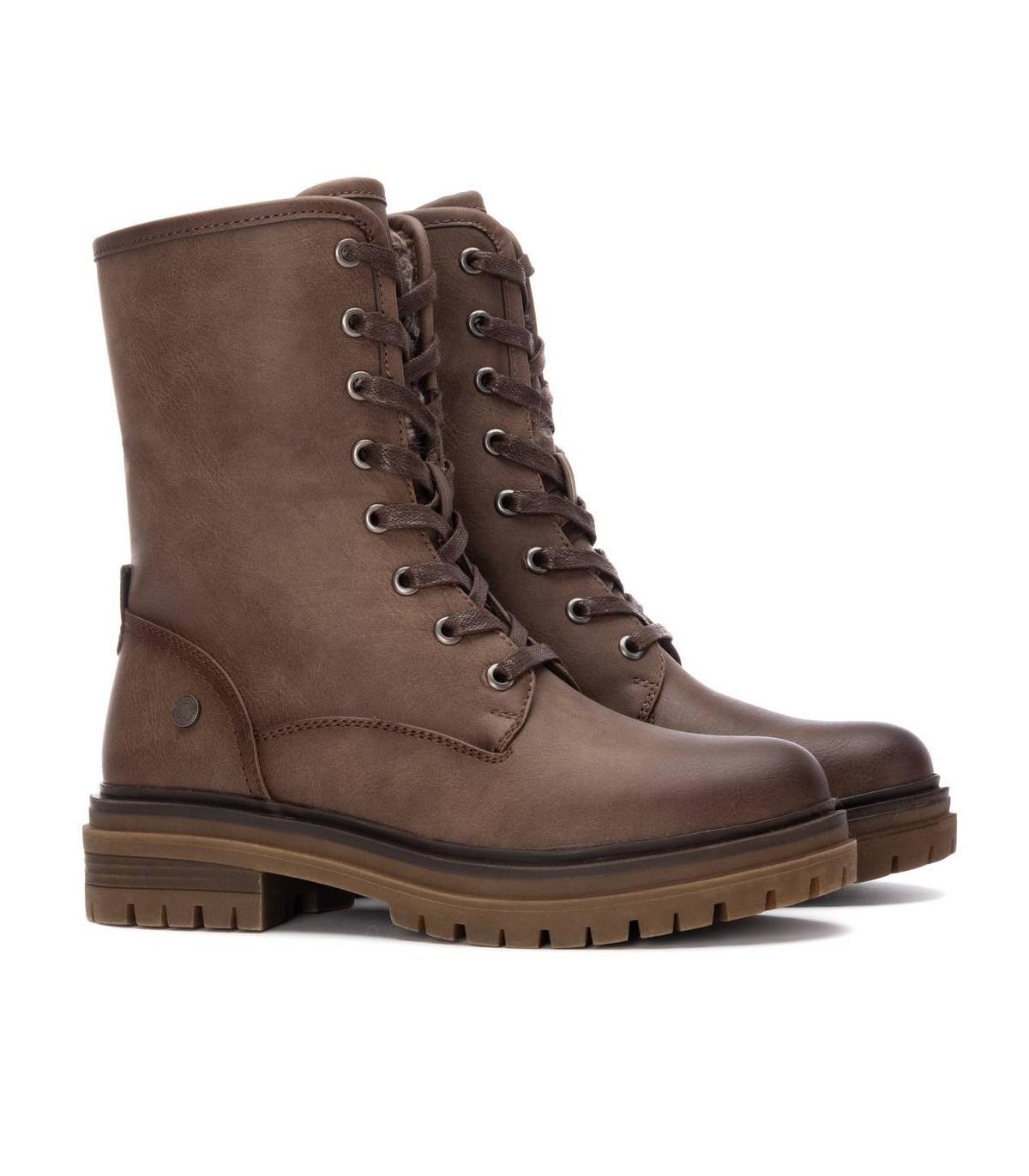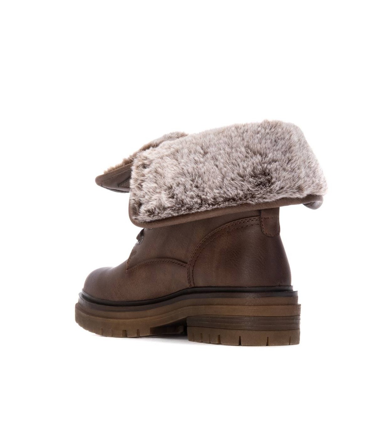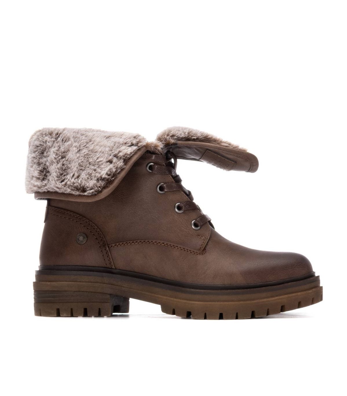 Botín de mujer, de la marca Refresh. Fabricado en material que imita a la piel con interior en pelito para los días más fríos. Cierre mediante cordones regulables. Gruesa suela de goma antideslizante. Con plantilla extraíble. Este modelo ha obtenido el certificado vegano por la organización mundial PETA (Organización de los derechos de los animales).
