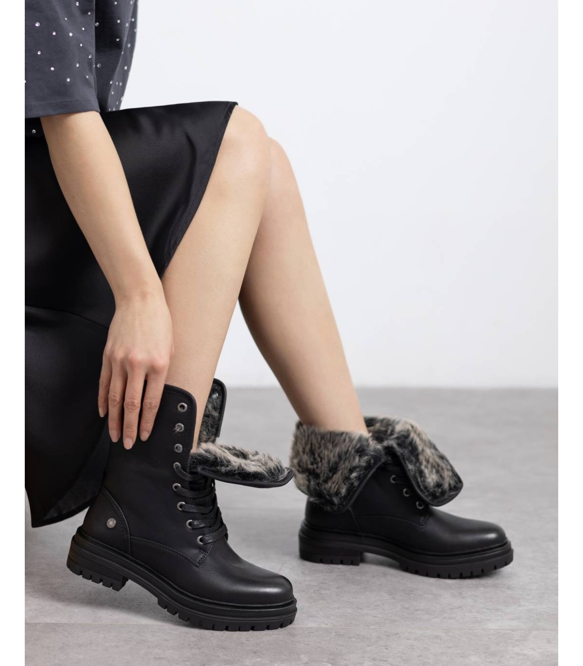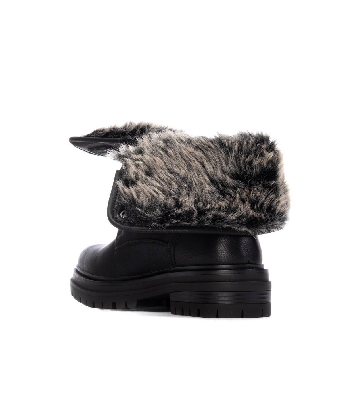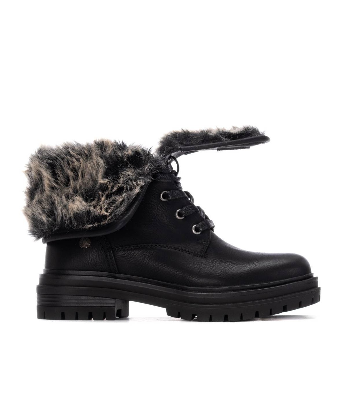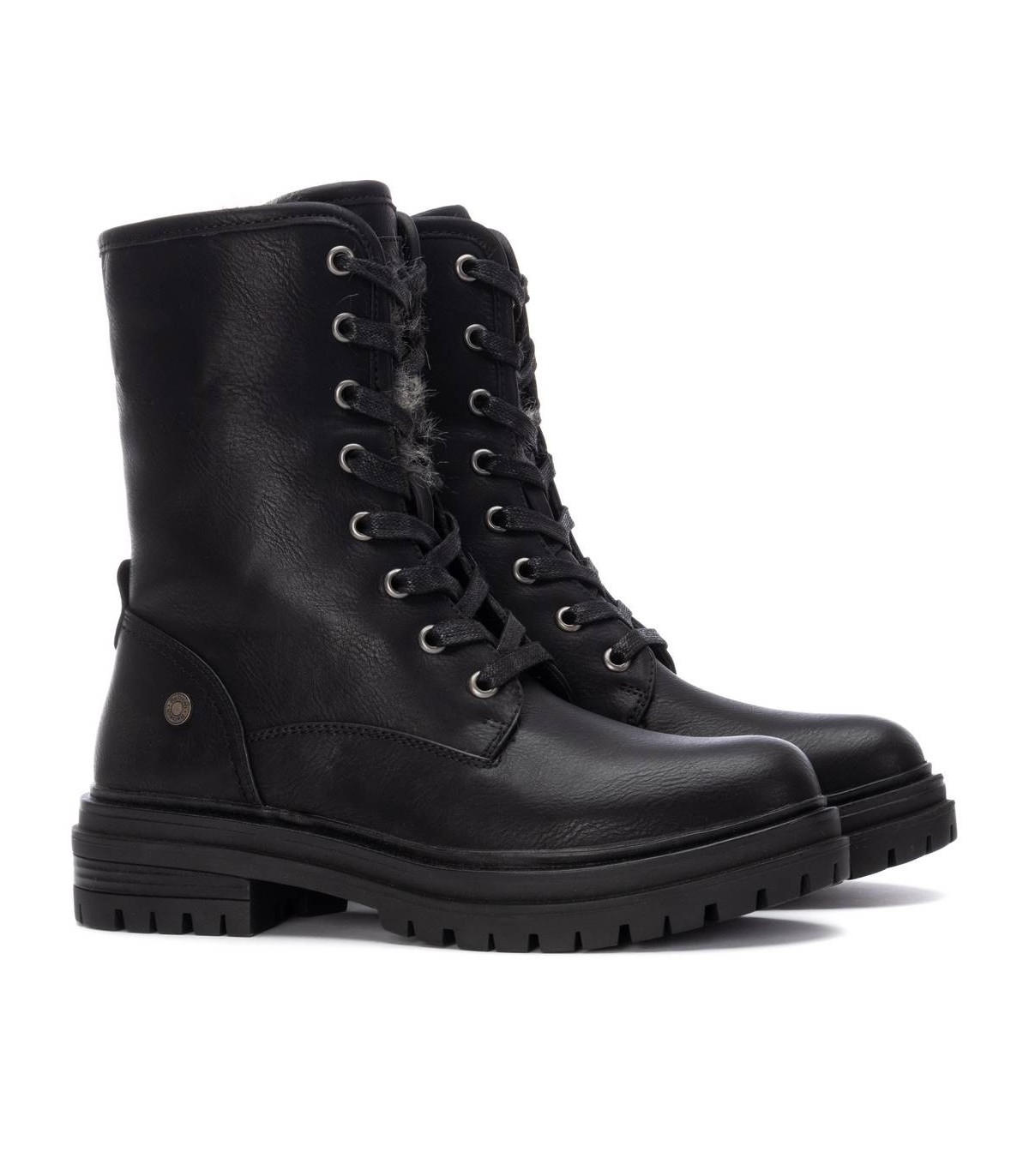 Botín de mujer, de la marca Refresh. Fabricado en material que imita a la piel con interior en pelito para los días más fríos. Cierre mediante cordones regulables. Gruesa suela de goma antideslizante. Con plantilla extraíble. Este modelo ha obtenido el certificado vegano por la organización mundial PETA (Organización de los derechos de los animales).