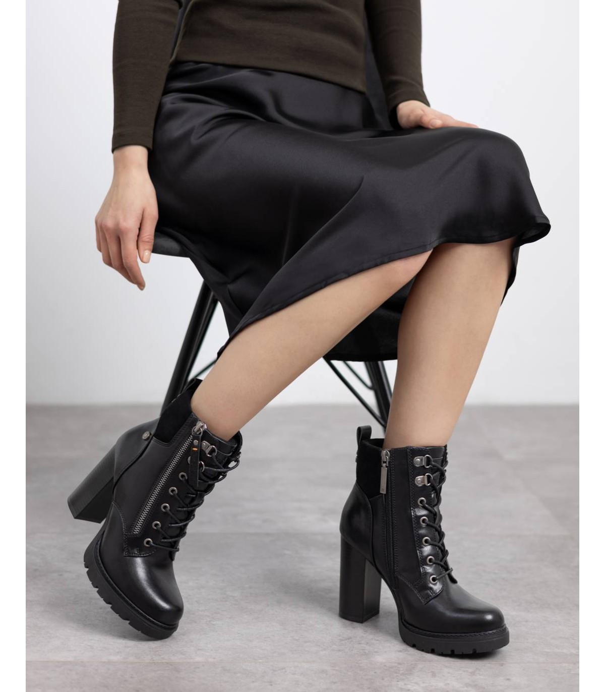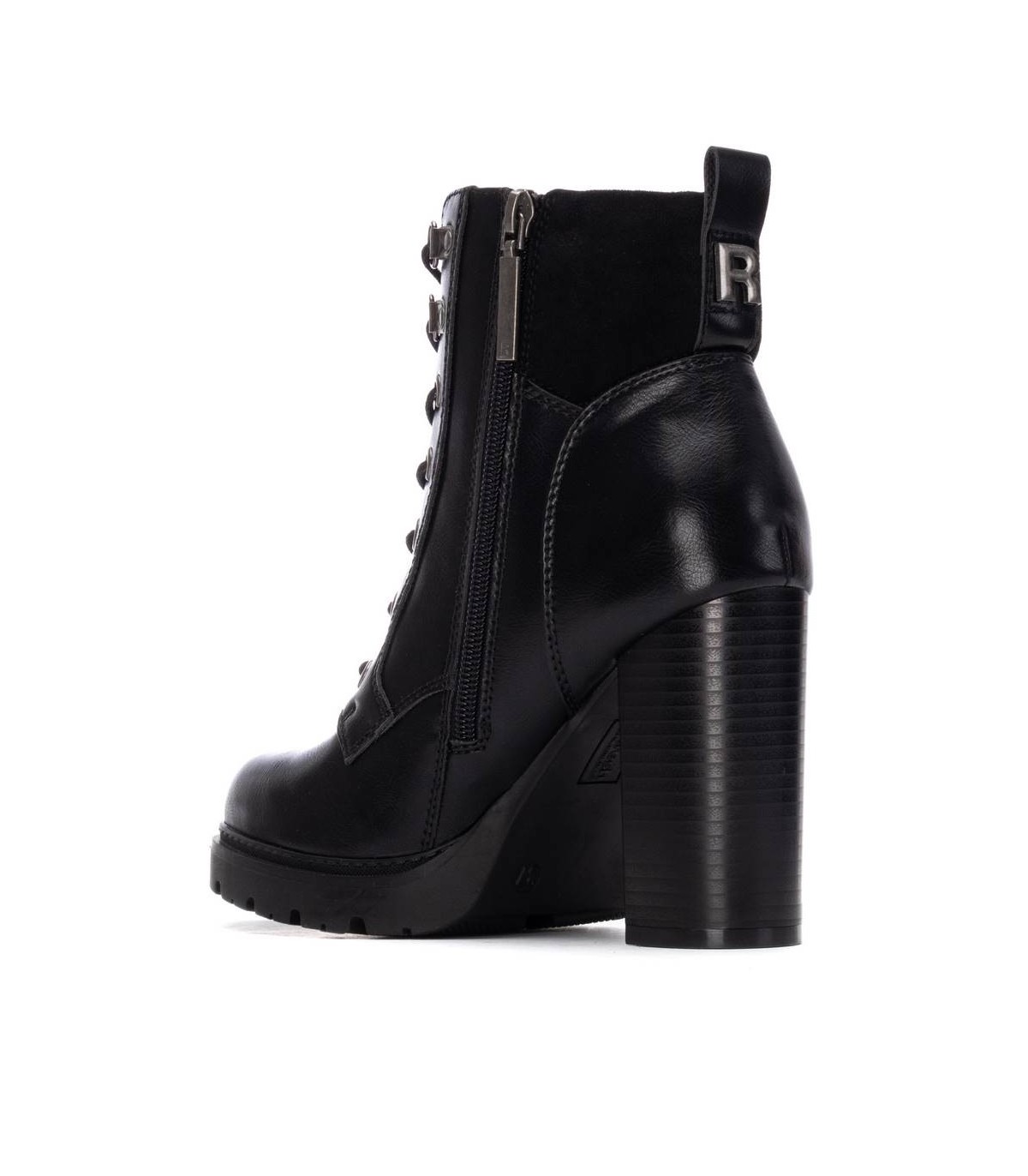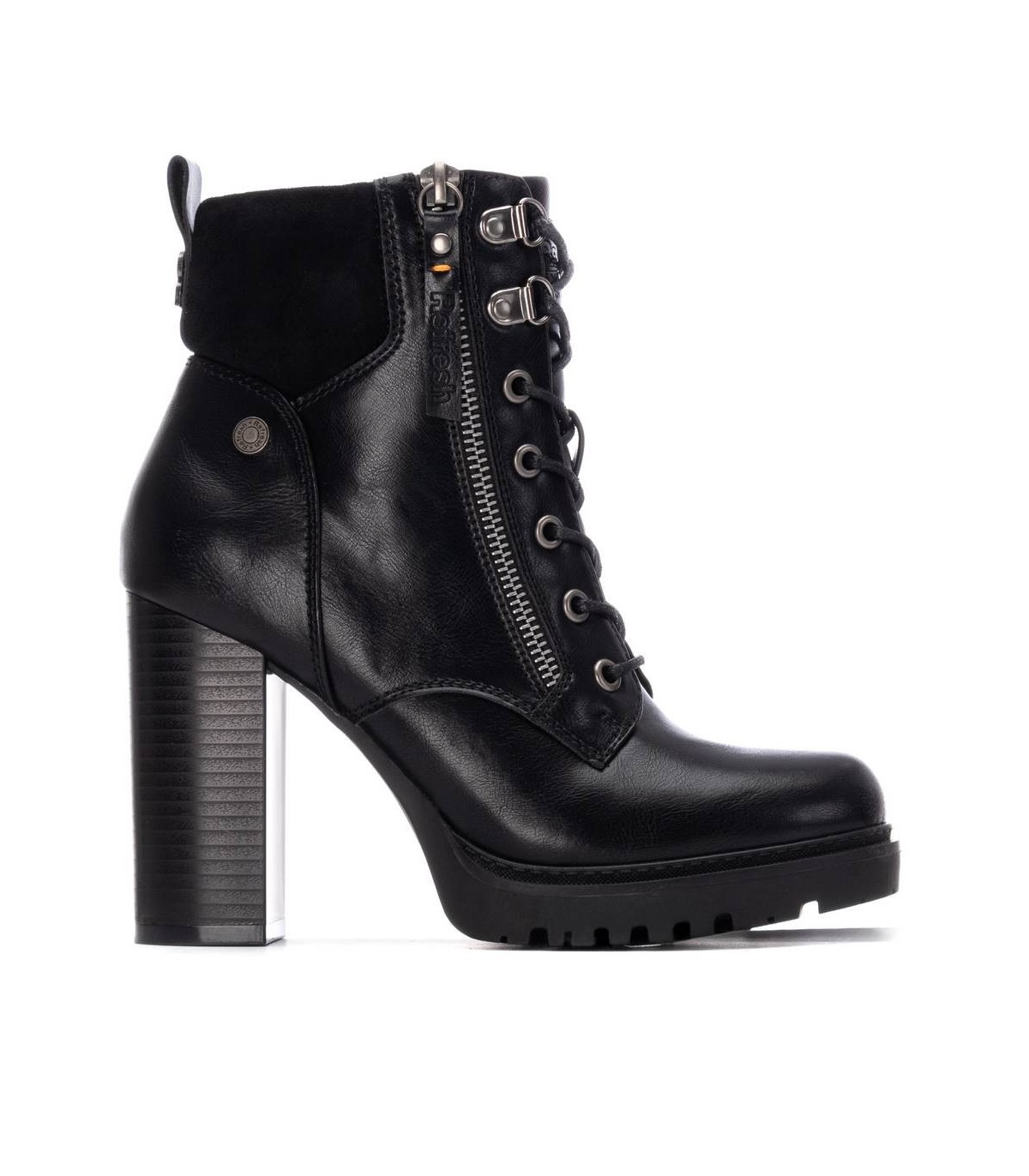 Botín de mujer, de la marca Refresh. Fabricado en un material que imita la piel. Collarín textil para más comodidad. Cierre mediante cremallera interior y cordones para un buen ajuste. Tirador trasero para facilitar la puesta. Tacón 10 cm con plataforma antideslizante para mayor comodidad. Este modelo ha obtenido el certificado vegano por la organización mundial PETA (Organización de los derechos de los animales).
