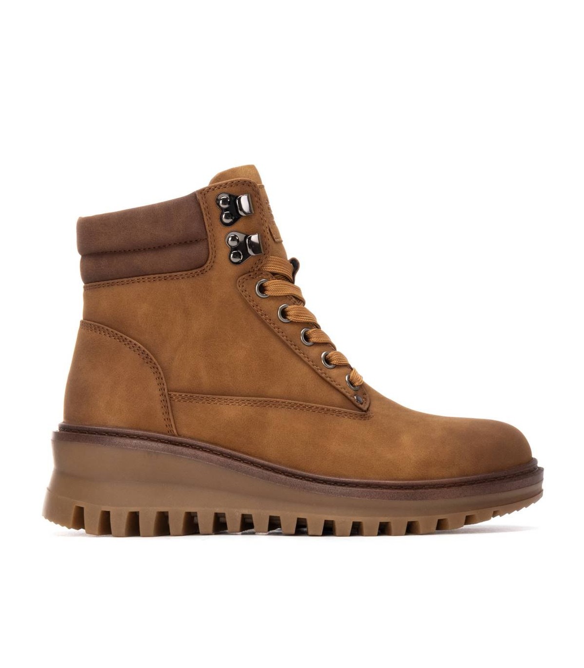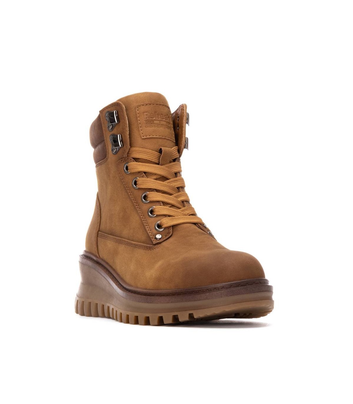 Botín de mujer, de la marca Refresh. Fabricada en material que imita a la piel. Collarín acolchado para mayor comodidad. Cierre mediante cremallera interior. Cordones regulables al tono. Suela volumen dentada de goma antideslizante. Plantilla extraíble. Este modelo ha obtenido el certificado vegano por la organización mundial PETA (Organización de los derechos de los animales).