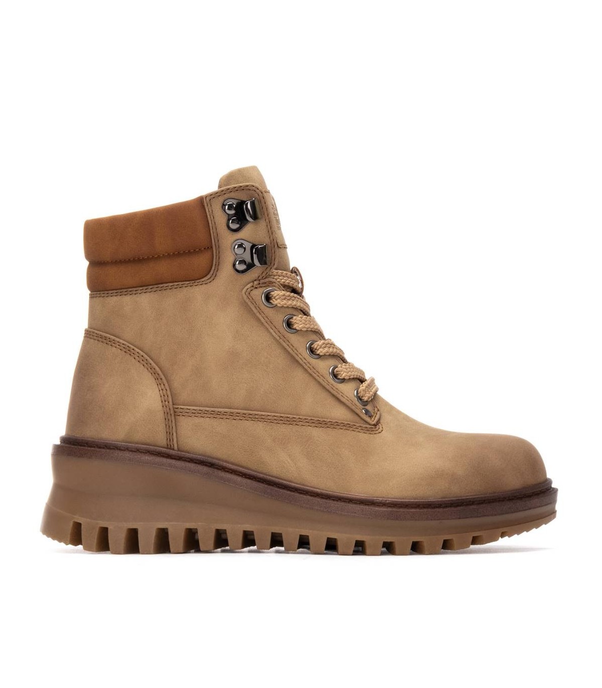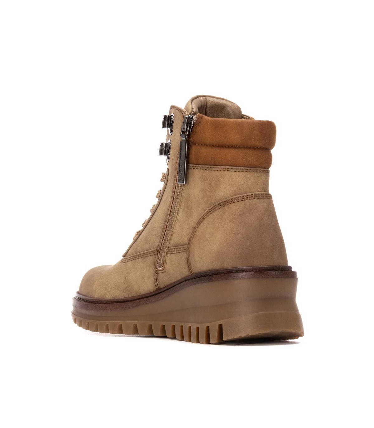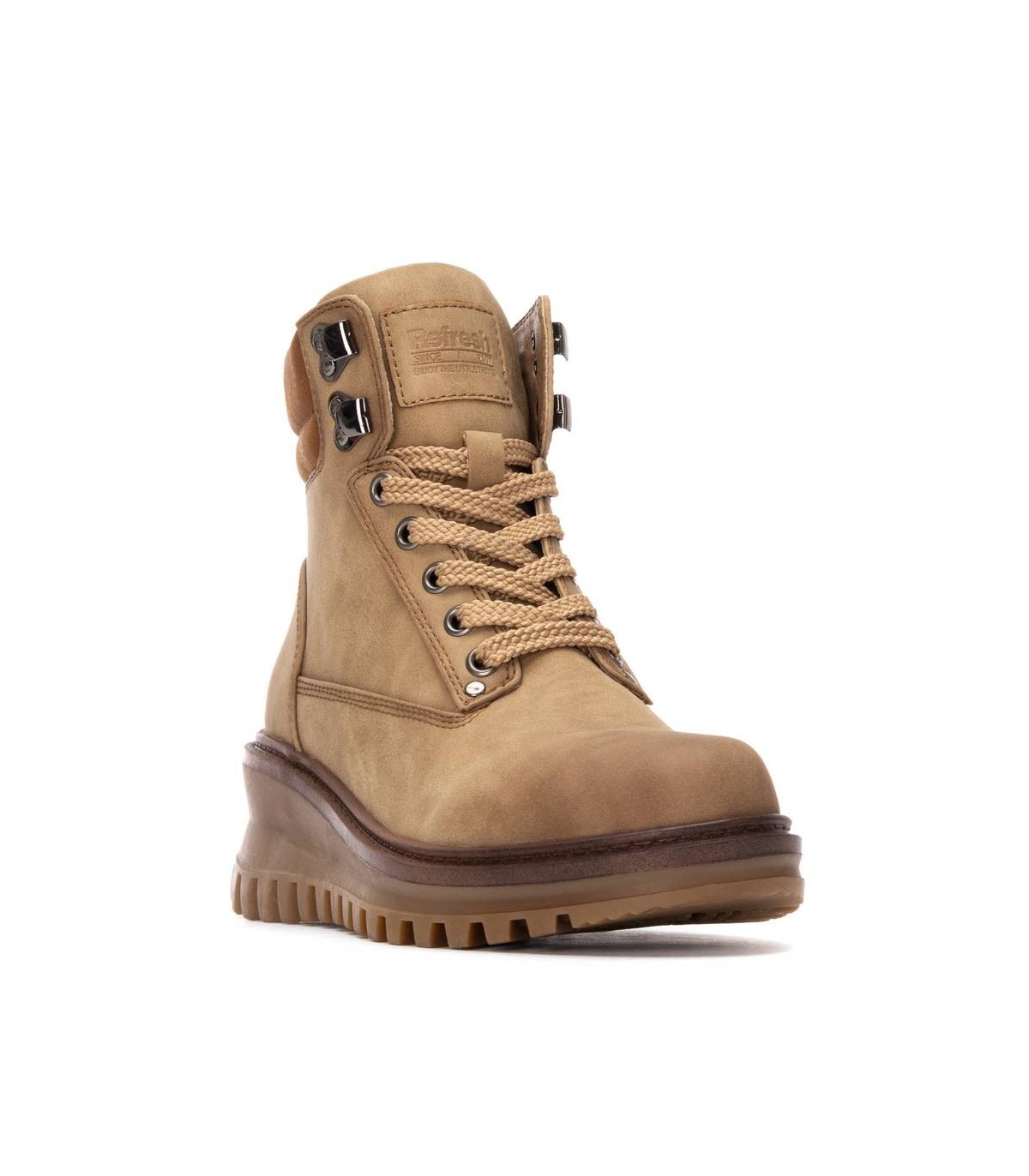 Botín de mujer, de la marca Refresh. Fabricada en material que imita a la piel. Collarín acolchado para mayor comodidad. Cierre mediante cremallera interior. Cordones regulables al tono. Suela volumen dentada de goma antideslizante. Plantilla extraíble. Este modelo ha obtenido el certificado vegano por la organización mundial PETA (Organización de los derechos de los animales).