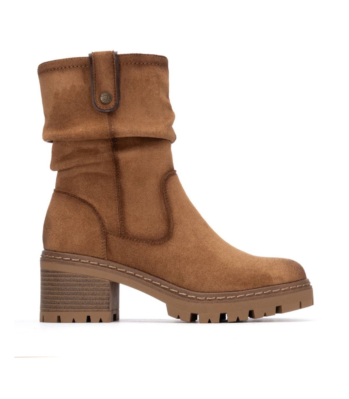 Botín de mujer, de la marca Refresh. Fabricado en una suave antelina. Cierre mediante cremallera interior. Tirador lateral para facilitar el calce. Suela track antideslizante con tacón y plataforma para mayor comodidad. Con plantilla extraíble. Este modelo ha obtenido el certificado vegano por la organización mundial PETA (Organización de los derechos de los animales).