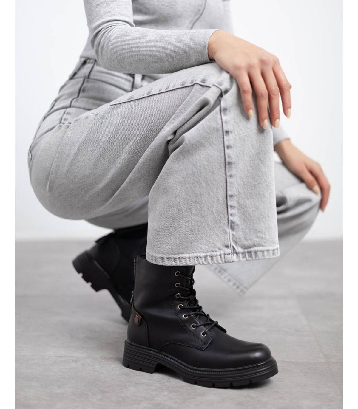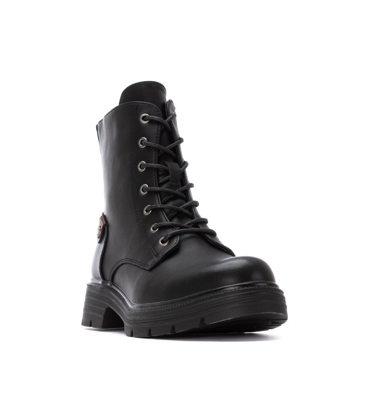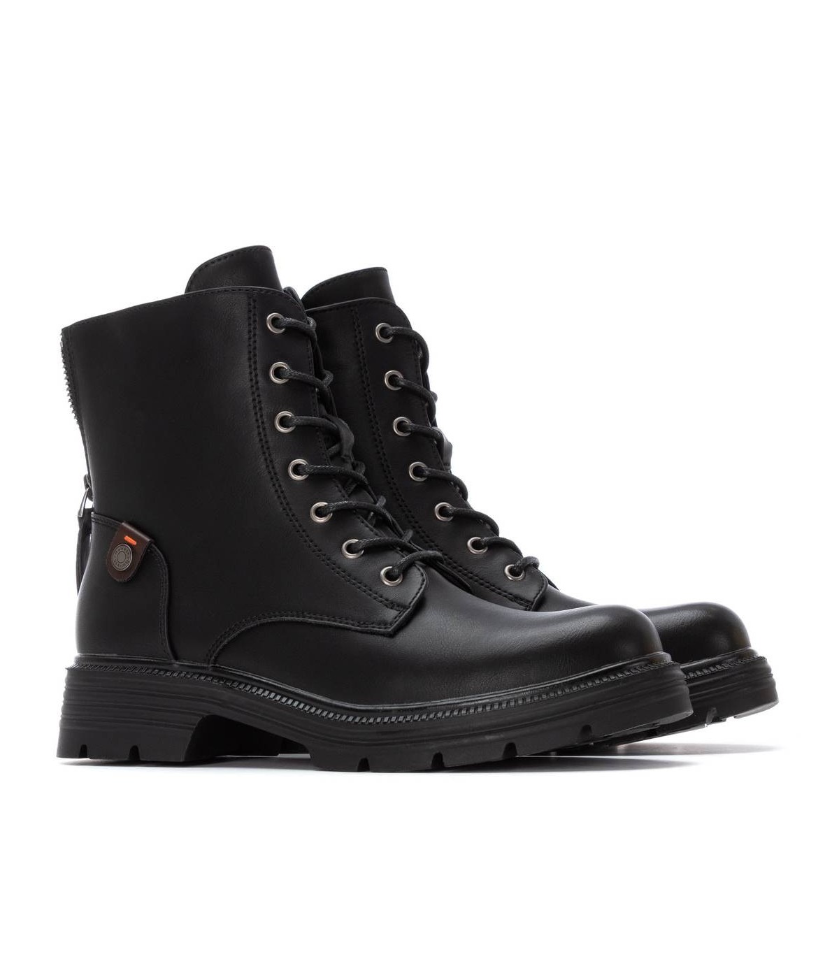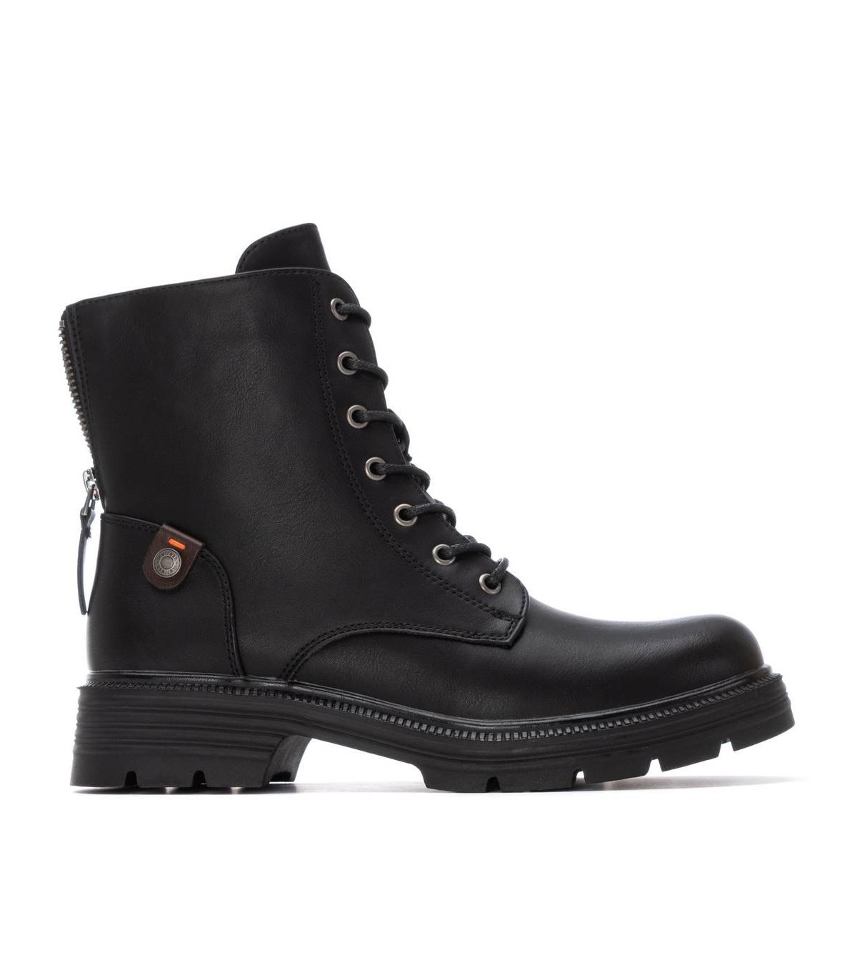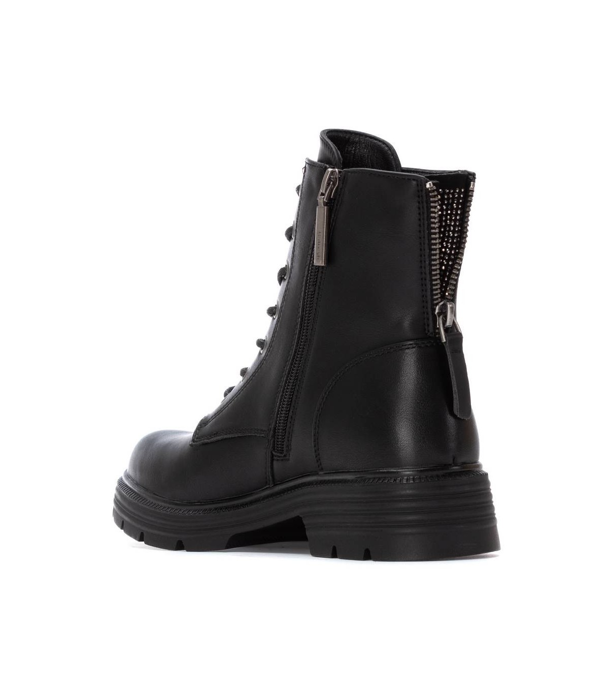 Botín de mujer, de la marca Refresh. Fabricado en material que imita a la piel. Cremallera trasera que deja ver detalle con piedras pequeñas decorativas. Cierre mediante cremallera interior. Cordones tubulares regulables. Gruesa suela de goma antideslizante. Con plantilla extraíble. Este modelo ha obtenido el certificado vegano por la organización mundial PETA (Organización de los derechos de los animales).