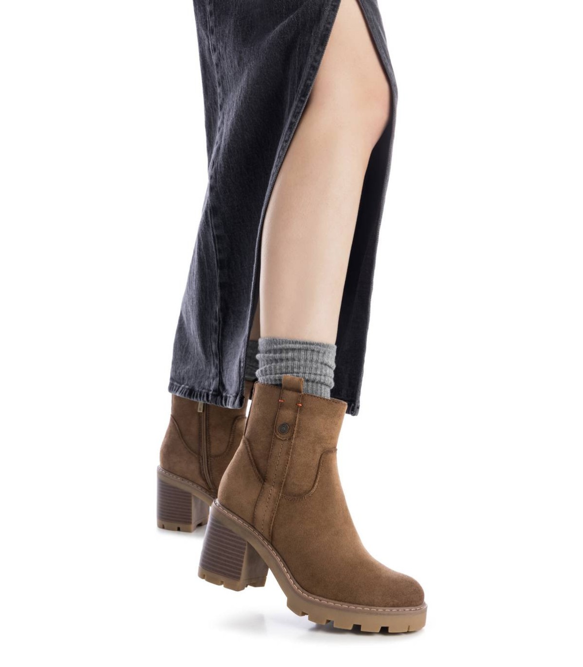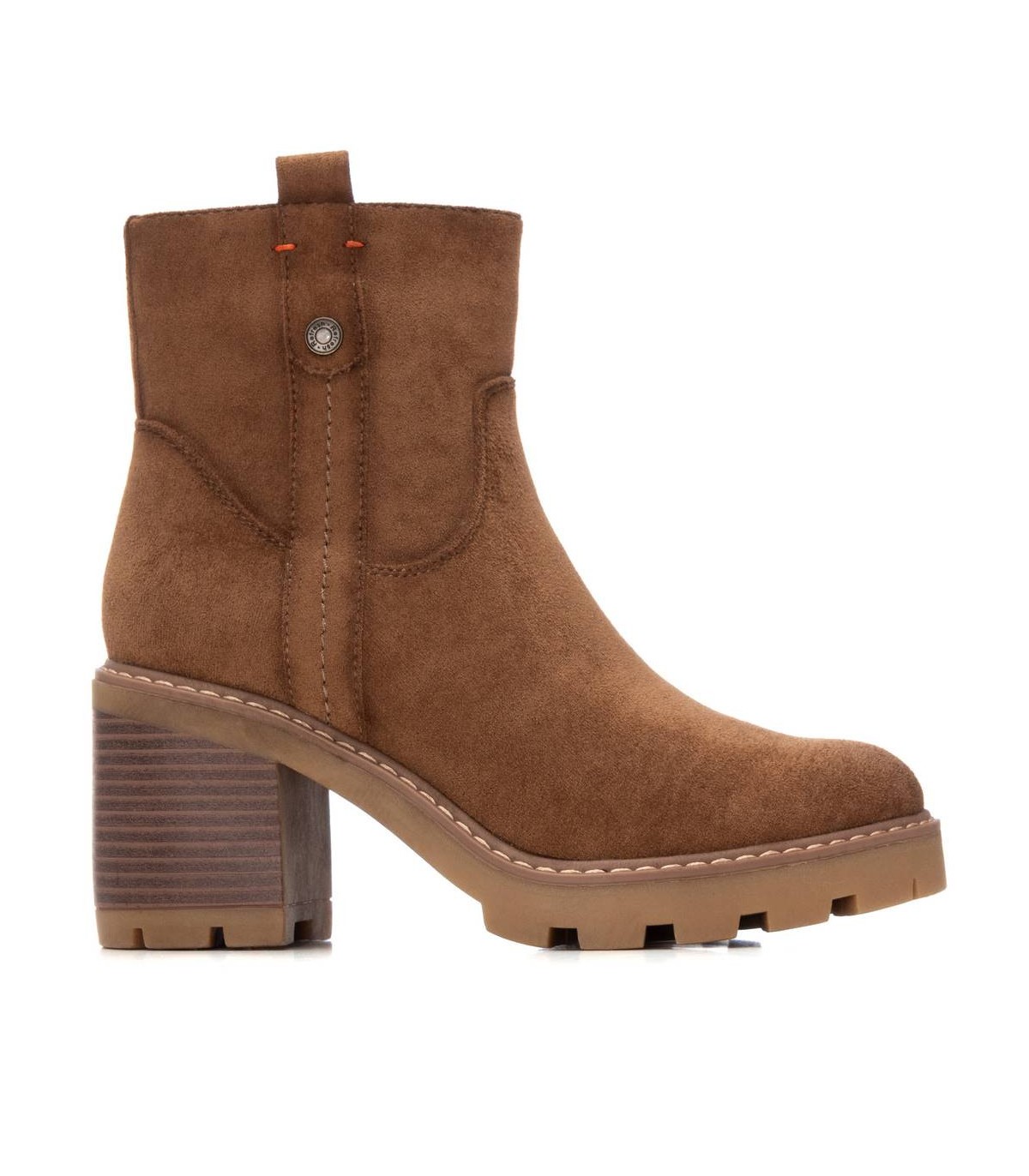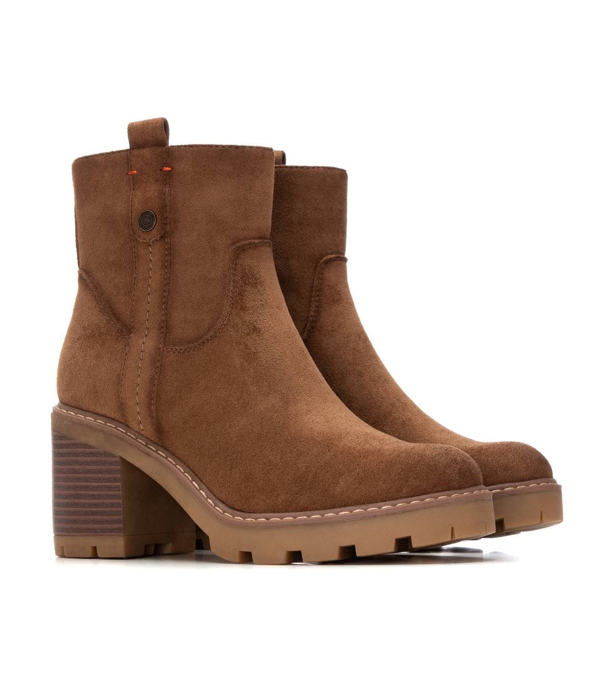 Botín de mujer, de la marca Refresh. Fabricado en suave antelina. Cierre mediante cremallera interior. Tirador lateral para ayudar a la puesta. Tacón de 8 cm de altura con suela de goma antideslizante. Este modelo ha obtenido el certificado vegano por la organización mundial PETA (Organización de los derechos de los animales).