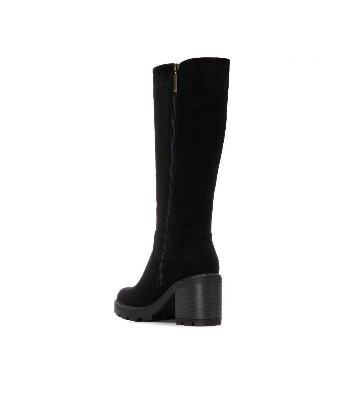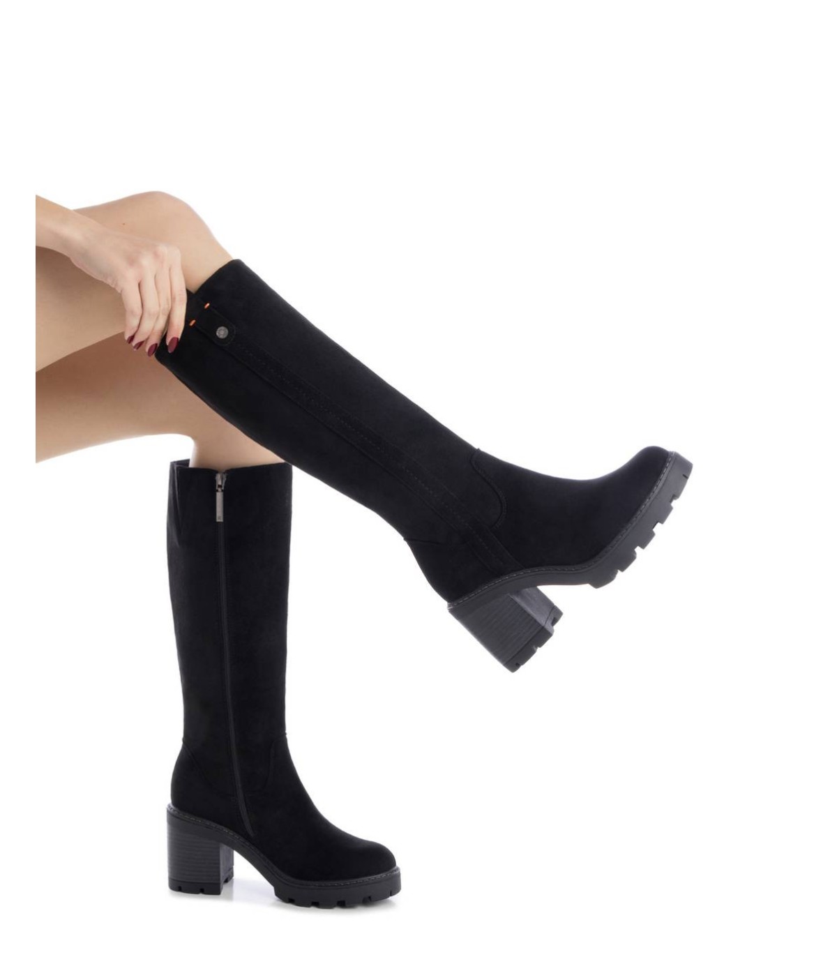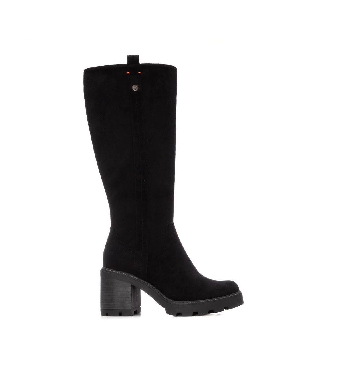 Bota de mujer, de la marca Refresh. Fabricada en suave antelina. Cierre mediante cremallera interior. Tirador lateral para facilitar la puesta. Caña de 36 cm de altura. Tacón de 8 cm de alto con suela de goma antideslizante. Este modelo ha obtenido el certificado vegano por la organización mundial PETA (Organización de los derechos de los animales).