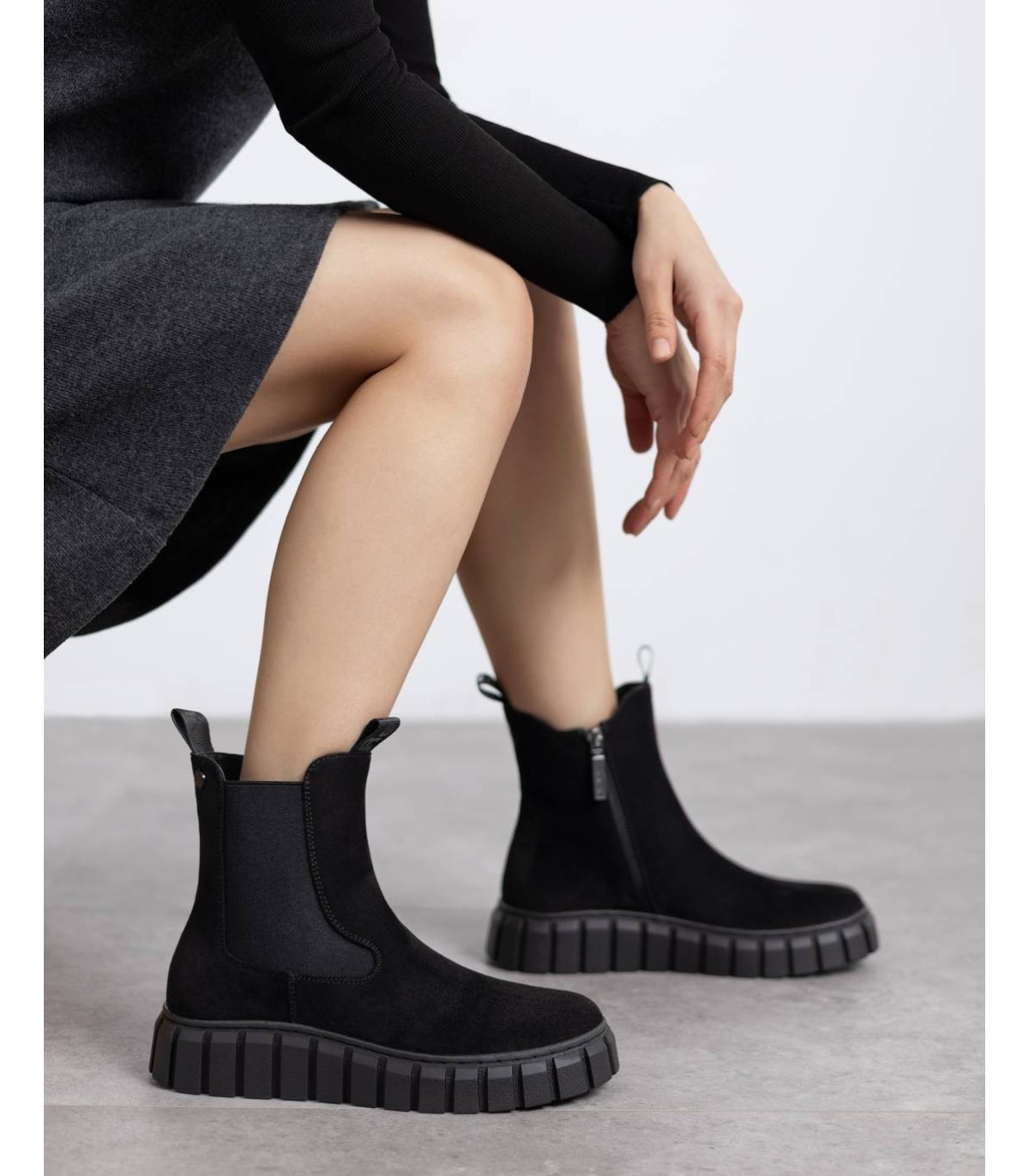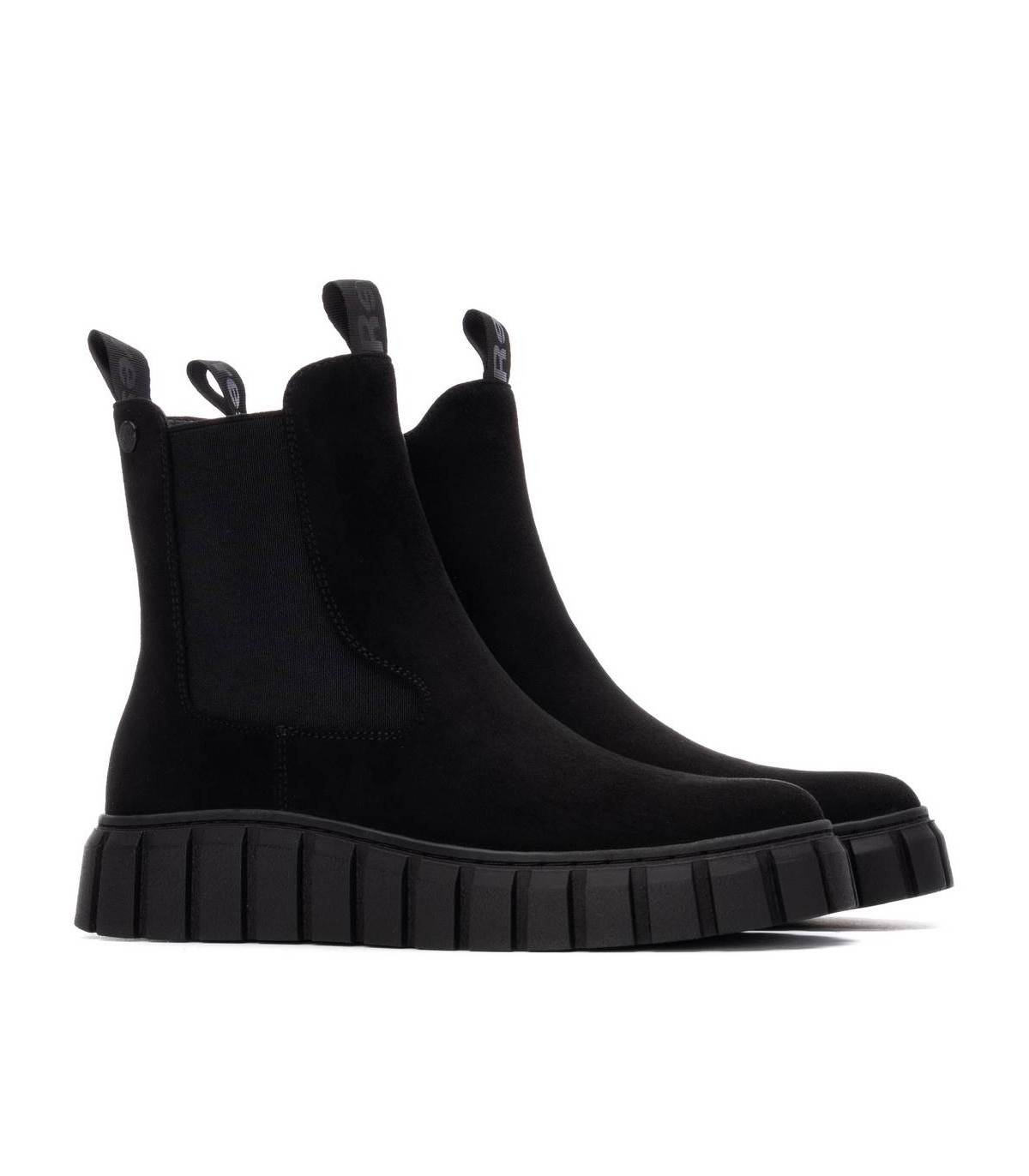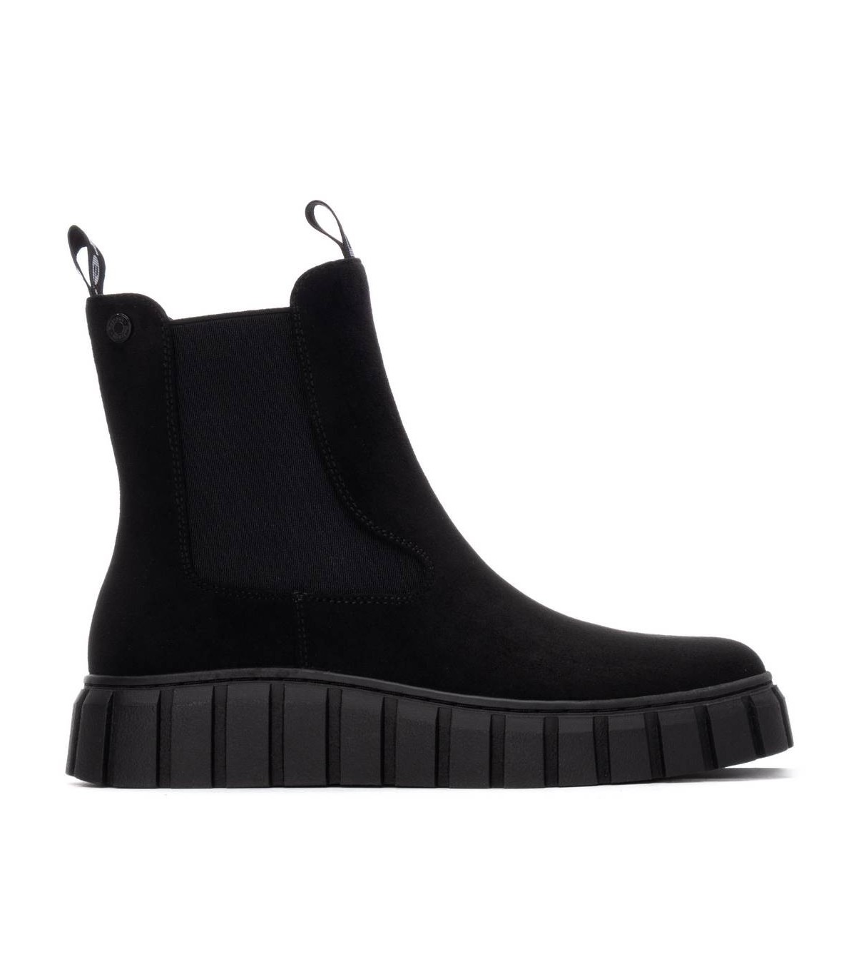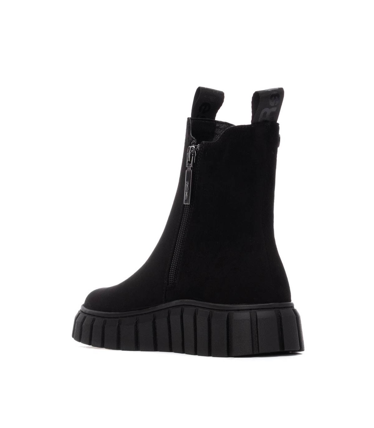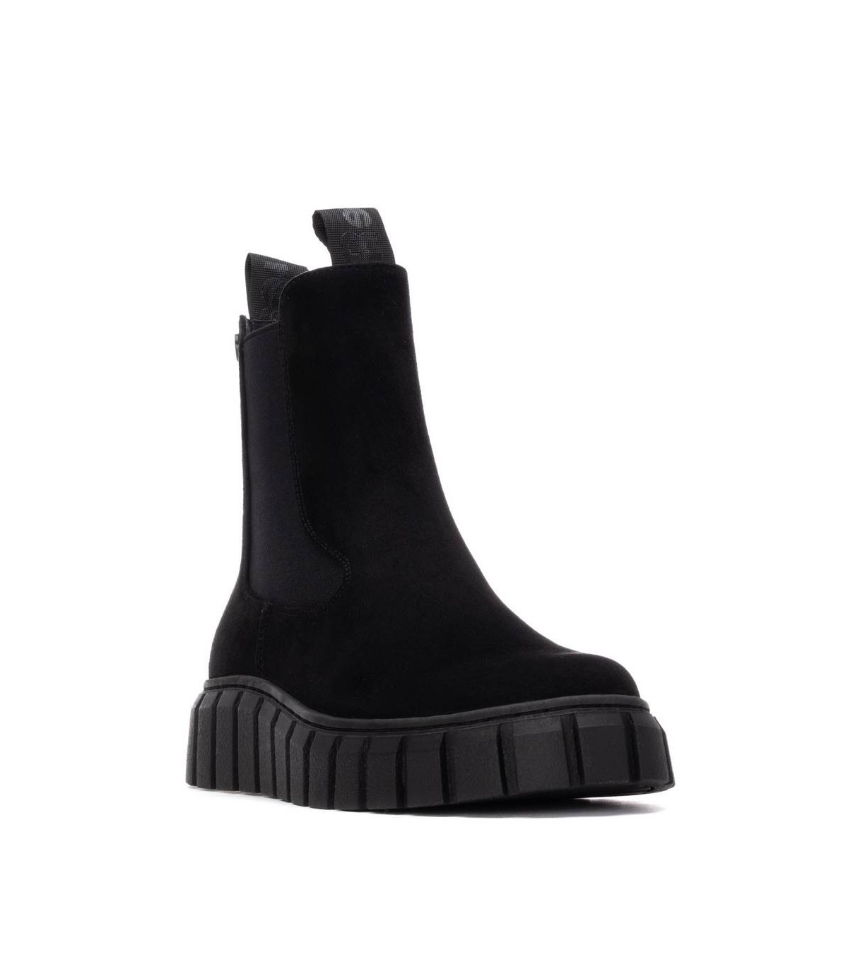 Botín de mujer, de la marca Refresh. Fabricado en suave antelina. Tirador delantero y trasero. Cierre mediante cremallera. Elástico en el lateral. Suela volumen de goma. Con plantilla extraíble. Este modelo ha obtenido el certificado vegano por la organización mundial PETA (Organización de los derechos de los animales).