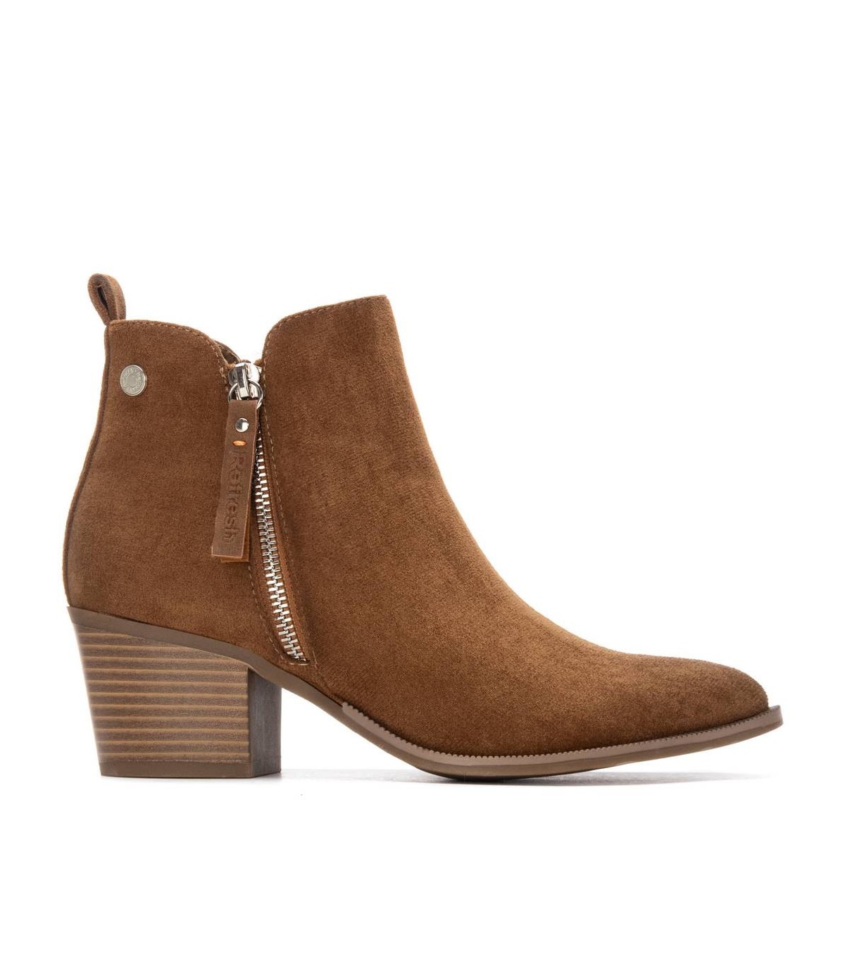 Botín de mujer, de la marca Refresh. Fabricado en suave antelina. Cremalleras laterales, exterior decorativa, interior con función. Tirador trasero para facilitar la puesta. Este modelo ha obtenido el certificado vegano por la organización mundial PETA (Organización de los derechos de los animales).