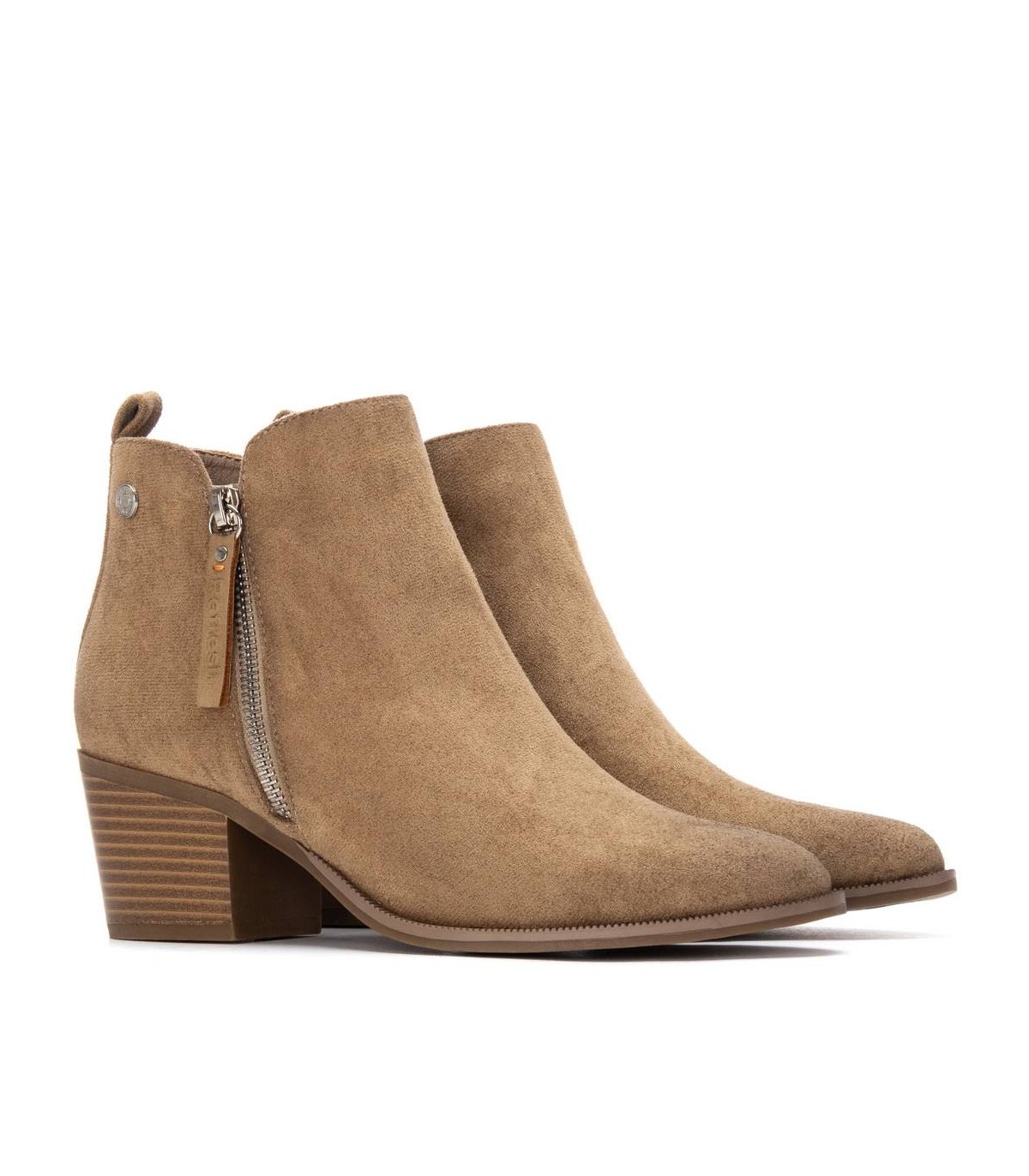 Botín de mujer, de la marca Refresh. Fabricado en suave antelina. Cremalleras laterales, exterior decorativa, interior con función. Tirador trasero para facilitar la puesta. Este modelo ha obtenido el certificado vegano por la organización mundial PETA (Organización de los derechos de los animales).