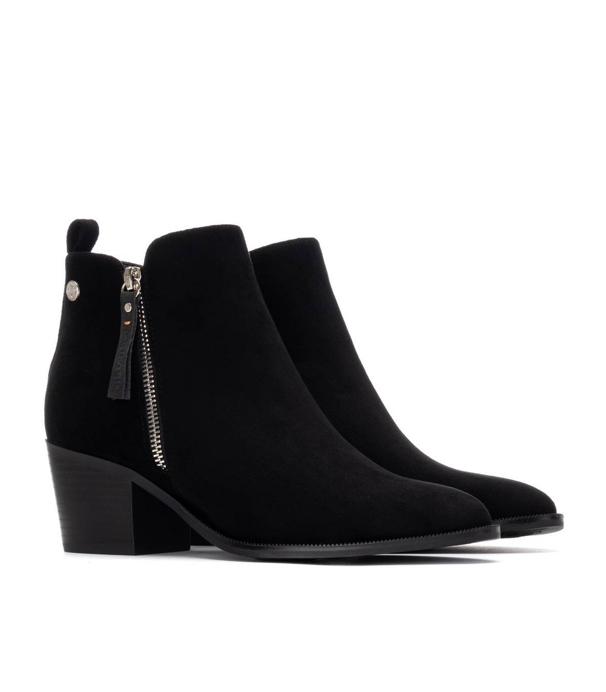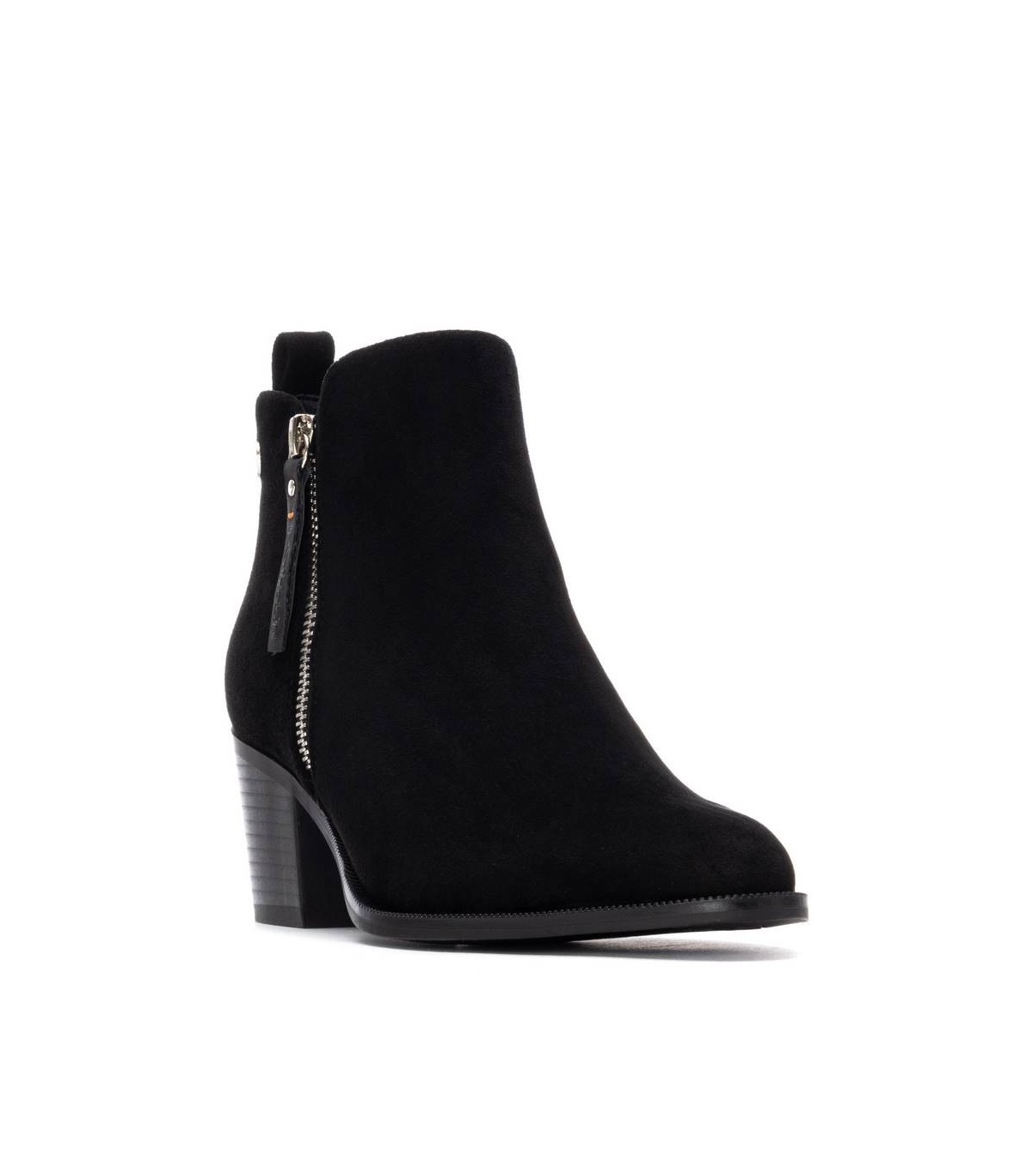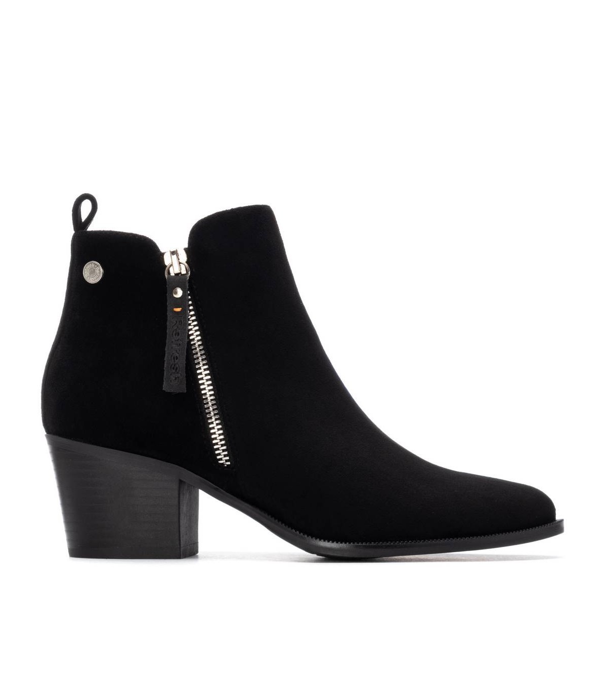 Botín de mujer, de la marca Refresh. Fabricado en suave antelina. Cremalleras laterales, exterior decorativa, interior con función. Tirador trasero para facilitar la puesta. Este modelo ha obtenido el certificado vegano por la organización mundial PETA (Organización de los derechos de los animales).