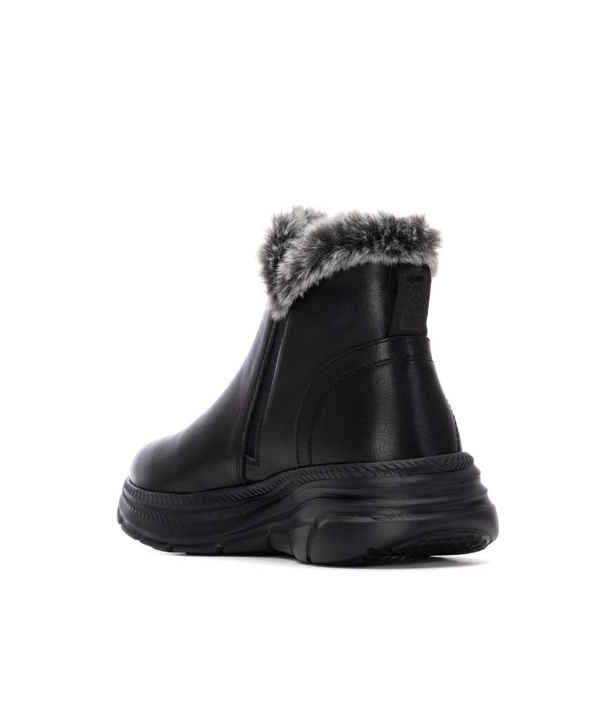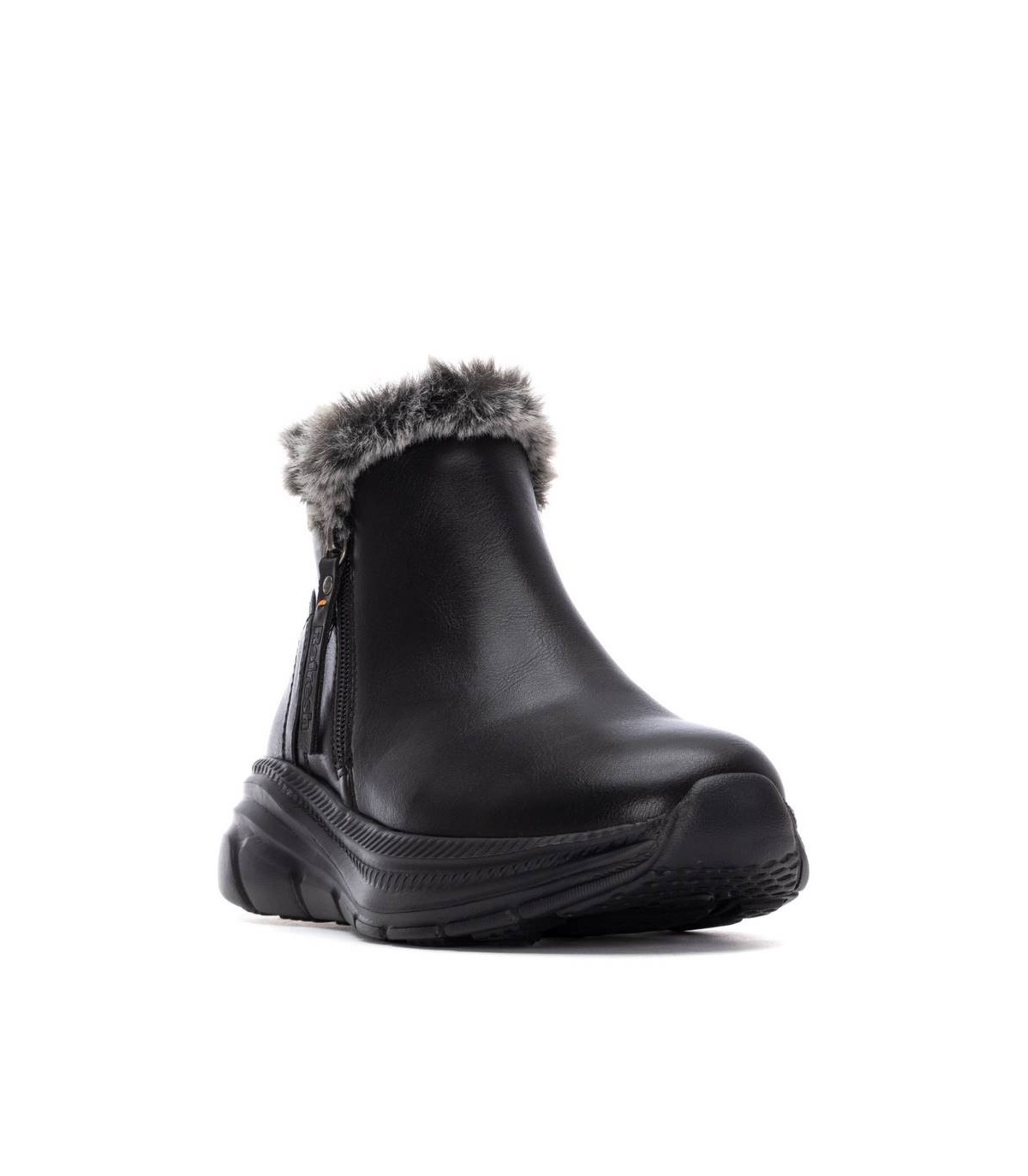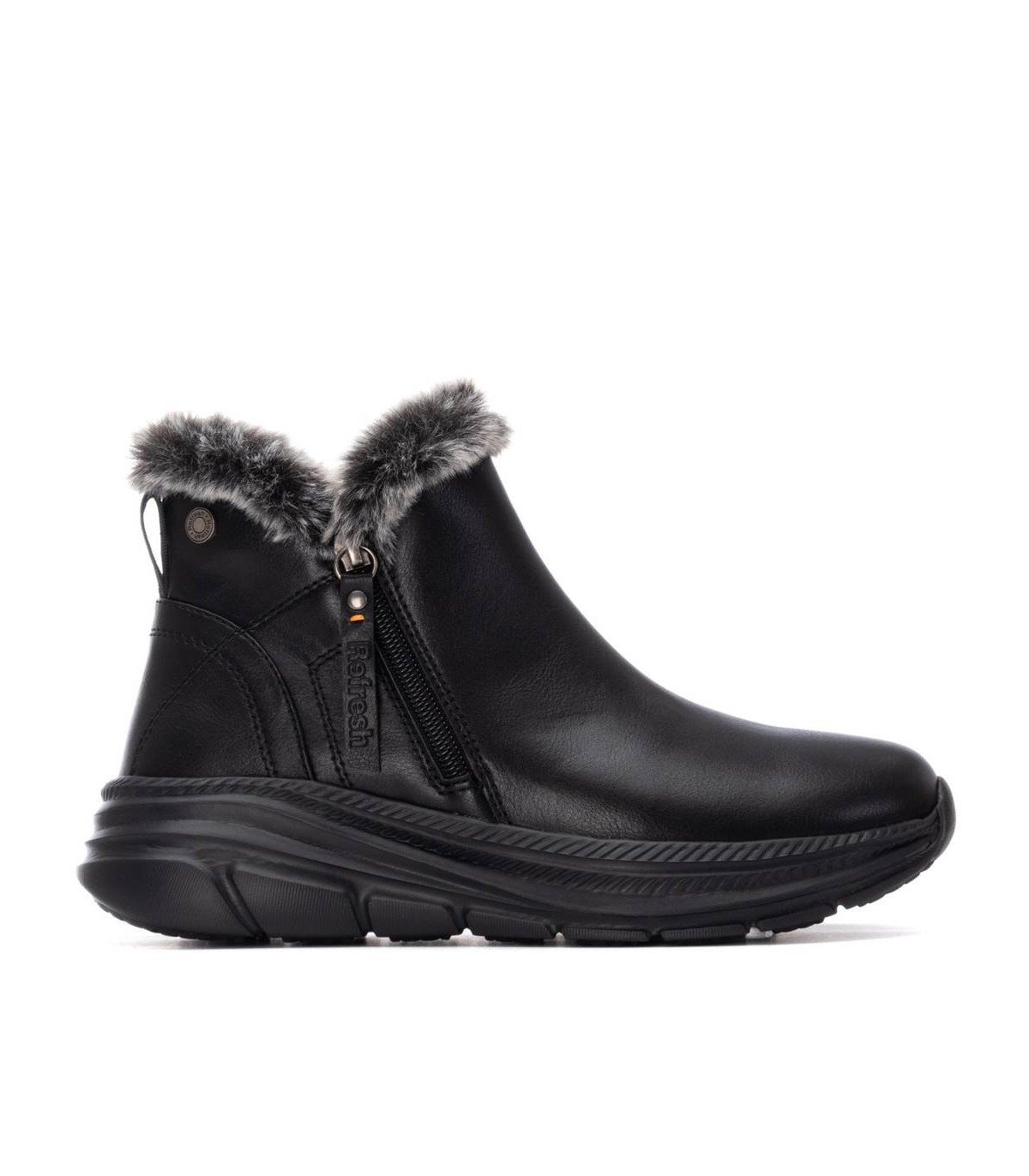 Botín tipo zapatilla con cremallera lateral. Marca Refresh. Fabricado en material que imita a la piel con pelito en parte superior. Tirador trasero. Cierre mediante cremallera interior. Alto de caña: 10 cm. Gruesa suela de goma antideslizante. Con plantilla extraíble. Este modelo ha obtenido el certificado vegano por la organización mundial PETA (Organización de los derechos de los animales).