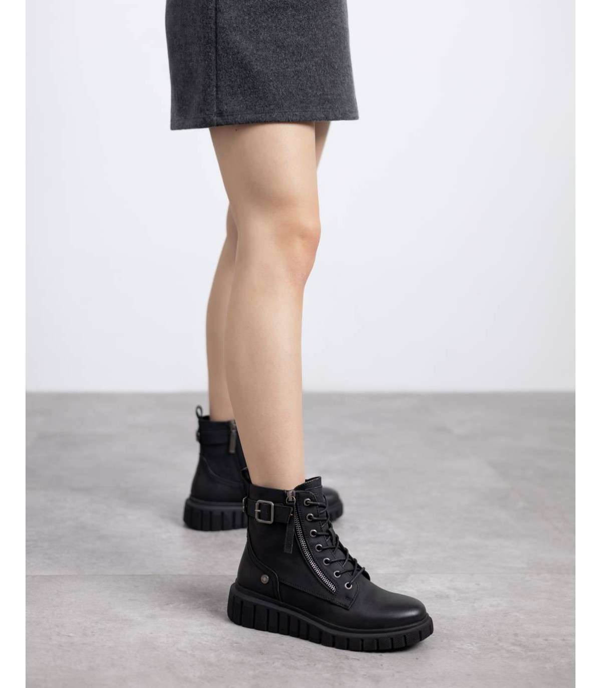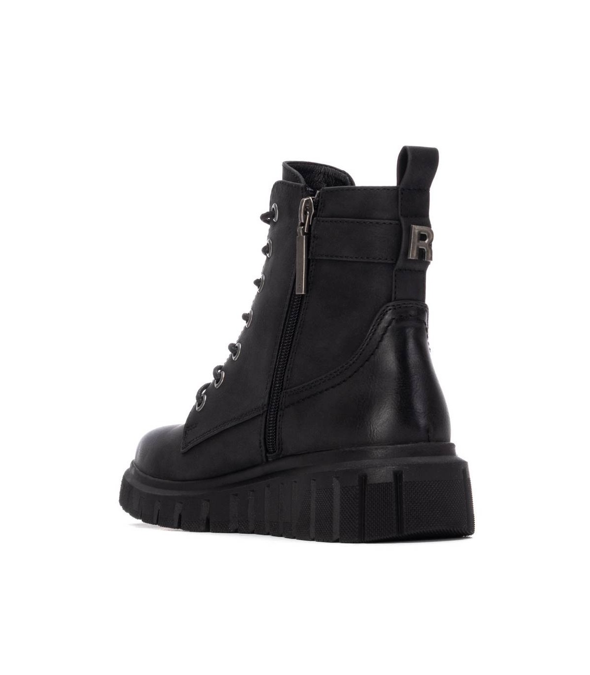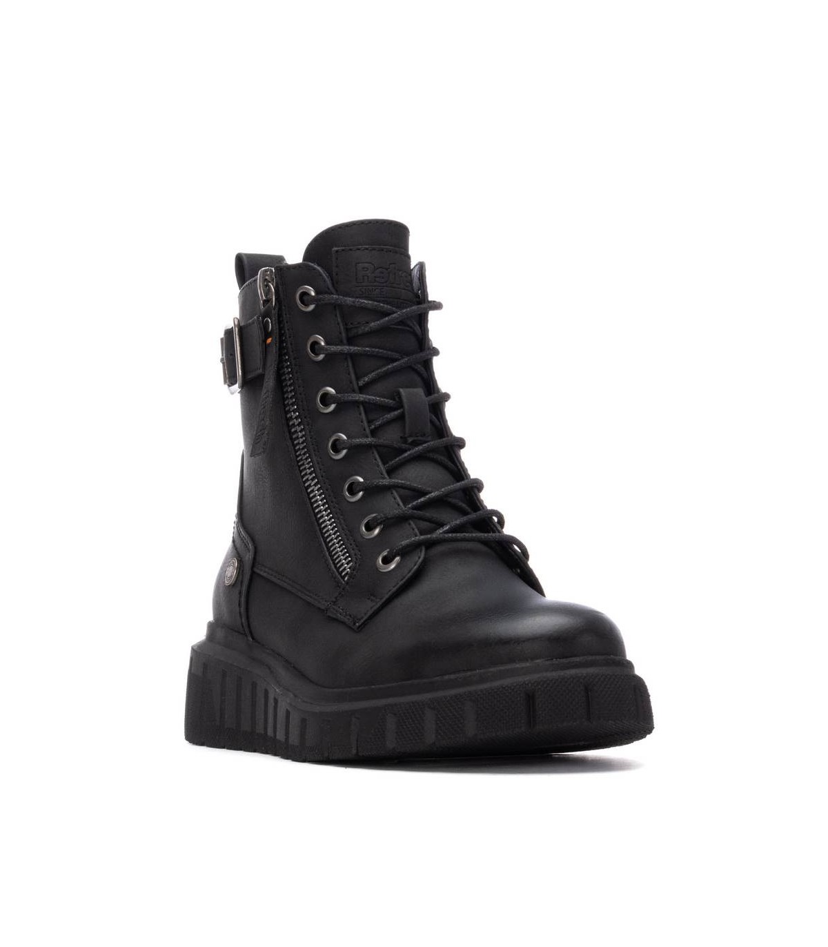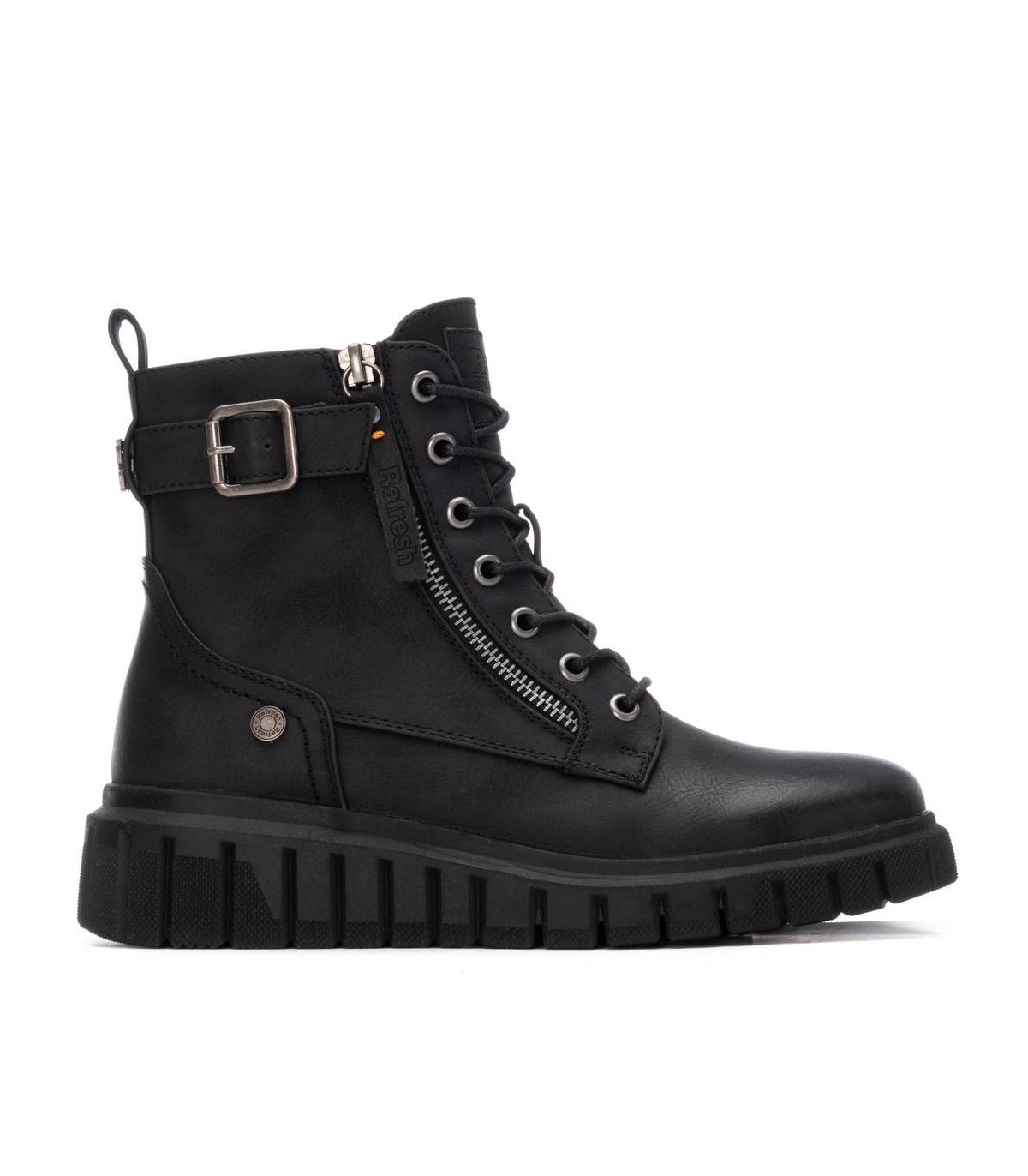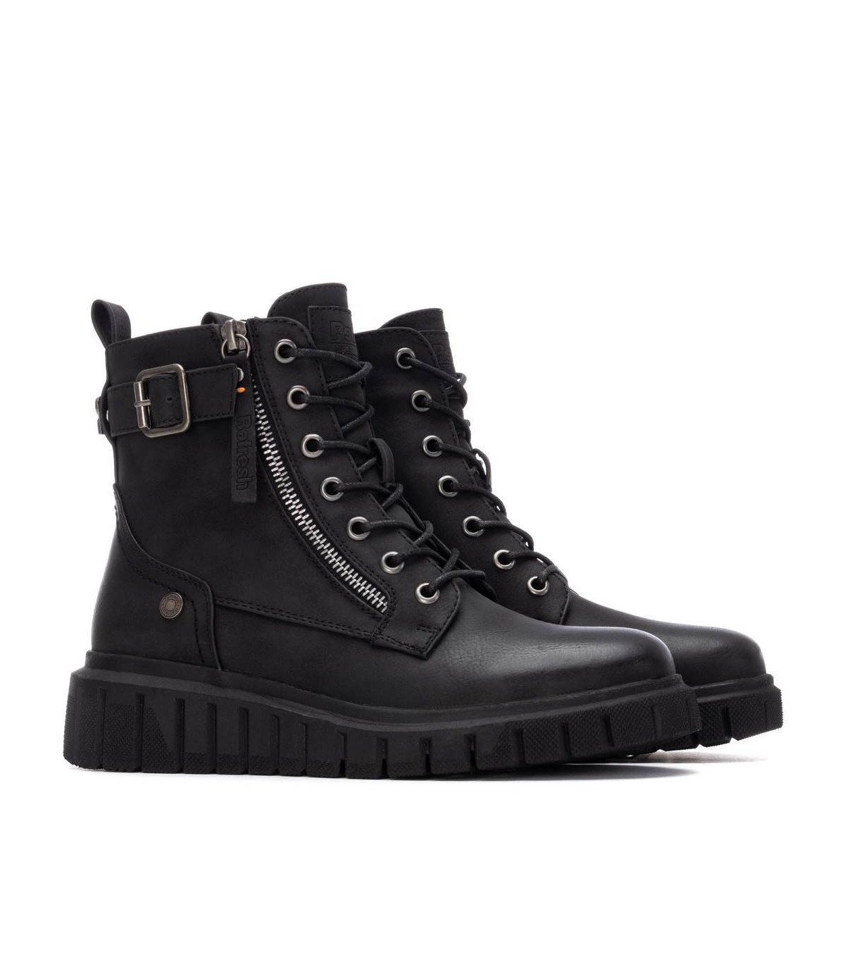 Botín de mujer, de la marca Refresh. Fabricado en material que imita a la piel. Cierre mediante cremallera interna. Cordones regulables. Cremallera lateral decorativa. Tira con correa lateral decorativa. Tirador trasero para facilitar la puesta. Suela volumen rayada de goma antideslizante. Con plantilla extraíble. Este modelo ha obtenido el certificado vegano por la organización mundial PETA (Organización de los derechos de los animales).