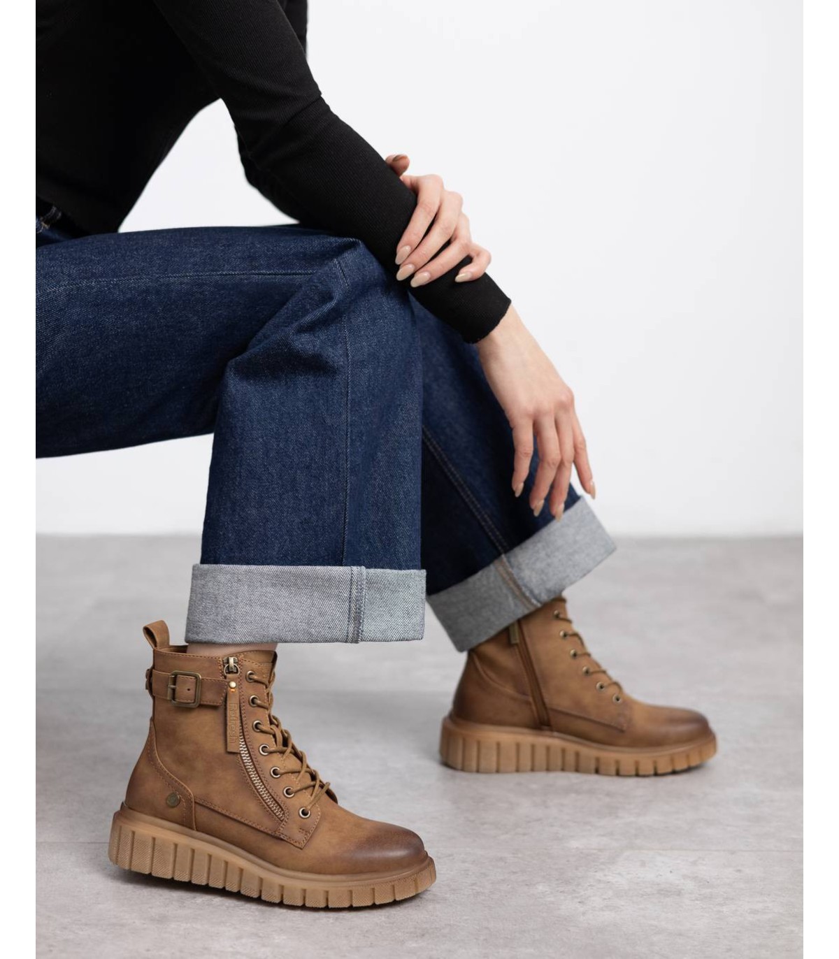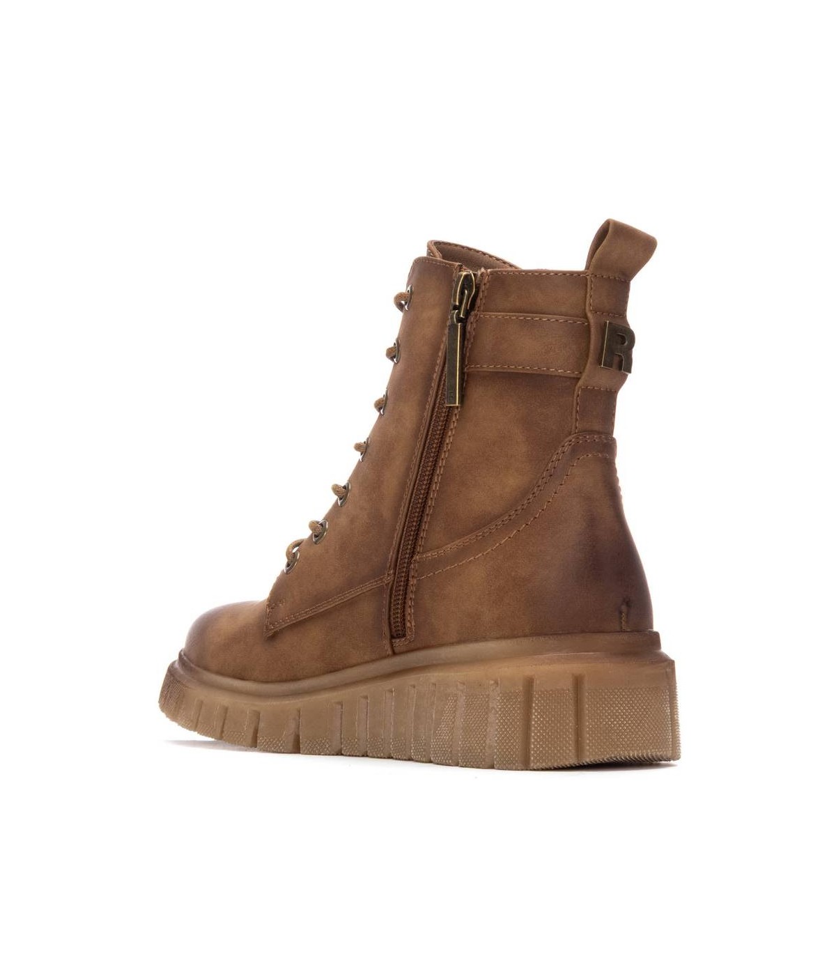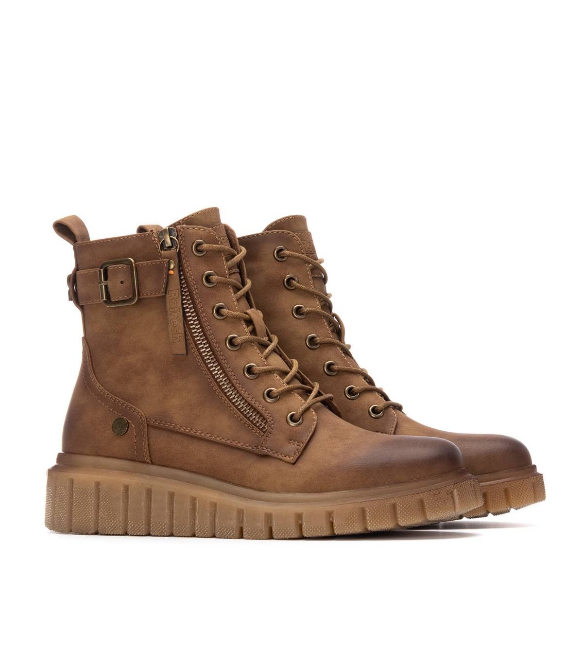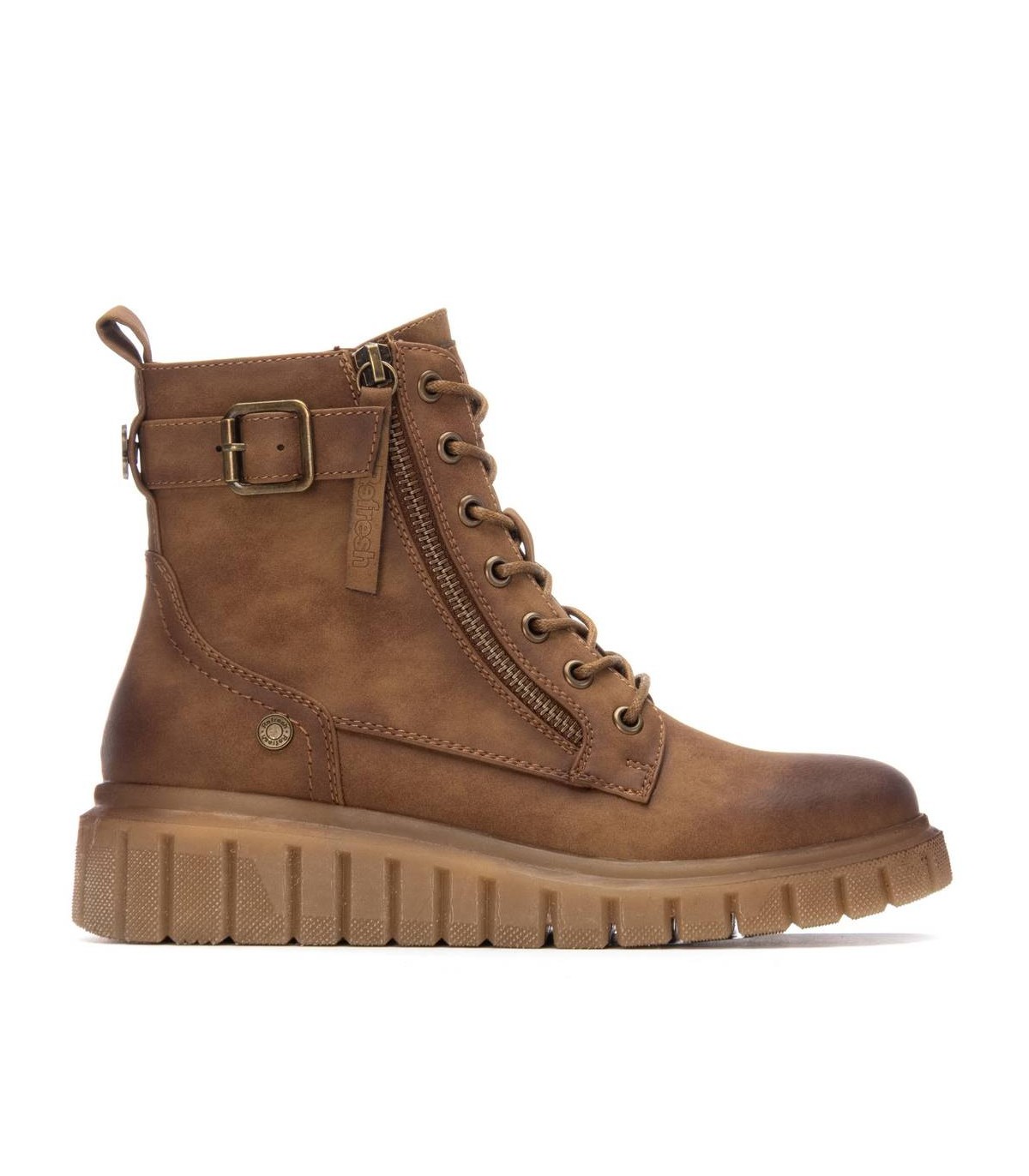 Botín de mujer, de la marca Refresh. Fabricado en material que imita a la piel. Cierre mediante cremallera interna. Cordones regulables. Cremallera lateral decorativa. Tira con correa lateral decorativa. Tirador trasero para facilitar la puesta. Suela volumen rayada de goma antideslizante. Con plantilla extraíble. Este modelo ha obtenido el certificado vegano por la organización mundial PETA (Organización de los derechos de los animales).