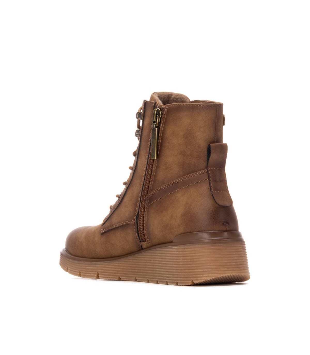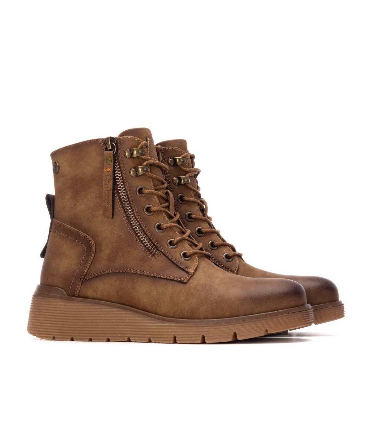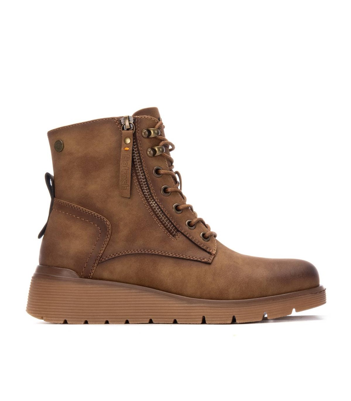 Botín de mujer, de la marca Refresh. Fabricada en material que imita a la piel. Cierre mediante cremallera interior. Cordones regulables encerados. Cremallera lateral decorativa. Suela volumen en forma de cuña baja, ideal para completar los mejores looks del día a día. Con plantilla extraíble. Este modelo ha obtenido el certificado vegano por la organización mundial PETA (Organización de los derechos de los animales).