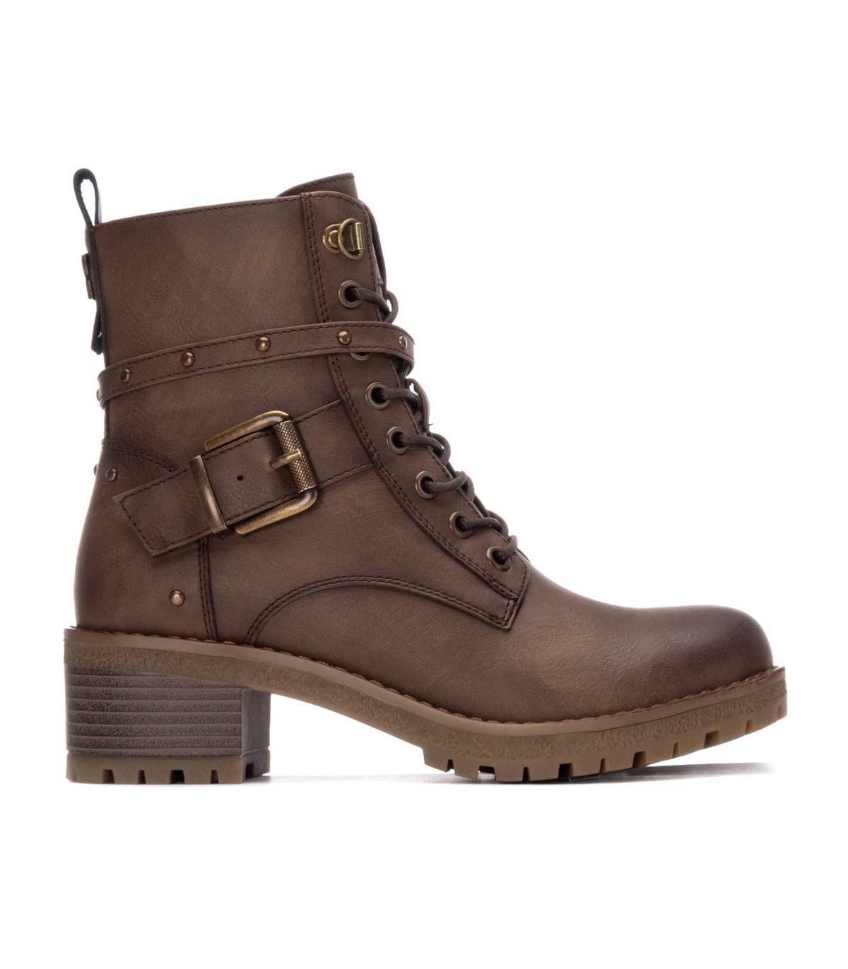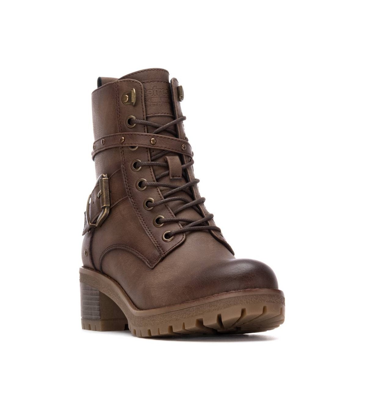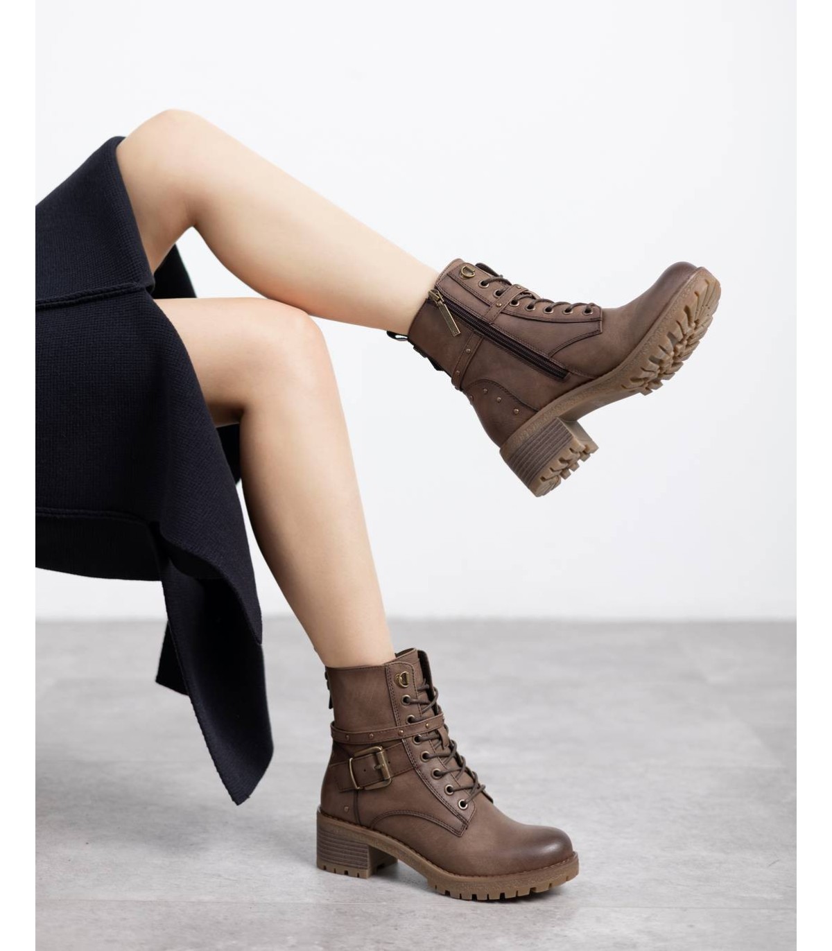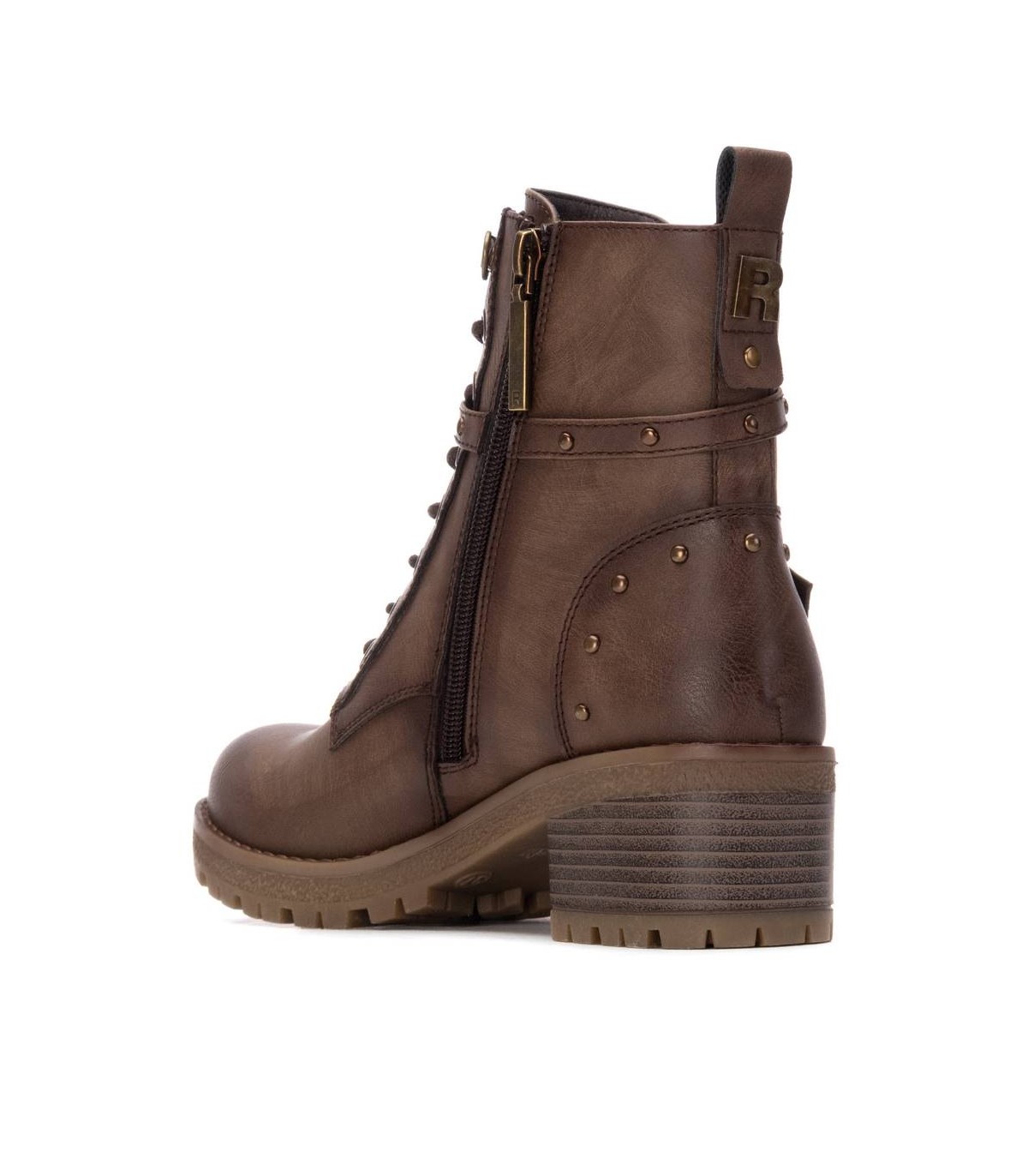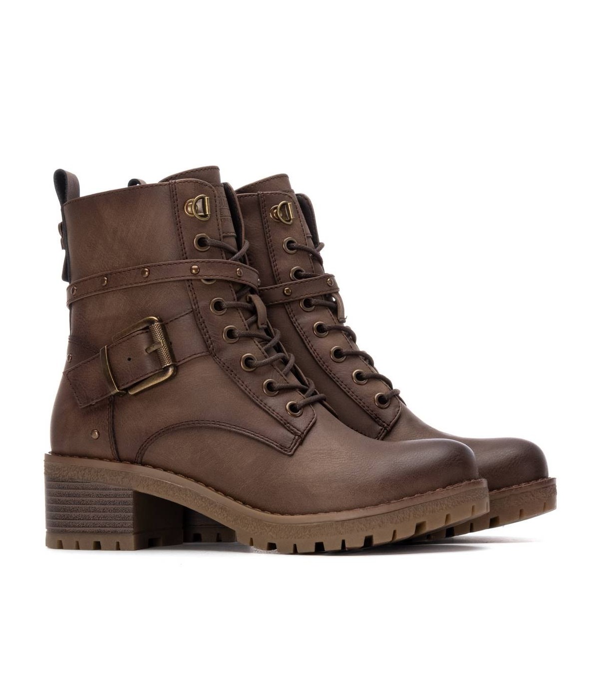 Botín de mujer, de la marca Refresh. Fabricada en material que imita a la piel. Cierre mediante cremallera lateral. Cordones regulables. Correas decorativas al tobillo. Tacón de 5 cm de altura. Suela de goma antideslizante. Con plantilla extraíble. Este modelo ha obtenido el certificado vegano por la organización mundial PETA (Organización de los derechos de los animales).