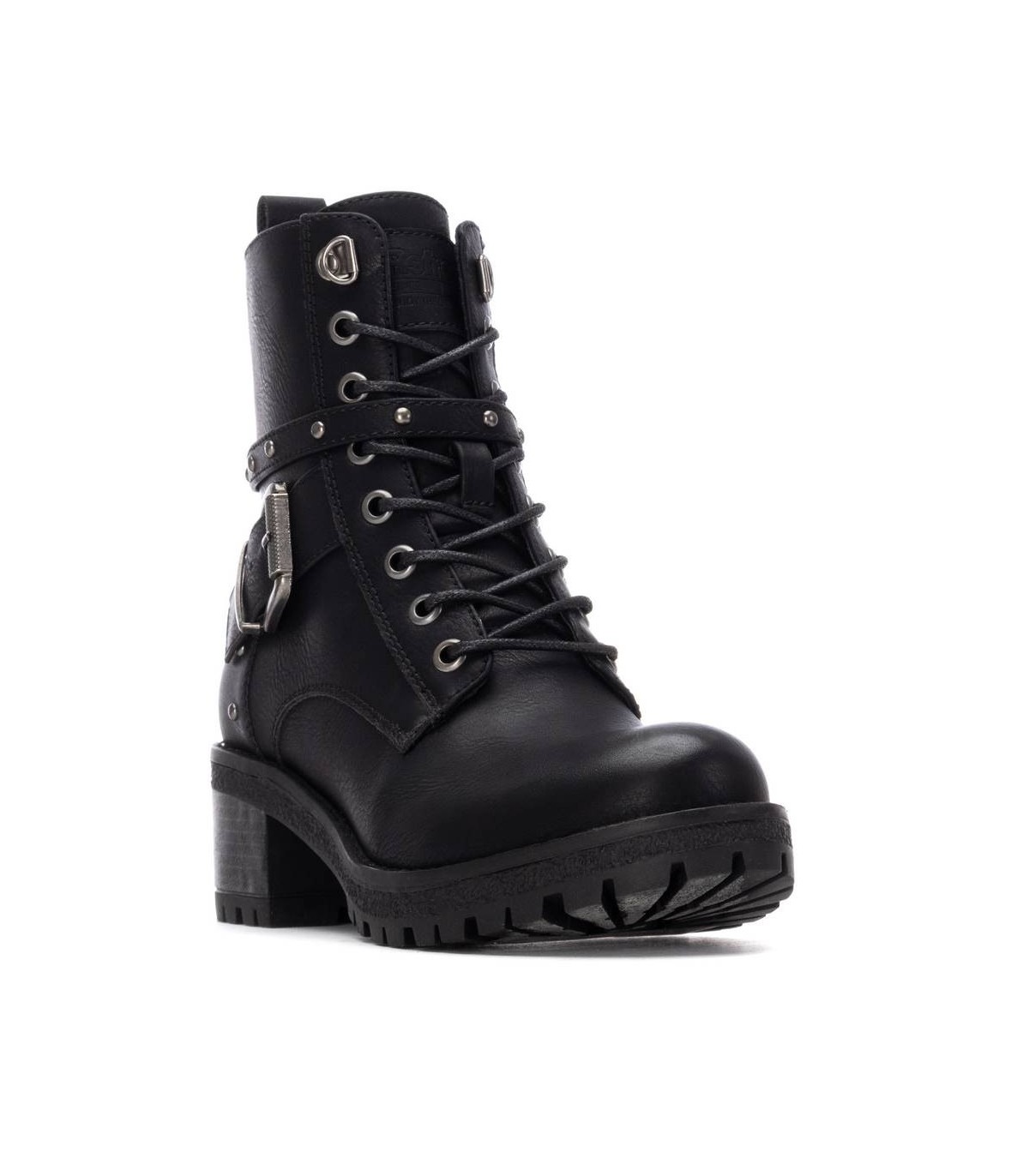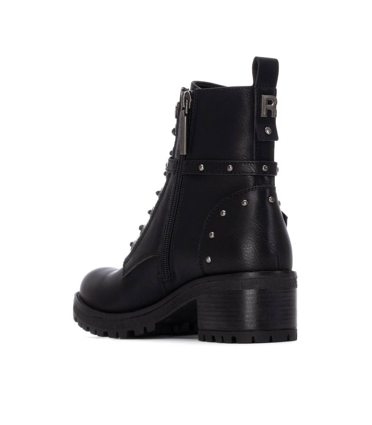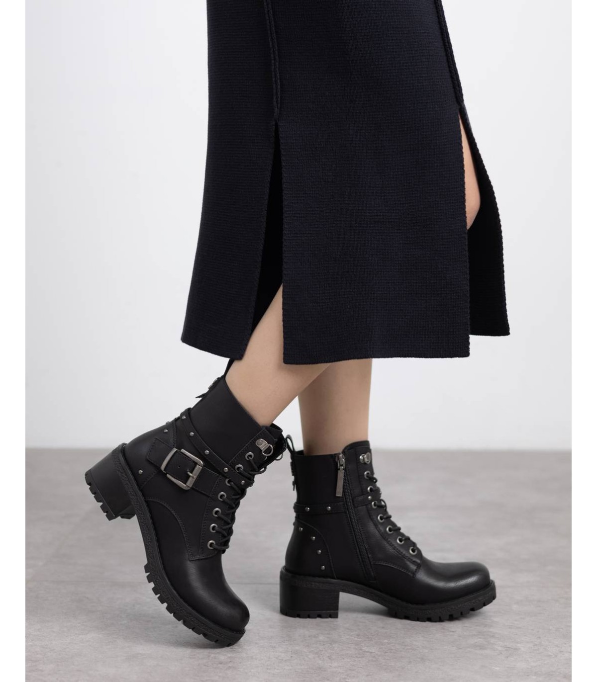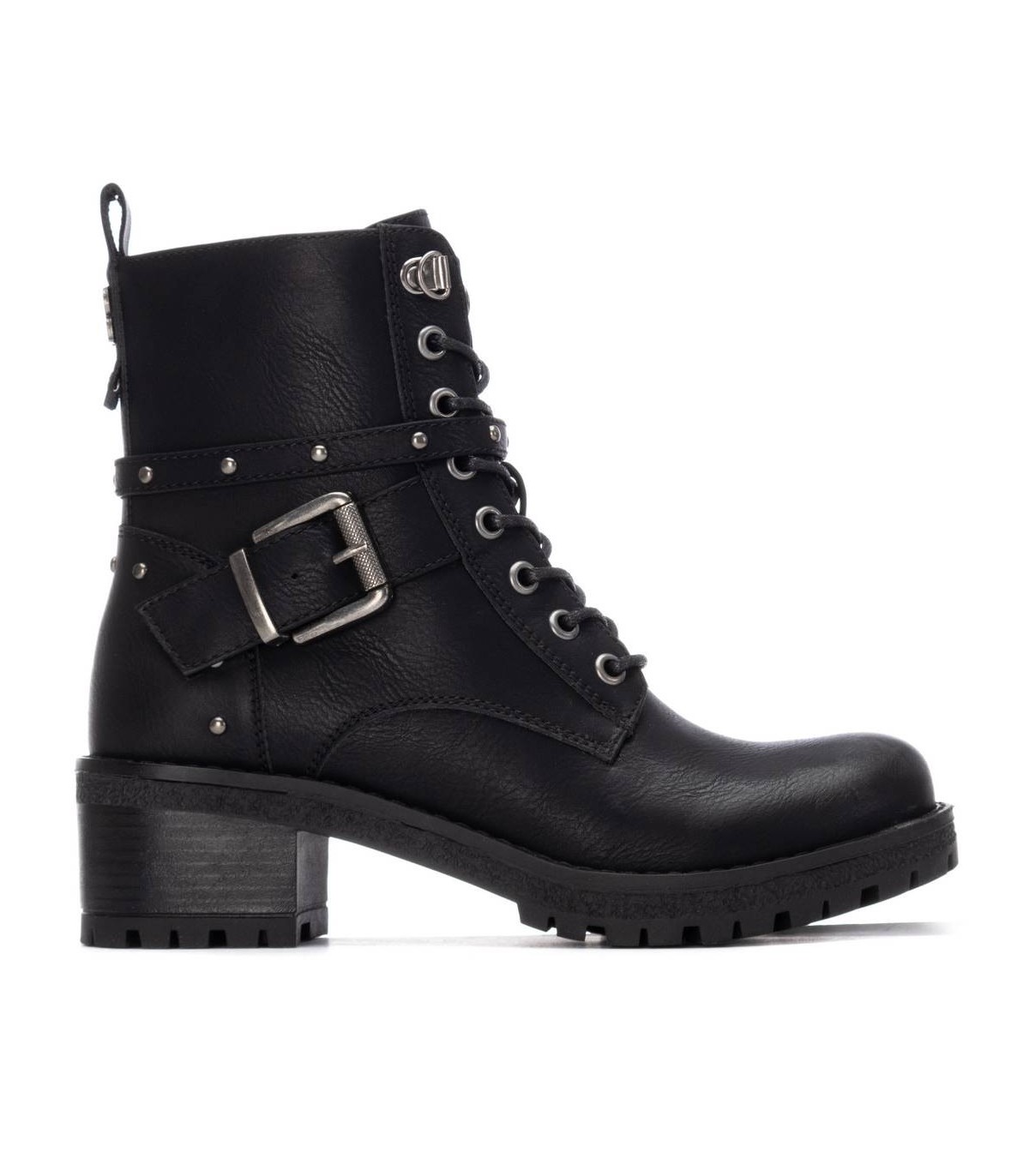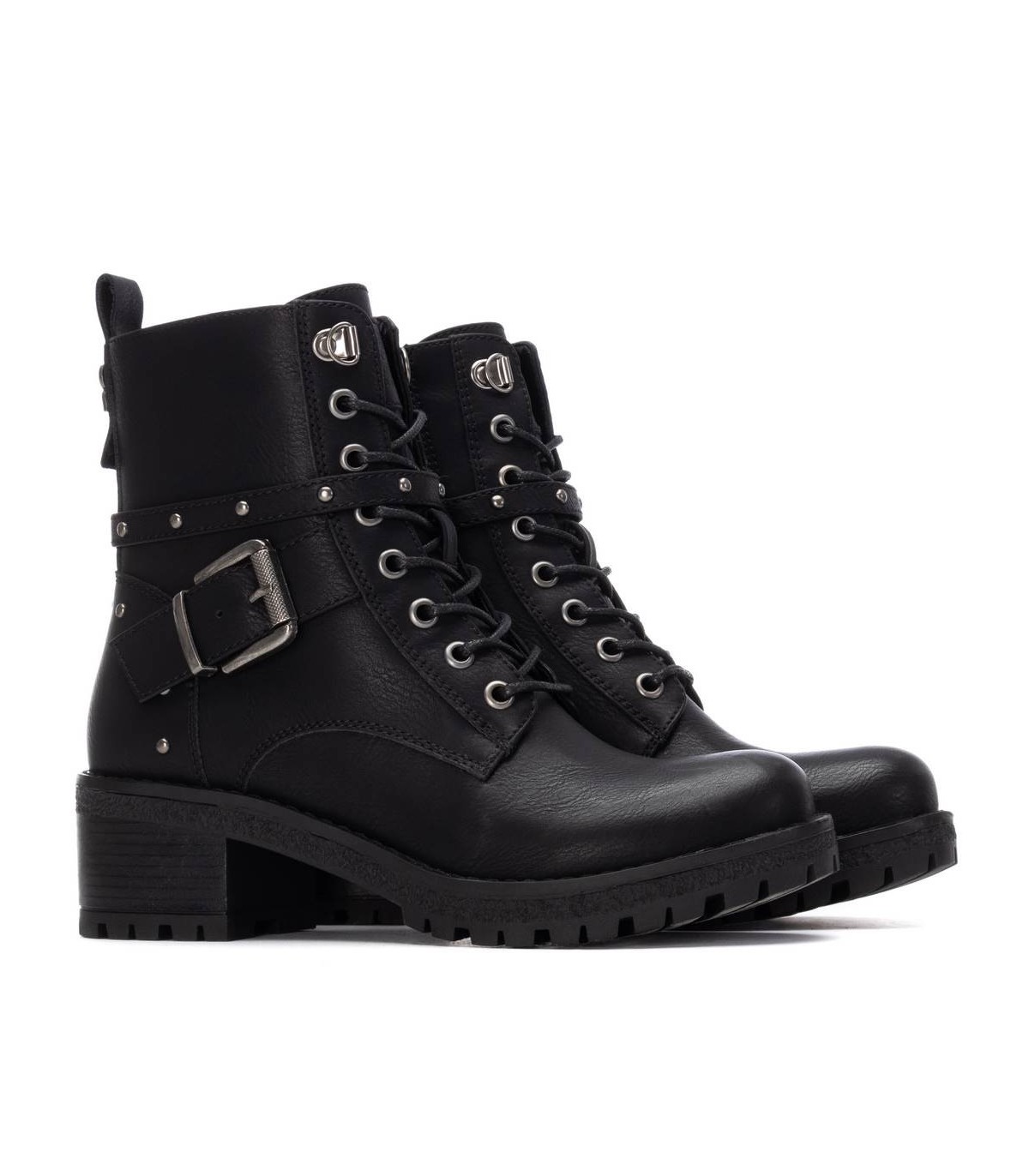 Botín de mujer, de la marca Refresh. Fabricada en material que imita a la piel. Cierre mediante cremallera lateral. Cordones regulables. Correas decorativas al tobillo. Tacón de 5 cm de altura. Suela de goma antideslizante. Con plantilla extraíble. Este modelo ha obtenido el certificado vegano por la organización mundial PETA (Organización de los derechos de los animales).
